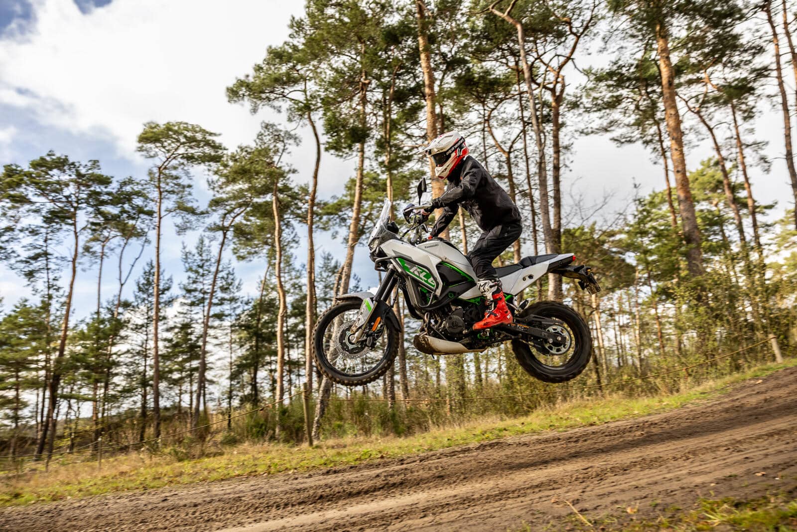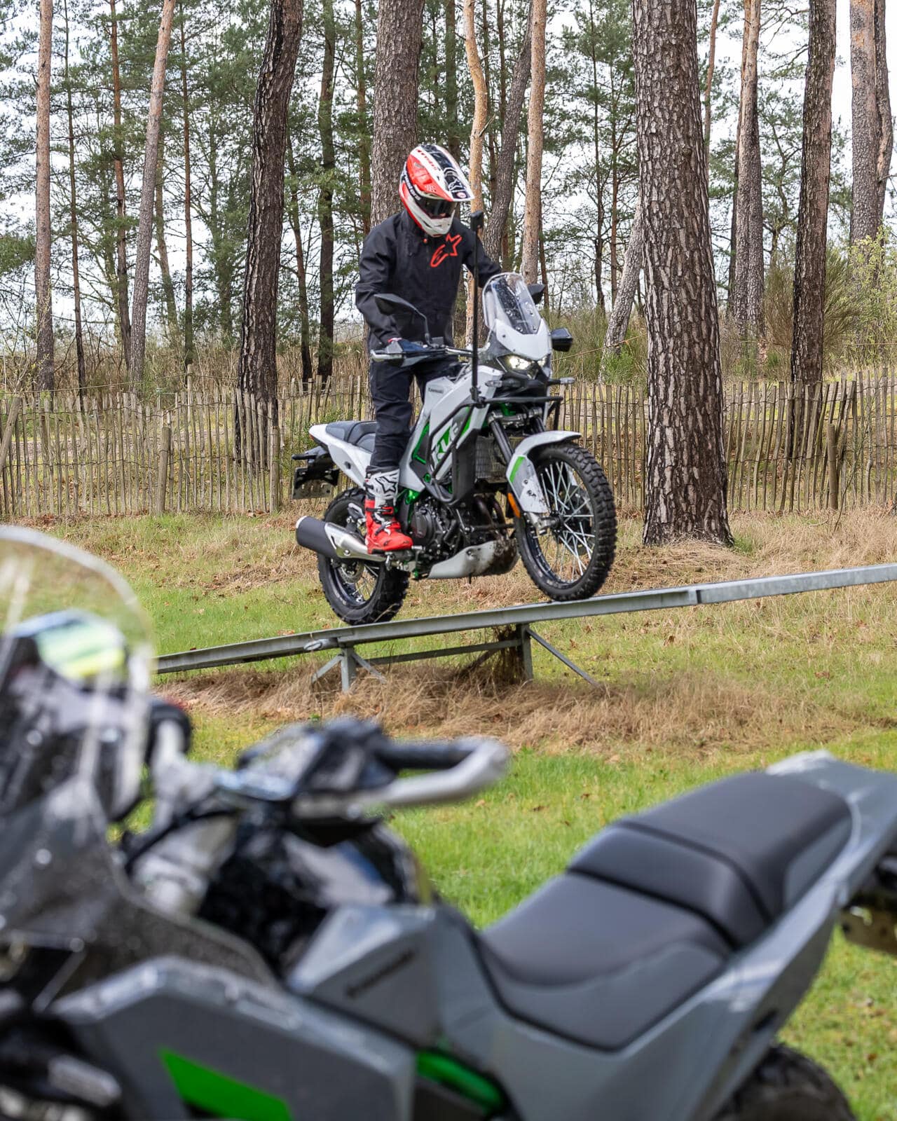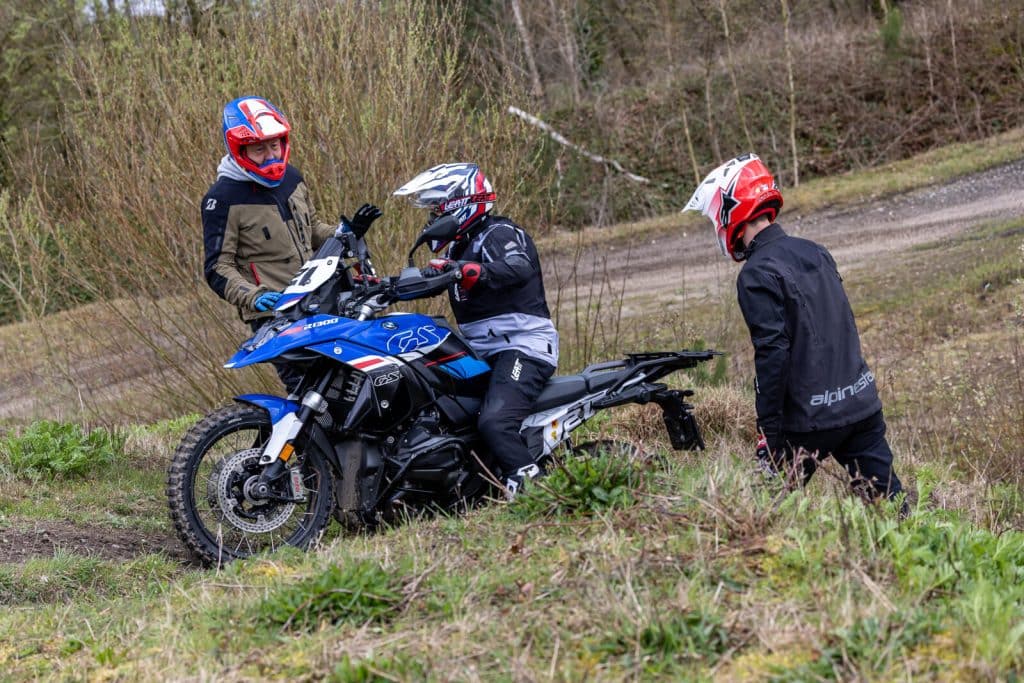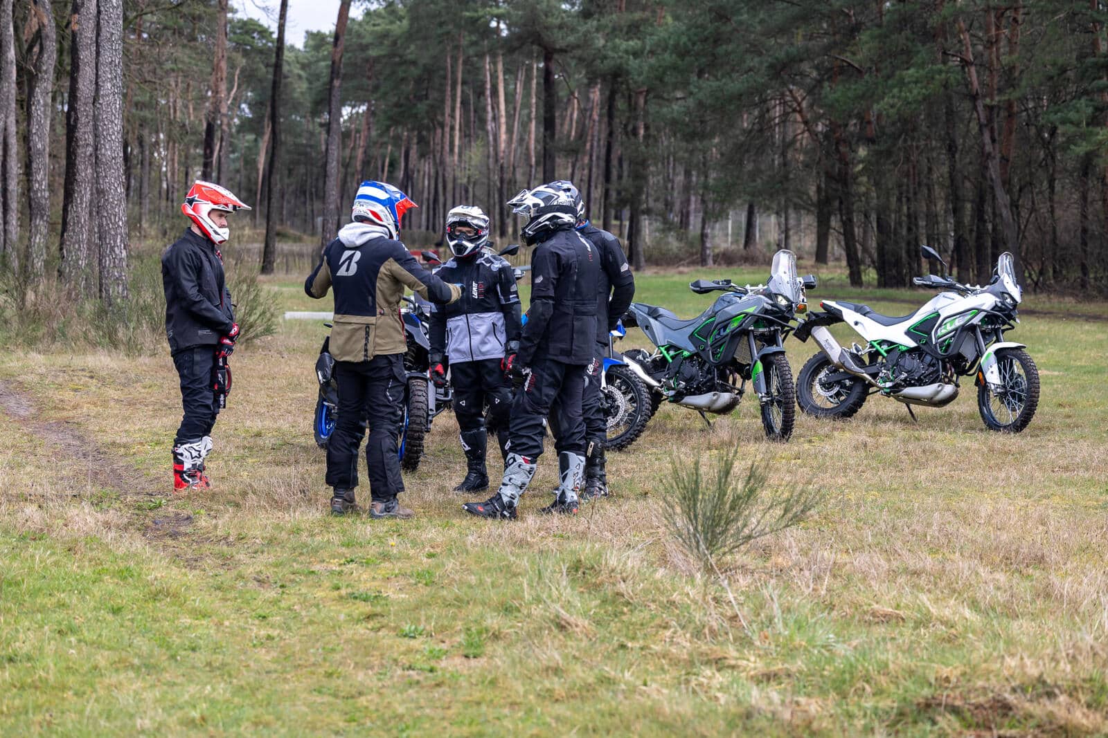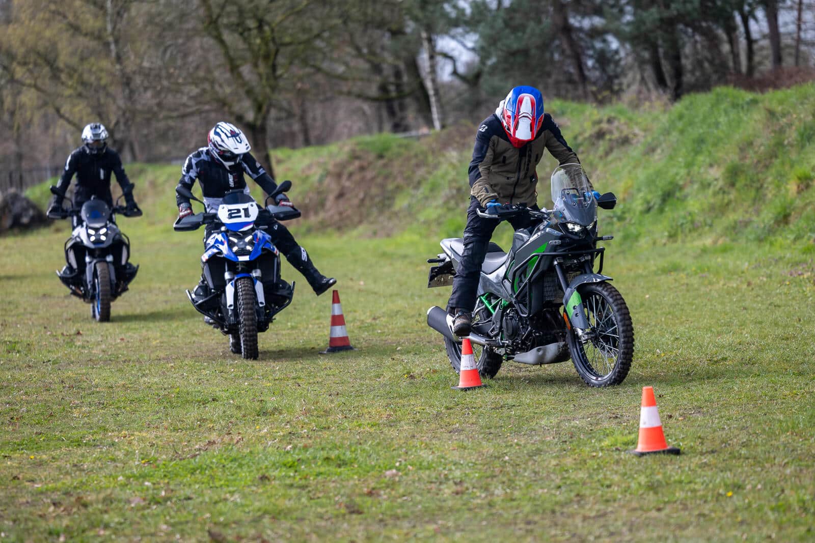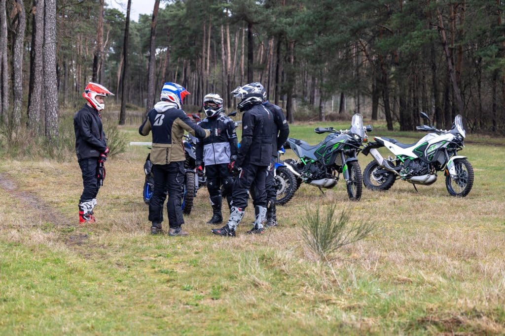 Uiteindelijk gaat het drietal aan de slag op zo’n kenmerkende voorjaarsdag van de Lage Landen. Gure wind, zo nu en dan een hagelbui en een temperatuur lager dan die van het hart van je ex. Of ze niet liever op een andere dag willen terugkeren? ‘Geen sprake van!’ protesteert Nick. Nick én zijn twee kompanen hebben een schaatsachtergrond. Die zijn dus wel wat kou gewend. ‘De omstandigheden zijn wat ze zijn. Ik vind het zelfs wel wat hebben, die uitdagende omstandigheden. Als we verder willen in het adventure rijden, mag wat regen ons niet afschrikken.’ En dus gaan ze van start. Eerst met een uitleg over de basistechnieken en ook over de Kawasaki KLE500. De BMW’s kennen ze al, de KLE is onbekend. Maar niet lang onbemind, blijkt later.