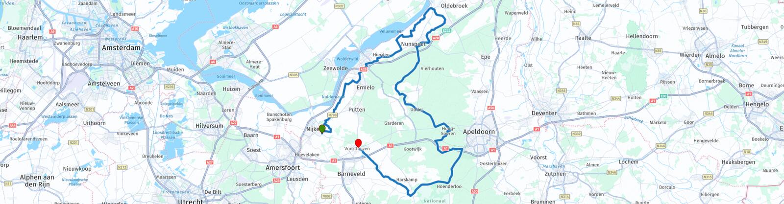 Begin je rit in het charmante Nijkerk en volg de mooiste wegen die je naar Harderwijk kunnen brengen. Daar schittert het Veluwemeer als een gepolijste spiegel tussen de noordelijke Veluwe en oostelijk Flevoland. Niet alleen een feest voor het oog, maar ook een topplek om even stil te vallen en te genieten van het uitzicht. Daarna laat je Harderwijk achter en stuur je door richting Elburg – alleen om die stad resoluut links te laten liggen. Je hebt immers een missie: door naar ’t Harde, een ruig, mooi stuk Nederland.