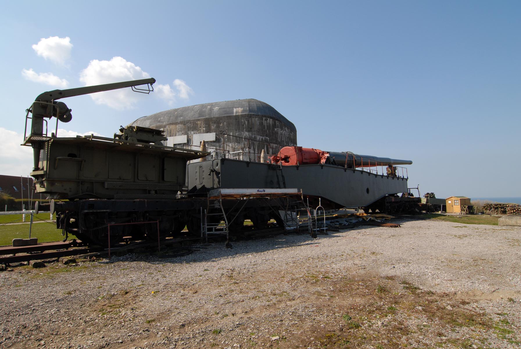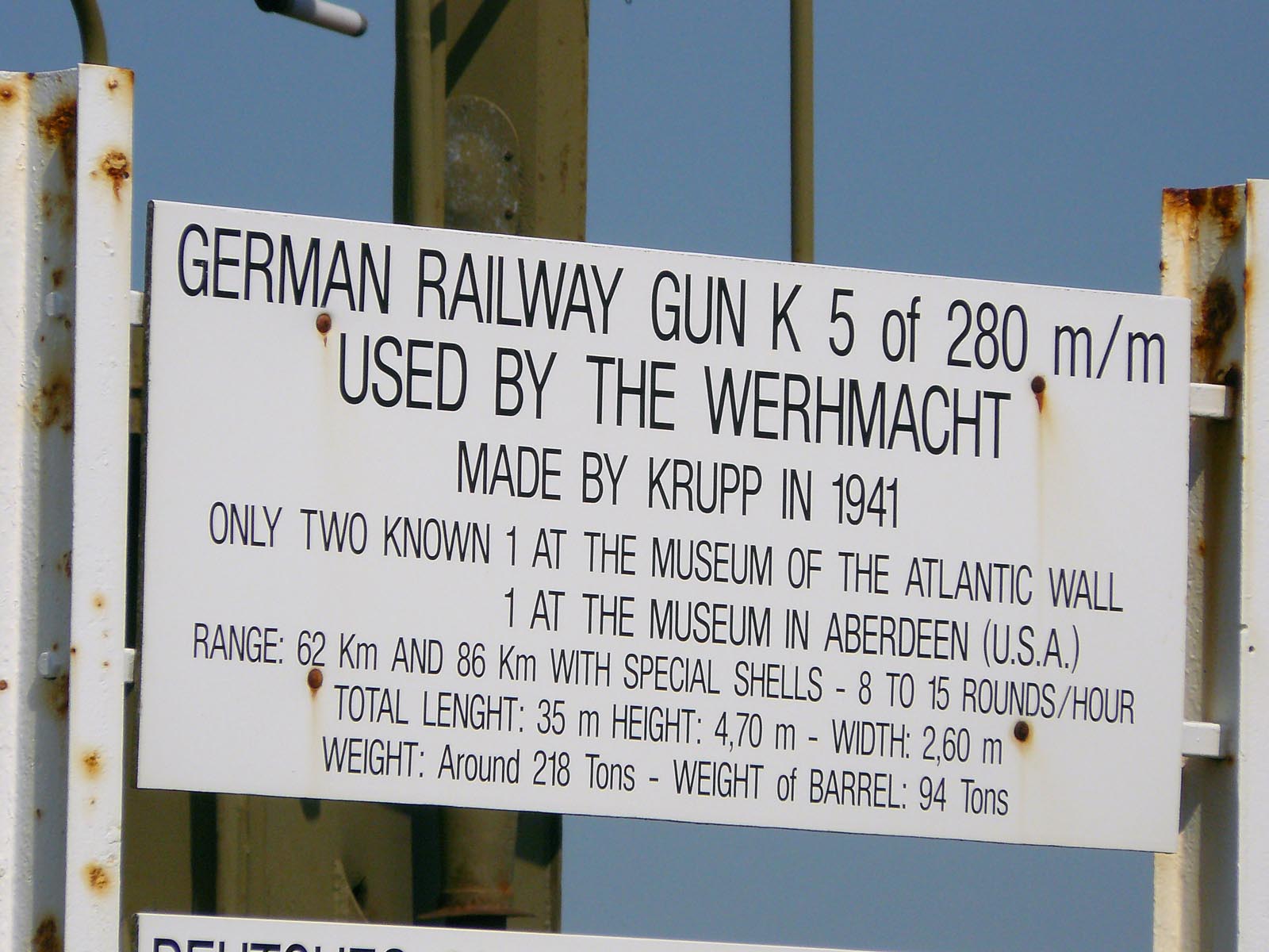 Oorspronkelijk stond dit kanon niet hier maar zoals de naam zegt, werd het door een locomotief over het spoor voortgetrokken. Met zijn 19 meter lange loop schoot het de 28 cm granaten van 255 kg maar liefst 62 km ver. Het kanon was al gebruikt voor beschietingen van Parijs (toen het nog niet in Duitse handen was) en werd daarna ingezet om de Engelse kust te bestoken. Er werden in totaal 22 K5-kanonnen in diverse uitvoeringen gebouwd waarvan er vier de oorlog overleefden. De Atlantikwall, waar dit complex deel van uitmaakt, loopt vanaf Noorwegen langs de kust naar het zuidwesten en was door de Duitsers tot aan Spanje gepland. Helemaal afgebouwd is hij nooit, maar er zijn nog vele erfstukken te vinden. Zowel in België als in Nederland.