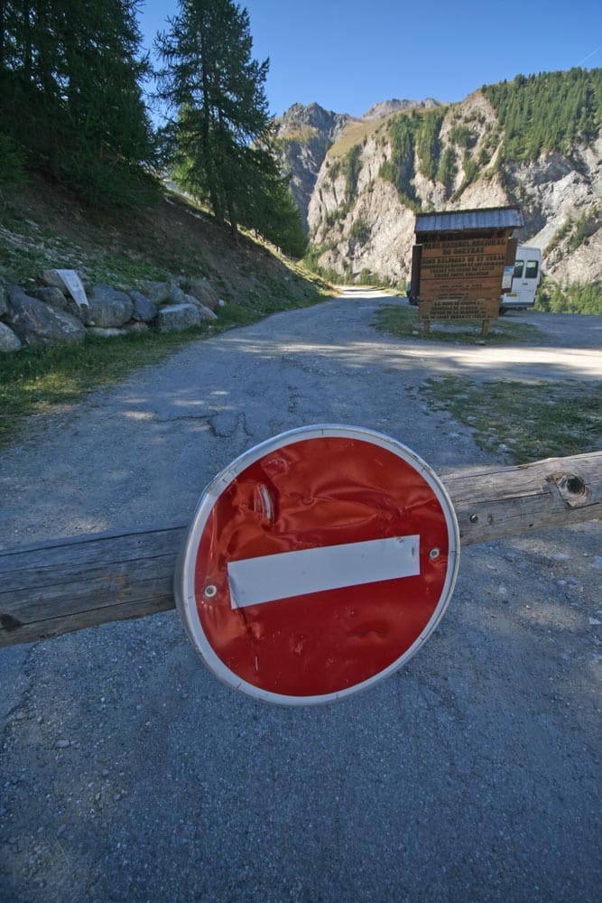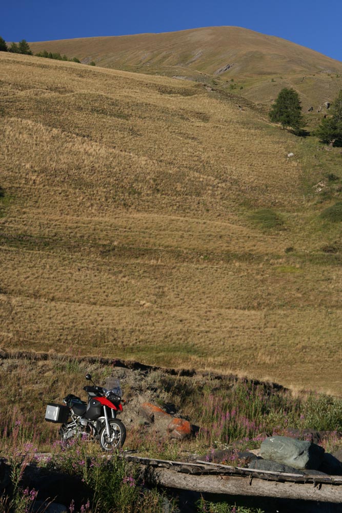 Saint-Véran heeft nog topper. Boven het dorpje ligt op 2990 m een sterrenobservatorium, bij Pic de Chateau Renard. En daar loopt een onverharde weg naartoe – een van de allerhoogste van de Alpen. En toch is het zo goed als onbekend, want de weg – nou ja, het paadje – mag alleen met speciale toestemming worden bereden. Ik dus naar de burgemeester. Maar mijn genereuze aanbod om met de GS pizza’s naar het observatorium te brengen, wijst hij af. Nadat ik te voet een stukje van het pad heb verkend, vind ik dat niet zo heel erg. Een kilometer na de slagboom ontaardt het pad in een chaos van keien, gaten en diepe watersporen.
