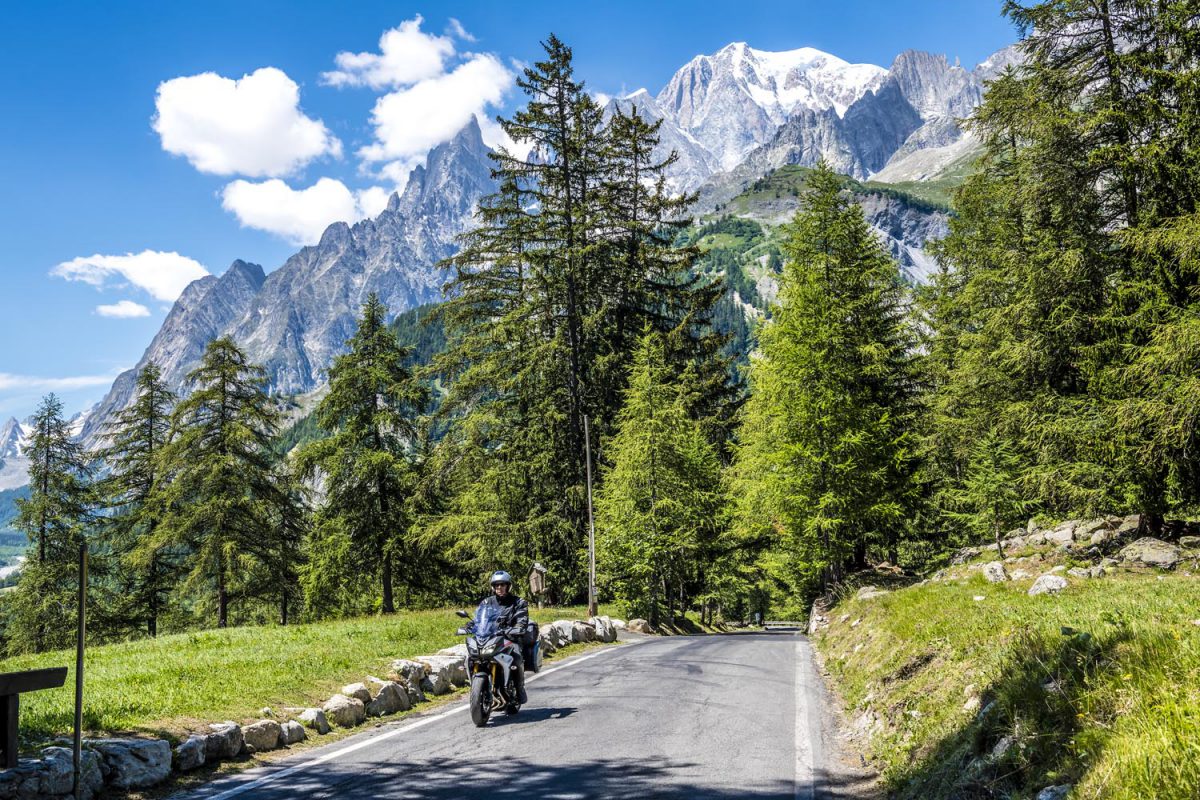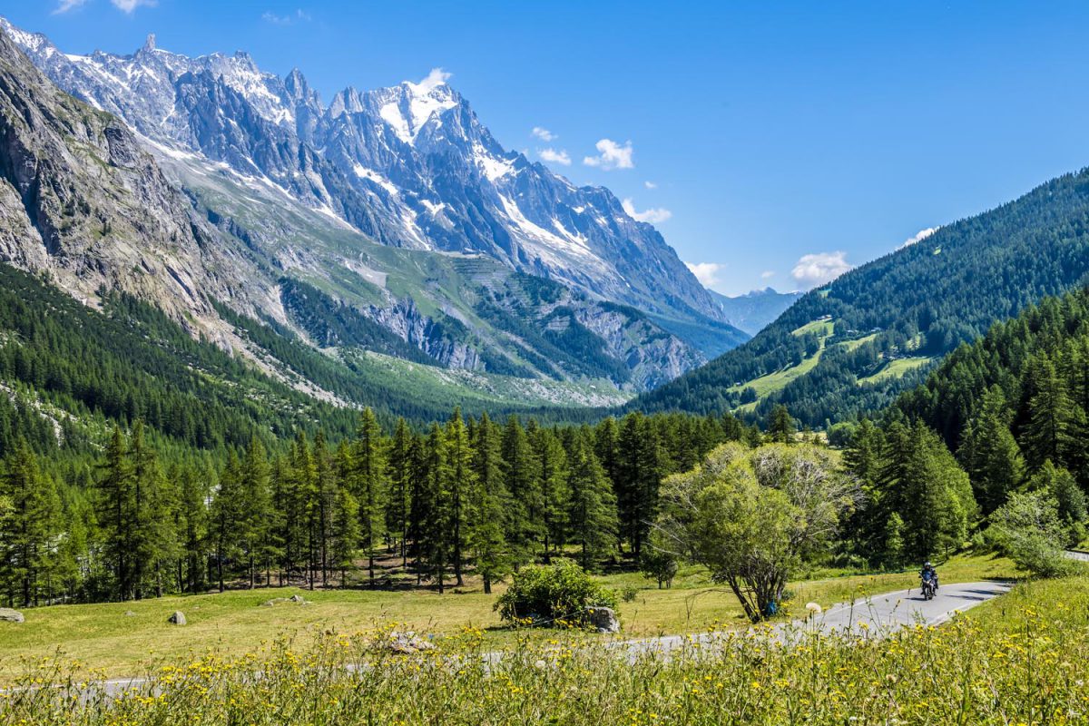 Eerst een lange snelwegrit richting Zwitserland via een route naar keuze, dan lekker sturen op de fenomenale paswegen over de Col de la Forclaz, want dankzij het overzichtelijke verloop kun je er een goed tempo op na houden. Door Chamonix en Les Houches tot aan de afslag omhoog naar Merlet, een dierenpark met uitzicht op de Mont Blanc. Wat als gevolg van weelderige flora en ware ‘wolkenbergen’ geenszins vanzelfsprekend is, want de met zijn 4.810 meter hoogste berg van Frankrijk – en zelfs de hele Alpen – blijkt vaak behoorlijk mensenschuw. Nog minder is het uitzicht in de tunnel onder de Witte Berg, die we na een comfortabele nacht in Chalet Hôtel Les Capanules gebruiken om met de nodige tijdsbesparing via Aosta bij ons volgende doel in Italië aan te komen. Door dit afsnijden voelen we ons wel een klein beetje als Japanners die ‘The Alps in four days’ doen.