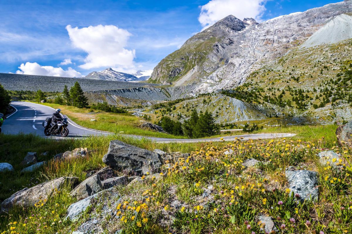 De volgende piek. In Italië is dat de 4.061 meter hoge Gran Paradiso. We naderen vanuit het filegevoelige Aosta-dal via een geasfalteerde achtbaan omhoog naar het hooggelegen dal Valsavarenche. Geen doorgaand verkeer, dat scheelt. De Tracer verliest op hoogte wat pk’s en laat in de haarspeldbochten bij Imrod merken dat hij weliswaar van helemaal onderuit kan trekken, maar liever wat meer toeren maakt. Uiteindelijk staan we met twee stukken taart in de kiosk van camping Pont Breuil, het eindpunt van deze kloof. Wat geeft het dat we de Gran Paradiso alleen op een ansichtkaart in volle glorie zien, we hebben lekker gereden! Terug naar Aosta, daarna vlot over de grandioze Col du Grand St. Bernard en een verbindingsetappe tussen Martigny en Visp tot aan de volgende top in Zwitserland. Wie denkt dat daar de Matterhorn de hoogste is, zit ernaast, zij het maar net.