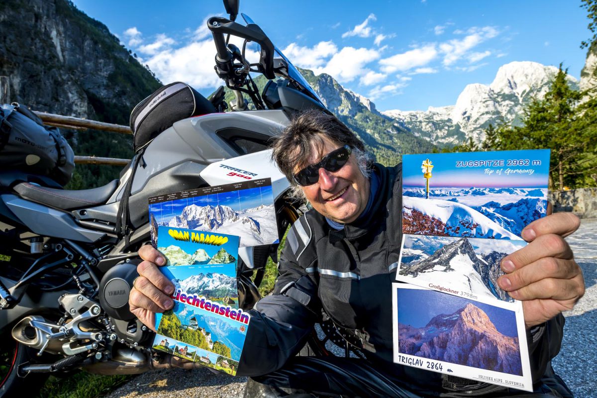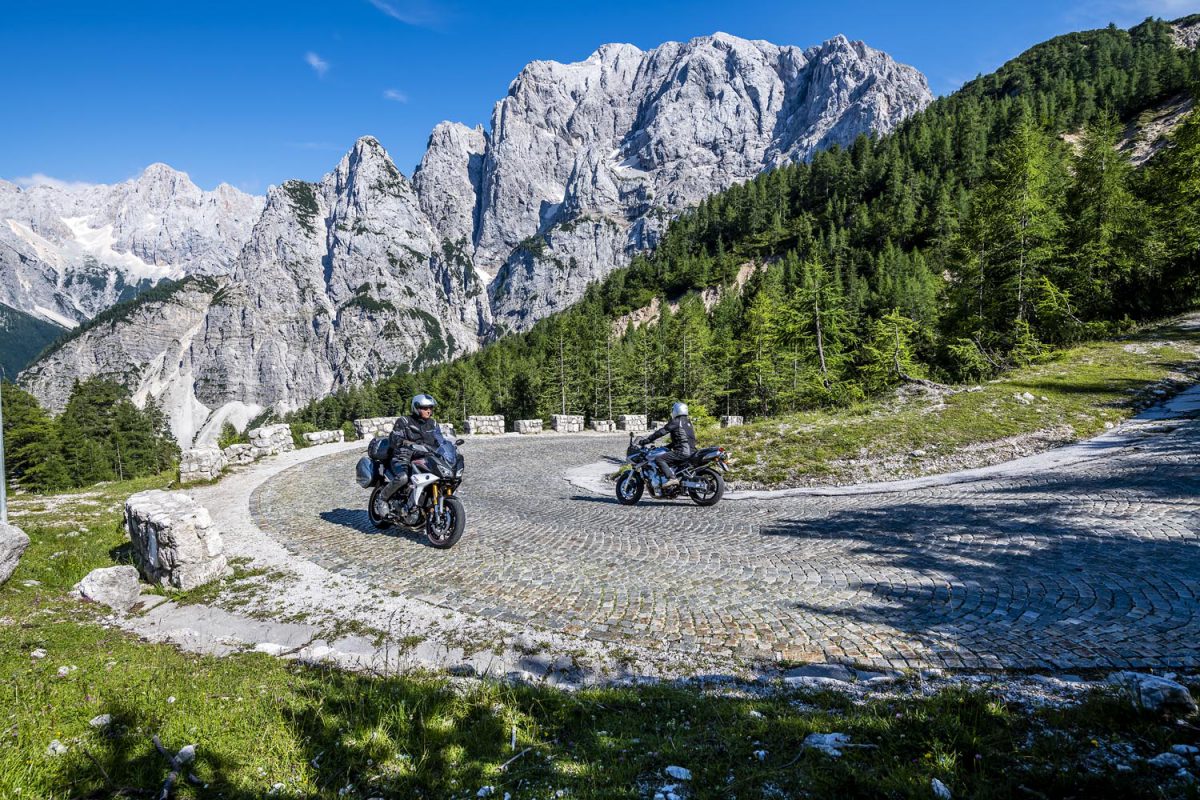 Vierenhalf uur later volgt de zevende Summit: de 2.864 meter hoge Triglav in Slovenië. We hebben de verkeersarme Naßfeld-pas met zijn twee gezichten inmiddels achter ons gelaten. Twee gezichten, want op de noordflank heb je prachtig asfalt om heerlijk op te sturen, maar op de zuidflank ligt er verweerd wegdek met spoelgaten en een tunnel met een krappe, knijpende haarspelbocht erin. Nu gaan we dus nog een laatste keer het landschap afzoeken, nu op zoek naar de Triglav. Voor bergbarbaren als wij is het niet zo gemakkelijk om de ‘driekop’ te vinden tussen al zijn gelijkvormige soortgenoten in de Julische Alpen. Maar zo erg is het niet, want de steile Skrlatica-wand en andere scherpe tongbrekers langs de Vršič-pas met zijn 49 haarspeldbochten – die deels met klinkers zijn geplaveid – door het nationaal park Triglav zijn prachtige alternatieven en dus completeren we onze piekenverzameling gewoon met nog een extra ansichtkaart.