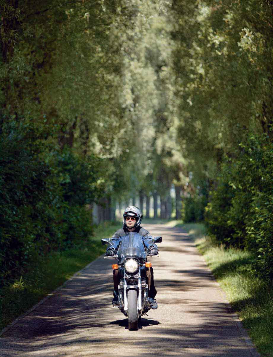 Als ik weer uit het gewas te voorschijn kom, rijdt een lieftallig meiske in een autootje voorbij. Ze toetert fervent, steekt een duim omhoog en plooit haar gezicht in mooie herkenning. Dus ik denk dat meer mensen zo’n expeditie in het groen hebben ondernomen. Navraag levert later op dat de plantages – hoewel ik dat toch betwijfel omdat er niet veel vrouwelijke hennepplanten werden aangetroffen – voor medicinale doeleinden zijn opgezet. Hoe dan ook, om in euforie te geraken heb ik enkel motorgeronk nodig. Psycholoog René Diekstra omschreef het eens als volgt: ‘Nogal wat motorrijders beleven het rijden als een meditatief moment, een moment van eenwording – en versmelting – met de machine.’ En jawel, ik behoor tot dit ras waarbij het geluid van de motor, de cadans van de wielen en de frisse rijwind een rustgevende roes creëren.