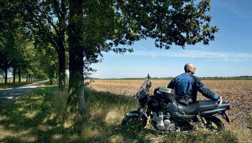 Voor dag en dauw springt mijn Honda SevenFifty met één druk op de startknop meteen tot leven. Twee trekjes gas en hij is de straat uit. En na drie bochtjes zoeft de gestaalde perfectie uit Nippon al over het hogesnelheidsasfalt richting Drenthe. Het is hoogzomer en bijna alle Nederlanders lijken buiten de landsgrenzen te vertoeven. Meestal zoek ik de linkerbaan op om het getreuzel van overbeladen bestelbusjes, slome vrachtwagens en zwiepende sleurhutten te slim af te zijn. Maar dit is nu niet nodig want zelfs de rechterbaan van de A28 is nagenoeg leeg. Heerlijk, om zo met een sereen draaimoment van vijfduizend toeren over het vacante asfalt te suizen. Geheel onthaast – het klinkt een beetje raar in dit verband – bereik ik tegen negenen de startplaats van mijn expeditie langs Hunze en Drentsche Aa.