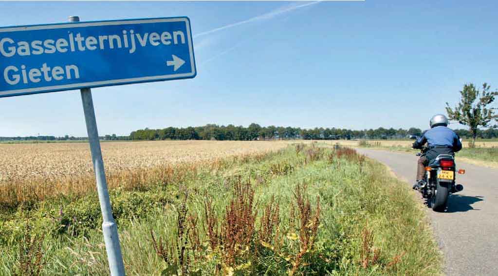 Hier wordt de voorvork omgegooid naar het zuiden en rijden we de zon achterna. Eerst vlak langs de autoweg A28 om dan een moment later het prachtige asfalt op te snuiven van de oude provinciale weg tussen Glimmen en Tynaarlo. Heerlijke, lange bochten zijn mijn deel waarin de SevenFifty zo lekker scheef kan dooracceleren. Ik begrijp nu waarom Drenthe de grootste motordichtheid van alle provincies heeft. Op elke duizend Drentenaars staan 35 motoren geregistreerd, terwijl het landelijk gemiddelde 27 bedraagt. Natuurlijk, de TT van Assen zal ook van invloed zijn op dat cijfer. Maar als je zo’n puik openbaar asfalt in de buurt hebt, is dat toch een extra reden om een machine aan te schaffen.