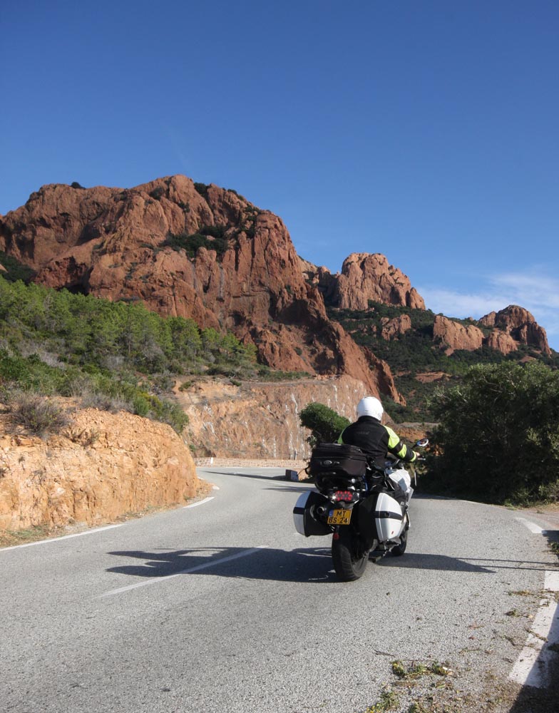Na de dichtbij bebouwing rondom Cannes, komt er wat ruimte. Zoals overal kan ik lekker doorrijden, terwijl de kustweg steeds bochtiger wordt en de uitzichten steeds beter. Op zijn mooist is de kust hier bij de rode bergen van de Cap Roux, zowaar een onbebouwd stuk. Ook bij toeristenplaatsen als St. Raphael en Frejus kan ik gewoon in het zadel blijven. Maar op weg naar St-Tropez kom ik tegen de avond in bekende zomerse toestanden terecht: een file van vele kilometers lang. Dat heeft te maken met een zeilevenement, waar tienduizenden bezoekers op af zijn gekomen. Het is om gek van te worden. Maar niet alleen daarom sla ik de stad van Brigitte Bardot en de beroemde Vieux Port – met pronkjachten met Ferrari’s op het achterdek – over. Een betere reden is het prachtige achterland hier: het Massif des Maures. Al snel wordt het bijna onbegrijpelijk rustig en liggen er tientallen kilometers kronkelende natuurwegen voor me.