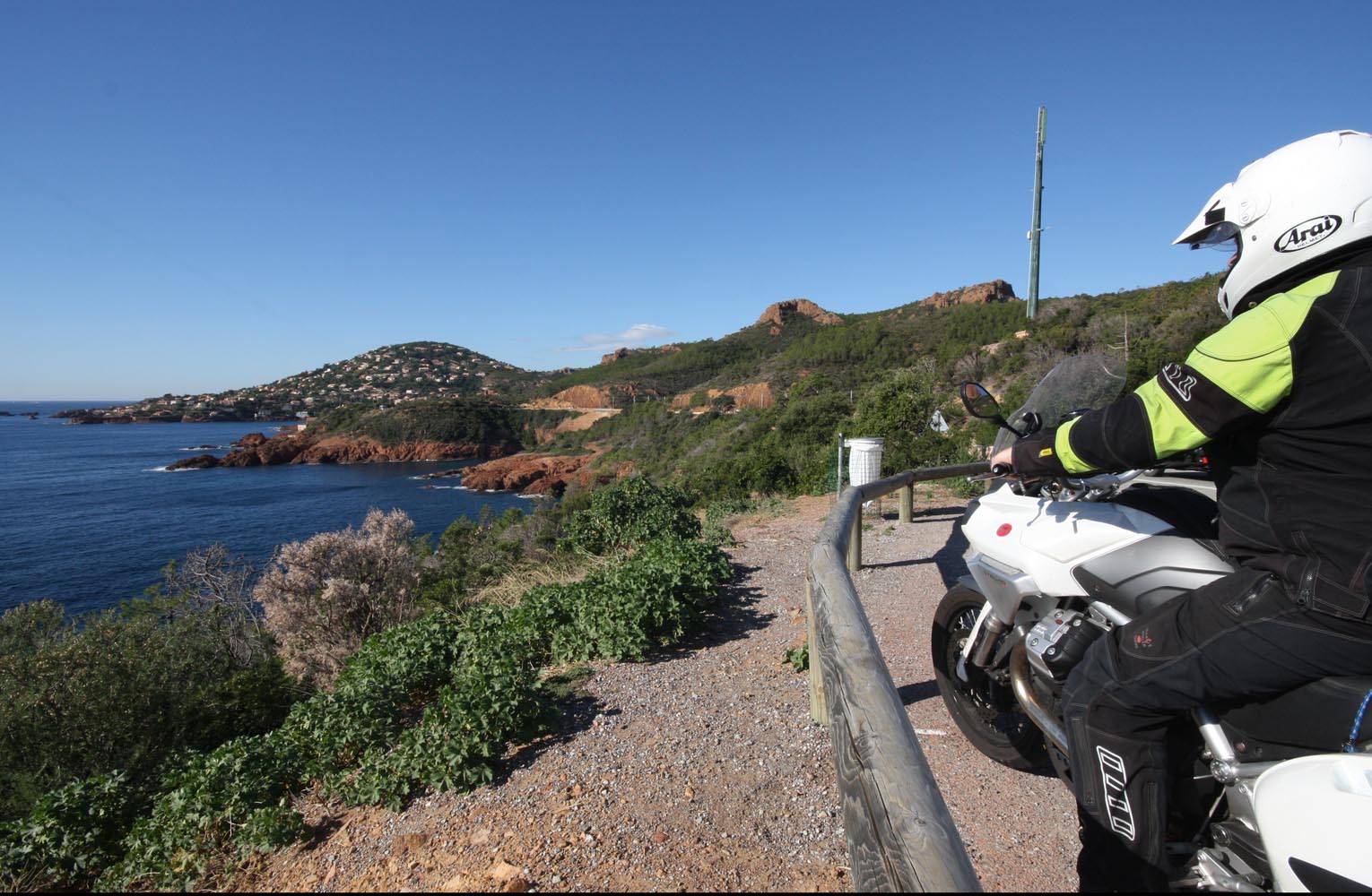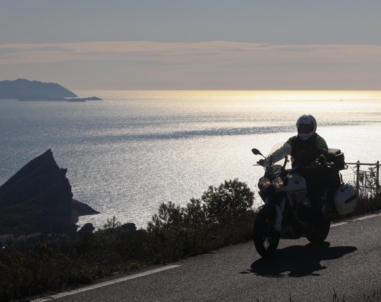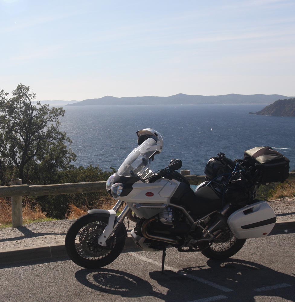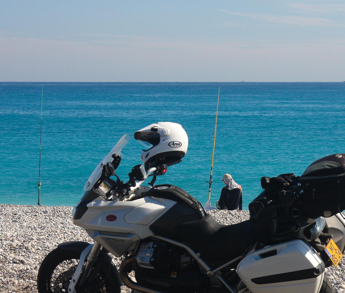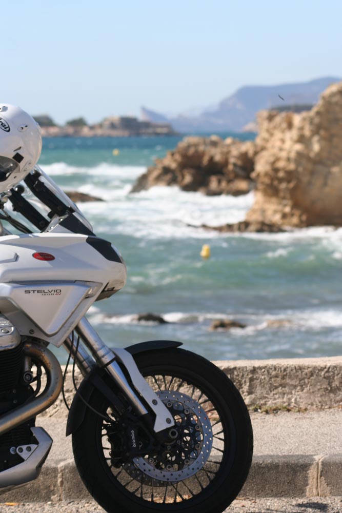 De Côte d’Azur loopt van Menton aan de Italaiaanse grens tot Marseille. En als ik op een vrijdagmorgen in oktober bij Menton aan mijn 400 km lange rit begin, is alles eigenlijk meteen al goed. Niet te heet, niet te fris, het water is blauw en mijn Moto Guzzi Stelvio wit. Over de boulevard rijd ik langs wuivende palmen en uitnodigende terrasjes. En op het strand liggen halfnaakte meisjes te zonnen. Alleen ligt de gemiddelde leeftijd van de meisjes rond de 68. Menton heeft sowieso de oudste inwoners van heel Frankrijk en in het najaar ligt het gemiddelde nog een stuk hoger, zoals aan elke zonnige kust. Maar dat zie ik graag door de vingers. Er staat namelijk tegenover dat ik niet voortdurend door een file hoef te ploegen, bij terrassen niet aan een stoelendans hoef te doen en op de bonnefooi een hotel kan zoeken. En dat de prijzen ook wat gunstiger zijn. Kortom: ruimte om te ademhalen. En om lekker te toeren.