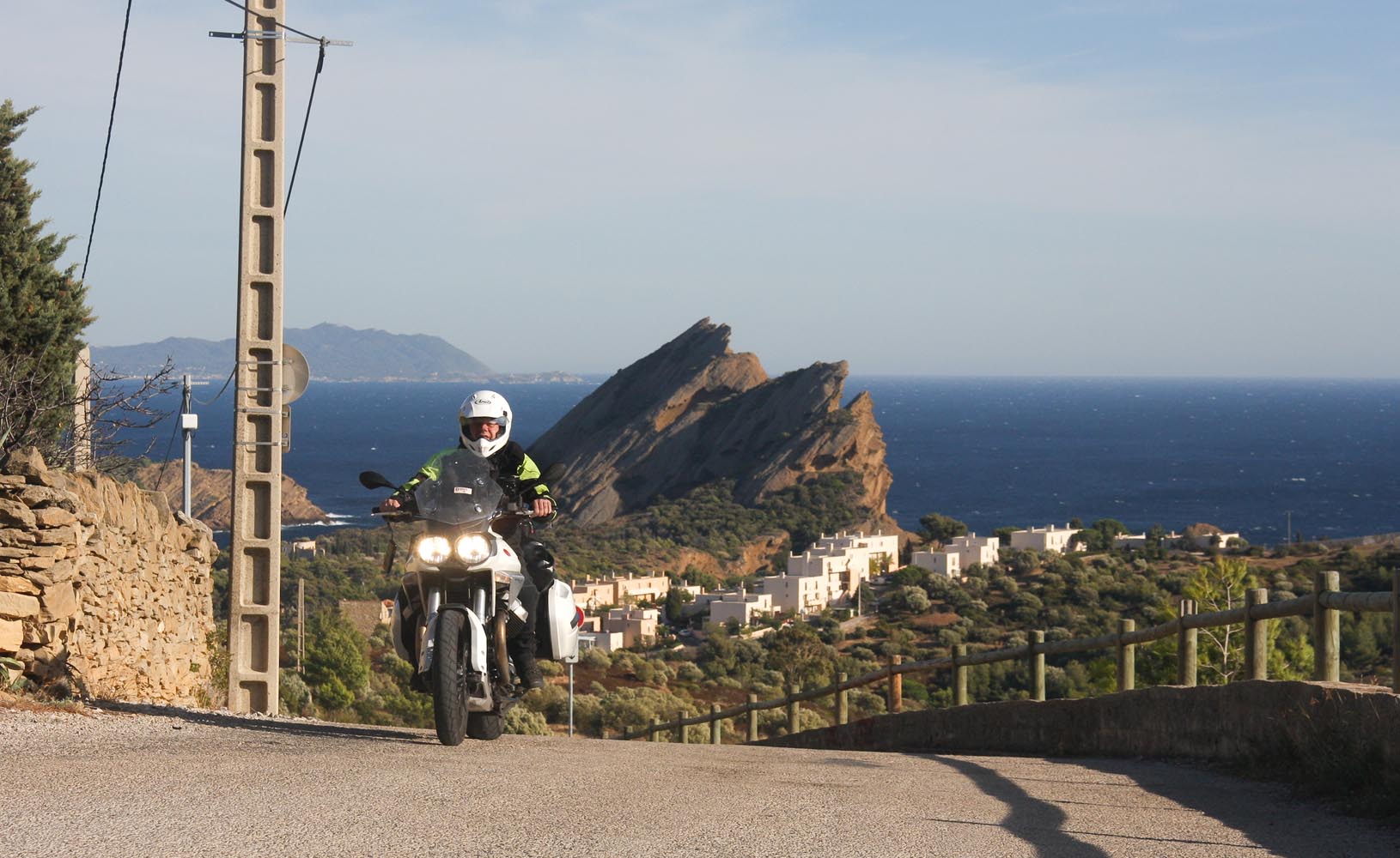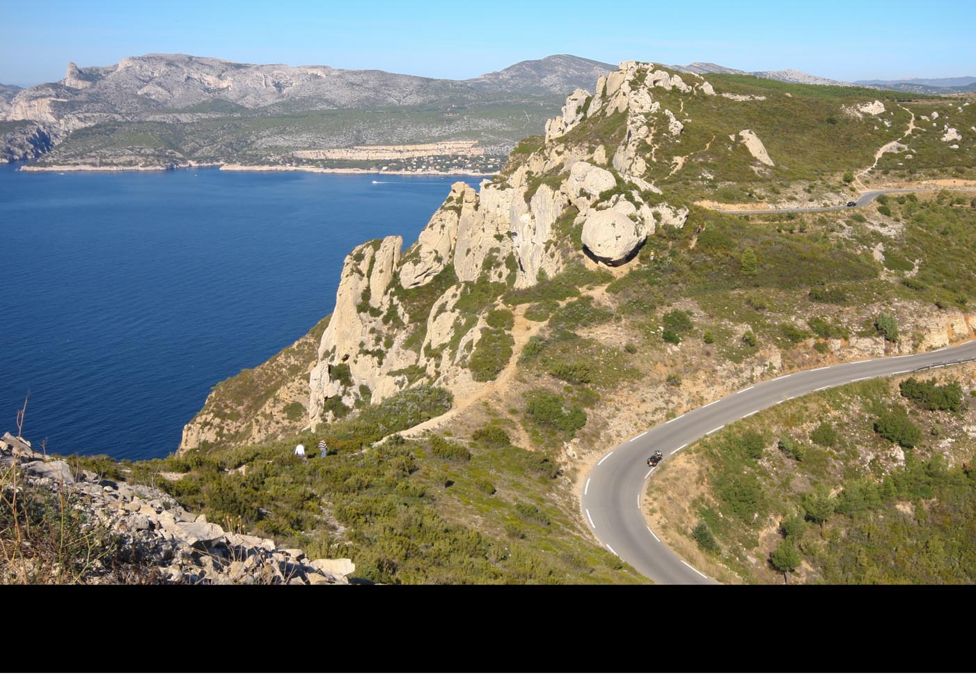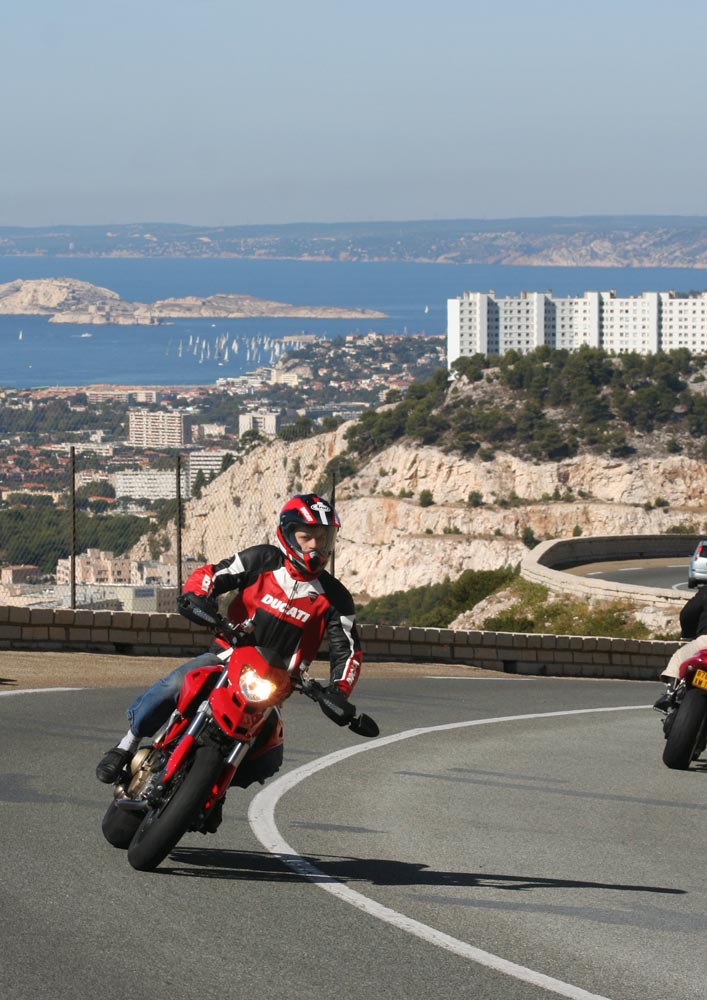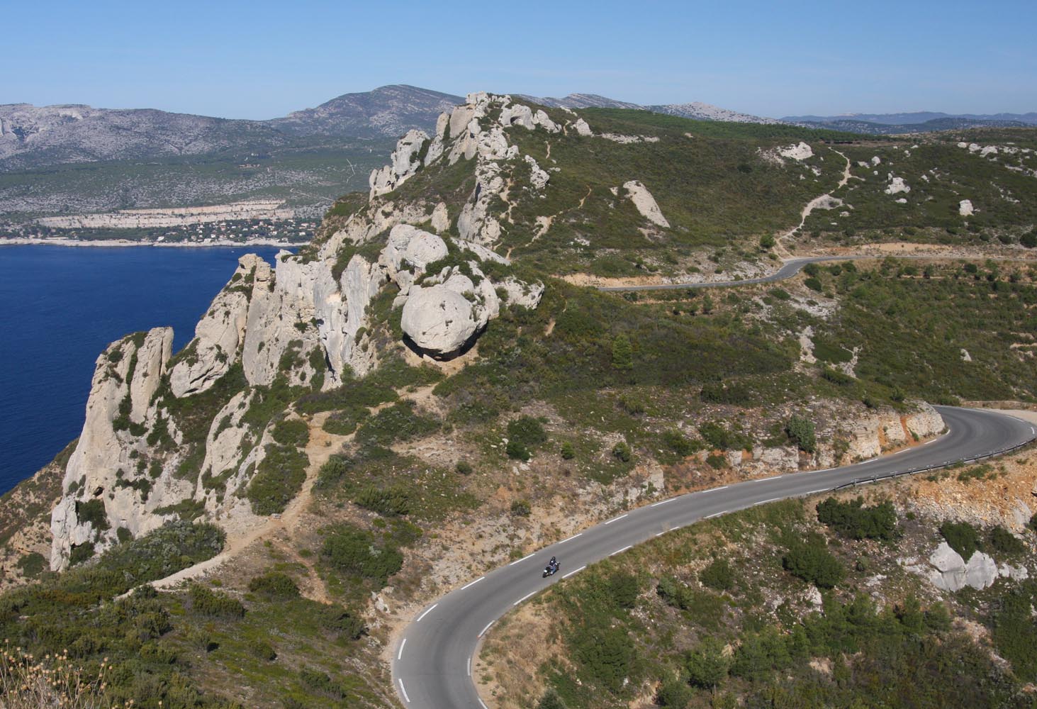 Het heet – uiteraard – de Route de Crêtes en loopt van La Ciotat naar Cassis. Bij aankomst stormt het zo hevig dat de weg is afgesloten. Als de slagboom de volgende morgen weer omhoog gaat, ben ik de eerste die gretig naar boven gaat. Daar, op een kleine 400 meter hoogte, wachten uitzichten over duizelingwekkend steile kliffen waaraan de eerste bergbeklimmers hangen. Achter me ligt La Ciotat spierwit in de zon te schitteren en naast me zie ik wijngaarden met het Massif de Baume op de achtergrond. Voor me de onwaarschijnlijk blauwe Middellandse zee en geelrode bergpunten die door de wind achterover lijken te zijn geblazen. Over de haarspeldbochten in de verte komen de eerste motoren uit Cassis me al tegemoet, want dit is 12 km puur rij- en kijkplezier. En ook de climax en het einde van bijna 400 km Côte d’Azur.