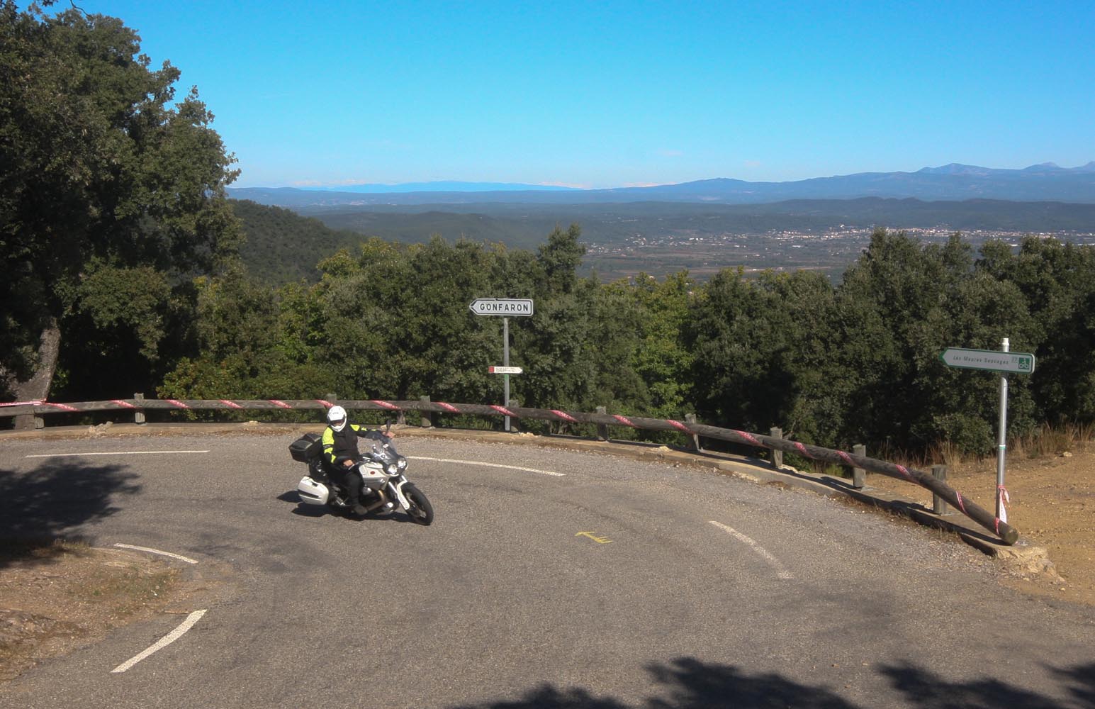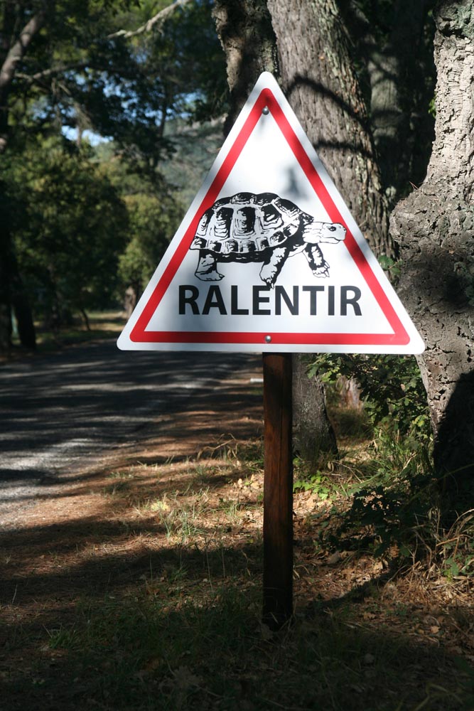 Dwars door het Massif des Maures lopen prachtige wegen door dichte bossen en over sterk geaccidenteerd terrein. De weg is bijna verlaten, maar echt opschieten doet het niet door de vele onoverzichtelijke bochten. Bovendien is het wegdek bezaaid met kastanjes. Toch is het heerlijk rijden hier in het warme najaarszonnetje. Een paar van de allermooiste wegen zijn helaas afgesloten met roodwitte linten, net als de picknickplekjes langs de weg, vanwege brandgevaar. Het zou niet voor het eerst zijn dat het kurkdroge bosgebied in een apocalyptische chaos veranderde door toedoen van een achteloze toerist.