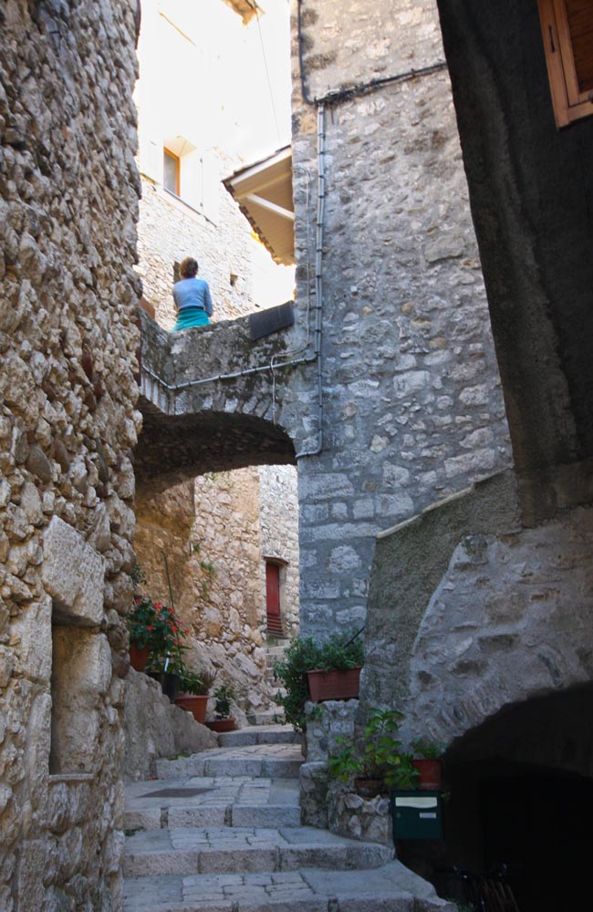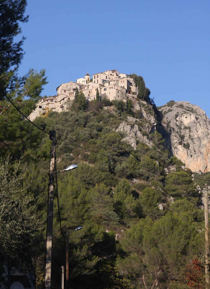 Nog veel gekker en maar veel stiller is Peillon, een middeleeuws dorp dat bovenop een veel steilere berg ligt, hemelsbreed 6 km naar het noordoosten. Ik moet er 50 km voor omrijden, maar de weg ernaartoe is grotendeels doodstil en het laatste, zeer steile en smalle stuk bergop is een duizelingwekkend spektakel. Hou alvast een schone onderbroek gereed.