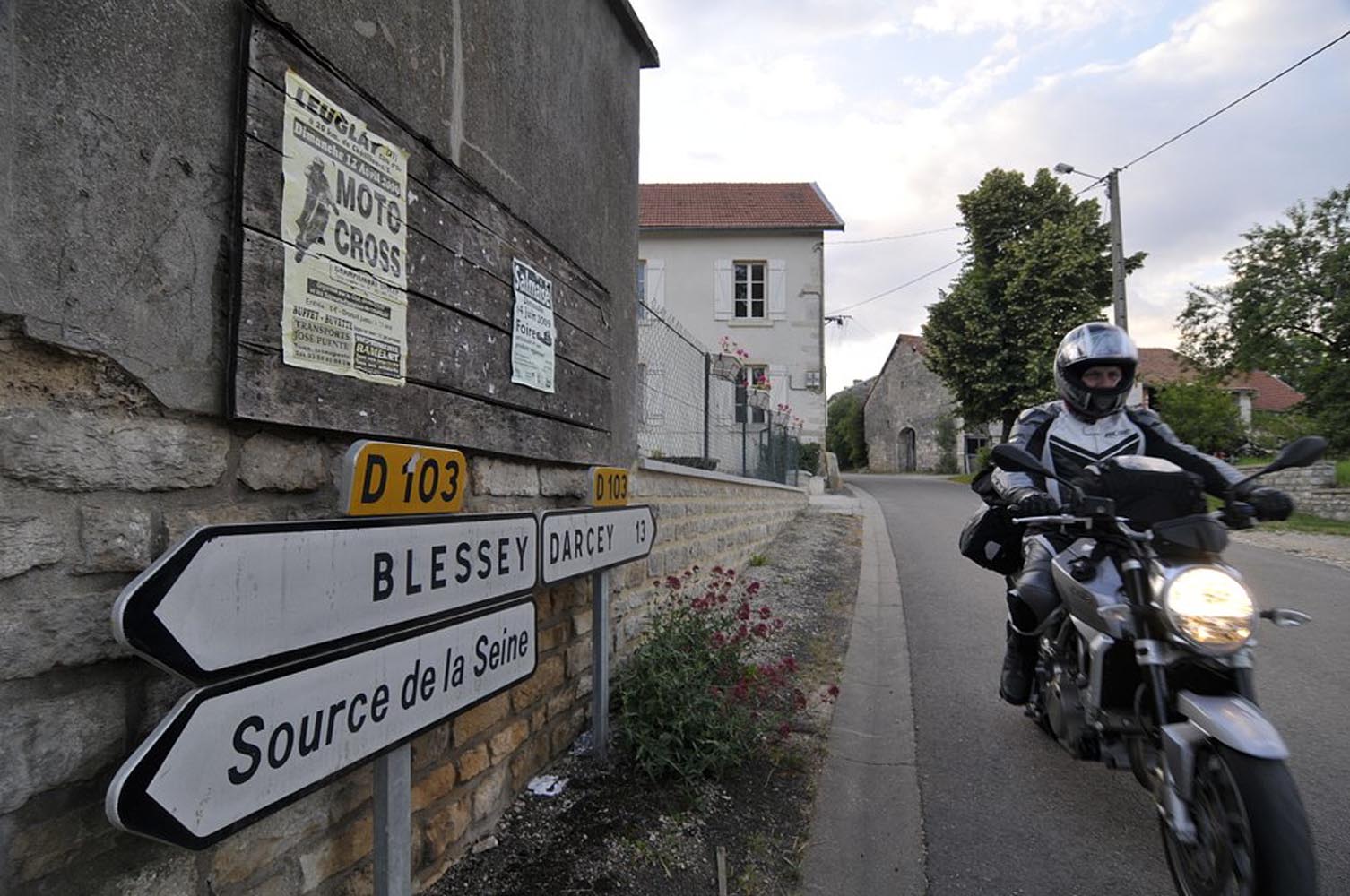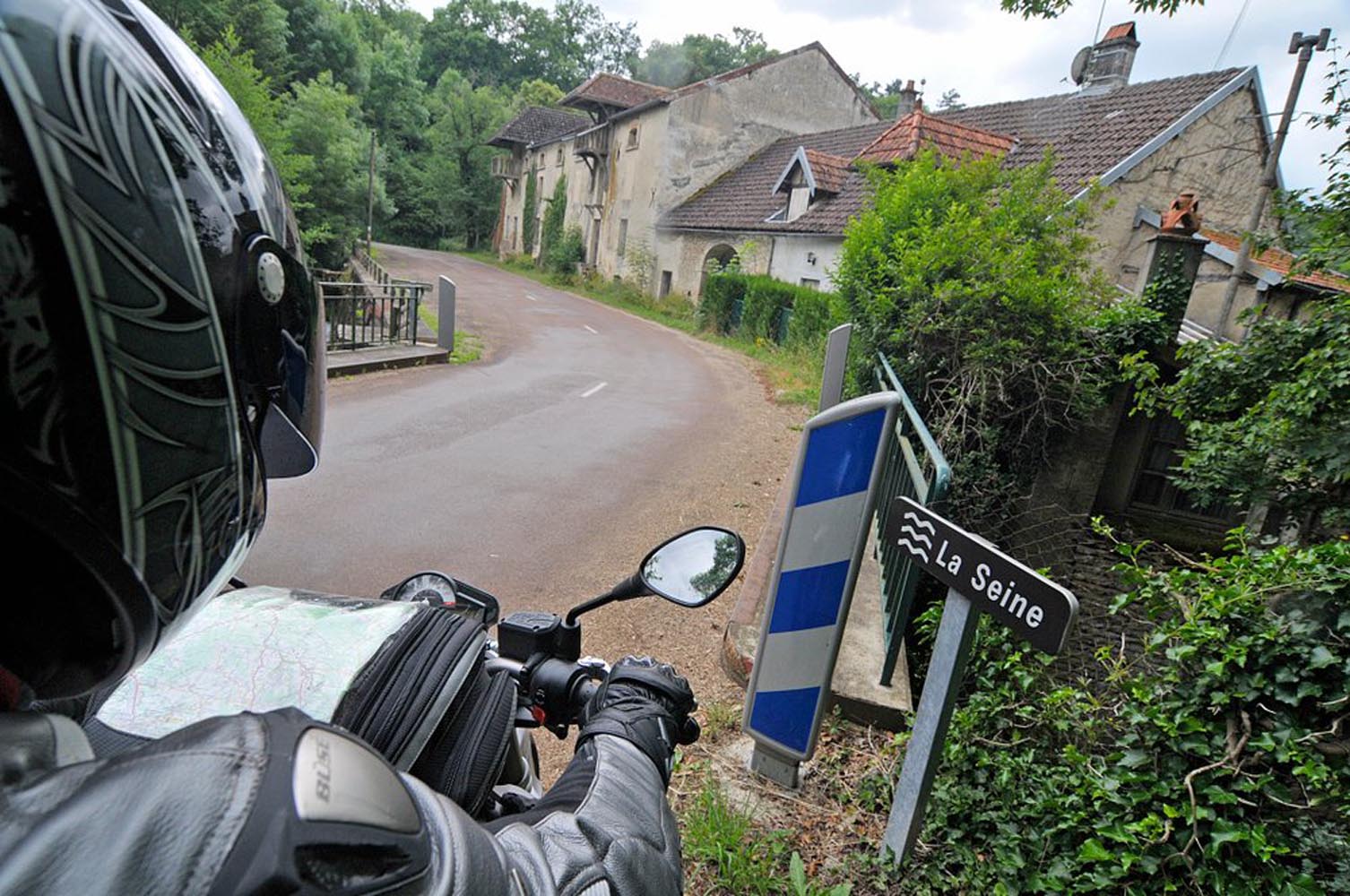 Over Daniëls Aprilia Mana maak je geen inschattingen. De machine heeft, net als de Ducati Monster, een buizenframe en een V-twin. Maar de 76 pk sterke motor met automatische overbrenging heeft scootergenen en wordt door conservatieve motorrijders niet helemaal voor vol aangezien. Onze Mana mag zich 676 kilometers lang bewijzen tijdens een dans van de oorsprong van de Seine tot aan de monding aan de Kanaalkust. En het enige bekende stuk op die route is Parijs. Via het Keltisch (Squan) en het Romeins (Séquana) werd de naam van de rivier de ‘Seine’. Maar van oorsprong betekent de naam ‘de bochtige’. En dat is een naam die ons blij maakt.