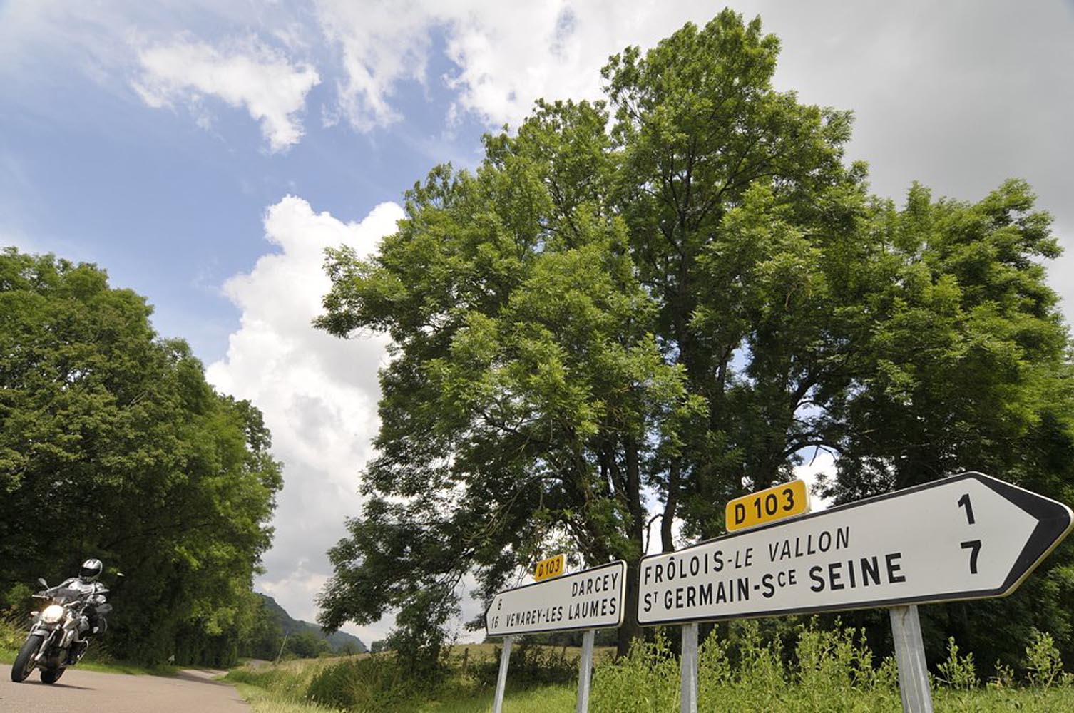 De hendel voor de handrem aan de linker flank van de Aprilia wordt gelost. We rijden weer in het niet spectaculaire landelijke Hier & Nu. Met als enig risico om zonder benzine te komen staan op een van de landweggetjes die kriskras door de bossen en weilanden lopen. Jammer dat ons vervoer niet op water rijdt. Want rivieren en beekjes zijn er wel in overvloed. De Seine is een kind uit een grote familie. Een paar van haar zusjes zijn bijvoorbeeld de Vau, l’Ozerain of Coquille.