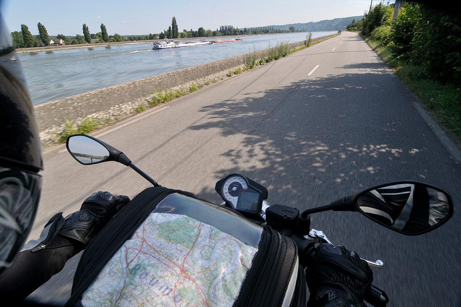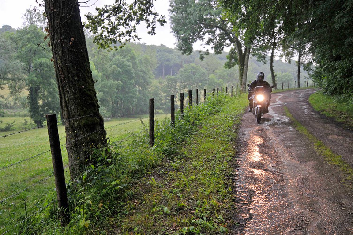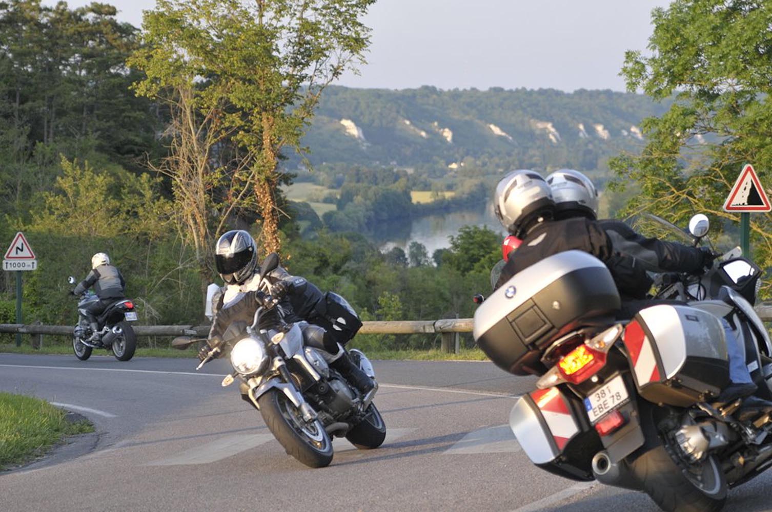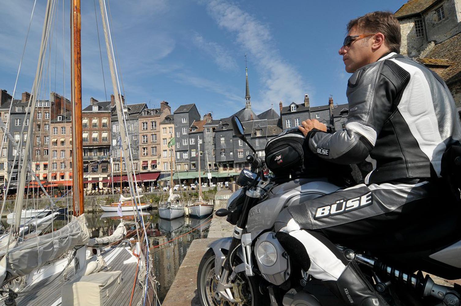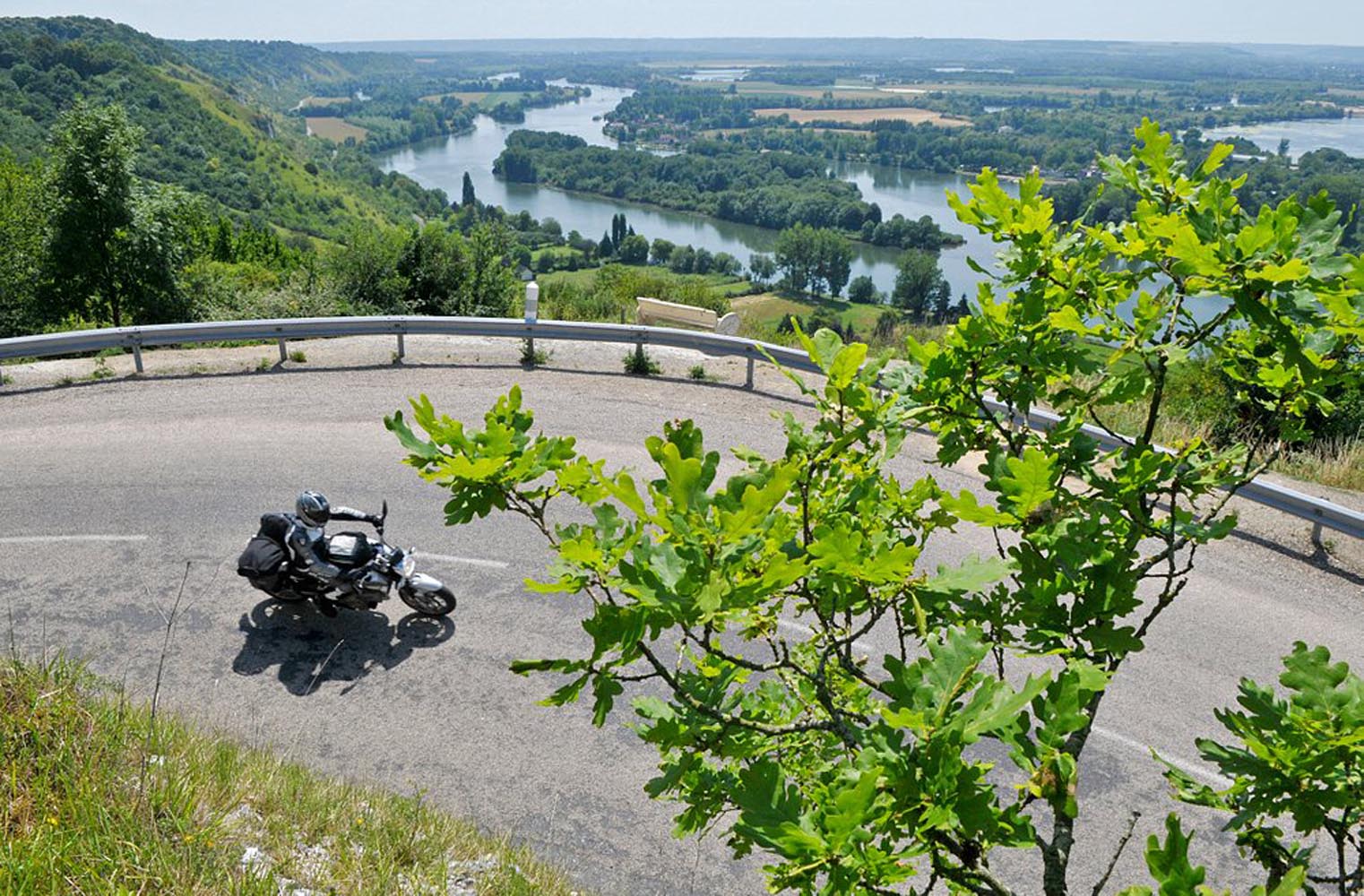 8 uur 30. We zitten nog steeds in Parijs. De poging om een paar rivierbochten af te snijden gaat een beetje mis en via wat omleidingen komen we in Versailles terecht. We laten het mooiste Paleis van Europa voor wat het is en pakken een saai stuk snelweg langs de Seine. Bij afslag nummer 10 verlaten we de A13 en rijden weer lekker tussen het groen. Tussen de bomen door knipoogt de zon tevreden en spiegelt zich wellustig in de rivier. De klippen die het landschap bij la Roche-Guyon overheersen zijn net zo verblindend wit als het gebit van een BN-er. Daarna is de Route des Crêtes met de tiptronic van de automaat in de sportmodus één uitbundig bochtenfeest en een garantie voor een grijns van oor tot oor. We zijn mooi op tijd in Gasny waar de chef van de ‘Auberge du Prieuré Normand’ ons een perfecte maaltijd voorschotelt. Het parkeren in de ondergrondse garage van het ‘Hotel Le Normandy’ valt dan weer tegen. Voor twee naast elkaar geparkeerde motoren betalen we er evenveel als voor twee auto’s.