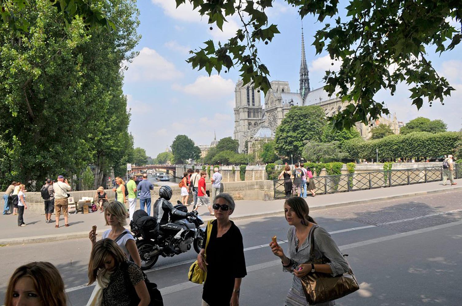 Wat je ook zoekt: als je in Parijs ook uit eten gaat; nergens in Frankrijk is de kans om slecht eten opgediend te krijgen groter. Dat wordt duidelijk in de als Roti de Porc vermomde schoenzolen. We haken halverwege de maaltijd af en kijken verder rond. En al menu’s lezend, kom je dan de meest bizarre dingen tegen. Ook op de stoep. Waar de schoenzolen thuishoren. Een Harley Sportster rijder op de Place de la Bastille heeft een enorm schild op zijn motor waarop staat dat Jezus ook van jou houdt. Ranke, zomers geklede meisjes met naaldhakken achter op dikke sportmotoren. Een keurig geklede man die met je meeloopt en je op beschaafde toon op het naderend einde van de wereld attendeert. Een jonge dame met een baby op de arm met een voorstel dat we denk ik gelukkig niet begrijpen en vaandelzwaaiende betogers van het Tamil Bevrijdingsleger. Kortom: Parijs is een brede stroom vol verrassingen en dingen met eeuwigheidwaarde die je moet bezichtigen. Raadpleeg van te voren wel het Internet en je stapel reisgidsen. Dat werkt gerichter. Tel daar de bijna versmolten verhouding tussen de stad en de rivier bij en het feest is compleet. We kunnen het allemaal bekijken omdat we het hectische verkeer ontvlucht zijn en een passende ankerplaats hebben gevonden op het horecaschip ‘O fil de l’o’. We hebben vanaf daar uitzicht op de Pont de l’ Archevêché en de Notre Dame. En je kunt er nog aardig eten ook.