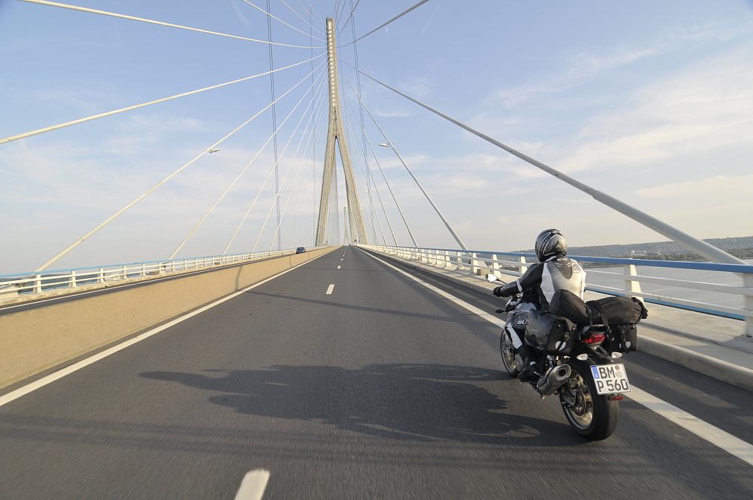 We hebben ons reisdoel bijna bereikt. De trechtervormige monding van de Seine. Daar vormt de dramatisch gewelfde Pont de Normandië, de met 2200 meter lengte de langste draadgetuigde brug van Europa, zich als een megalomane sinuskromme vanaf de kant het hemelgewelf in. Sensationeel! Wij mogen er nog eens tolvrij overheen. En met stevige zijwind kun je er nog gratis stevig schuin bij hangen ook! Maar wij rijden windvrij en ‘s avonds om tien uur zitten we nog zielsgelukkig op een terrasje. We genieten voor de ‘Vintage Jazz Club’ aan de havenkom van de oude kunstenaarskolonie Honfleur. Een plek waar zelfs de meest verstokte knurften nog een vleug romantiek ervaren en die het toeristische Le Havre met afstand op een tweede plek zet.