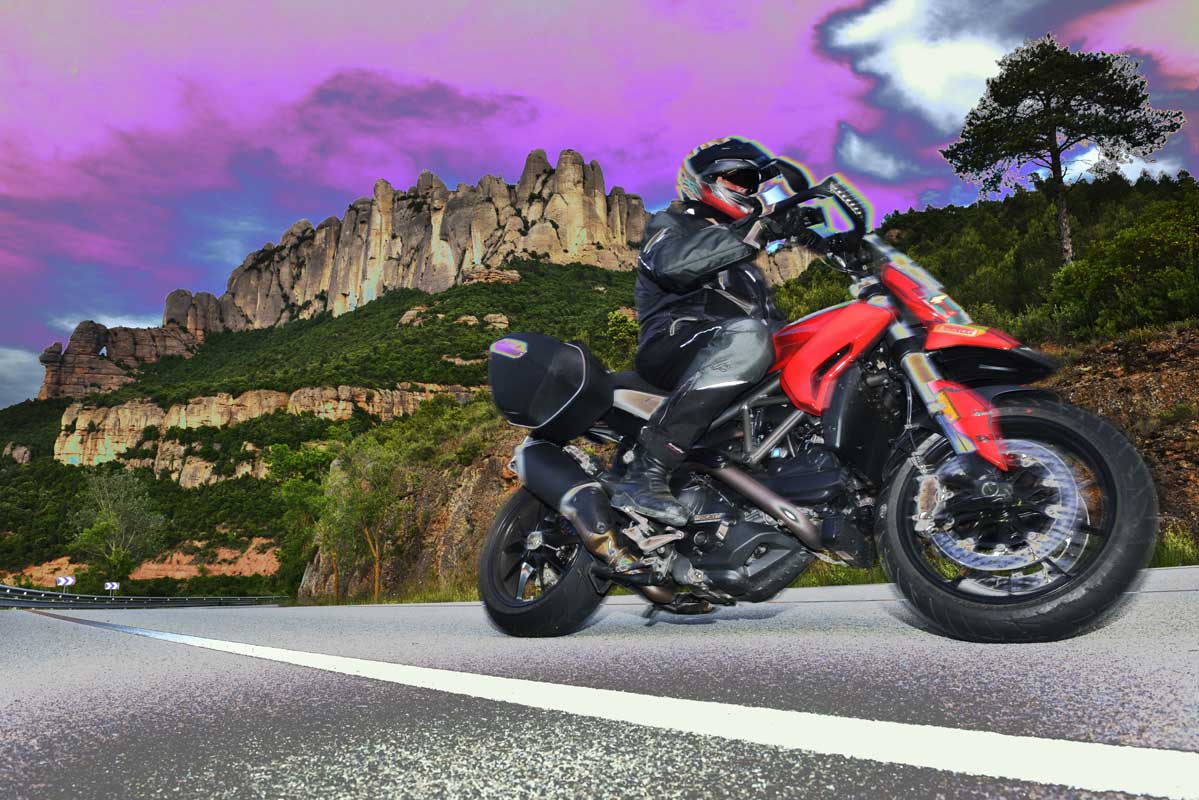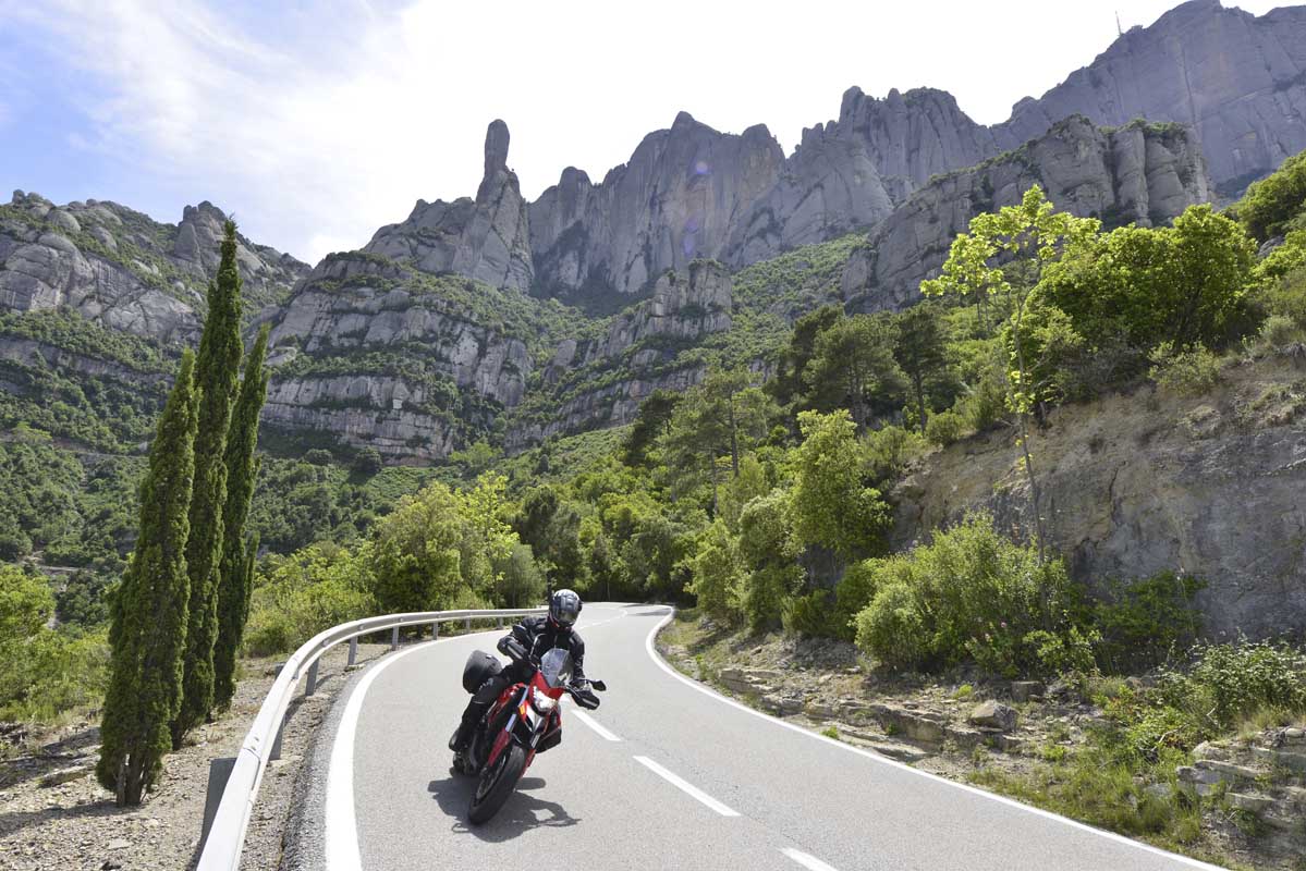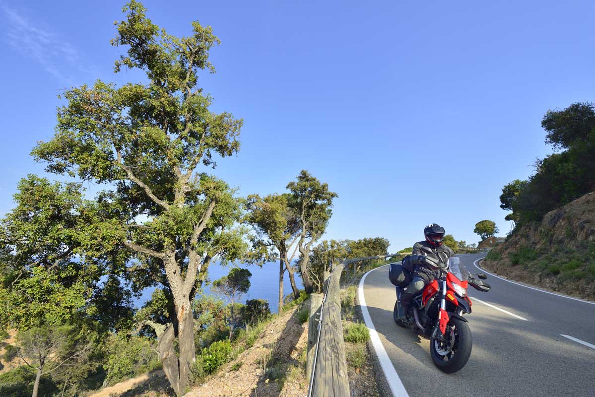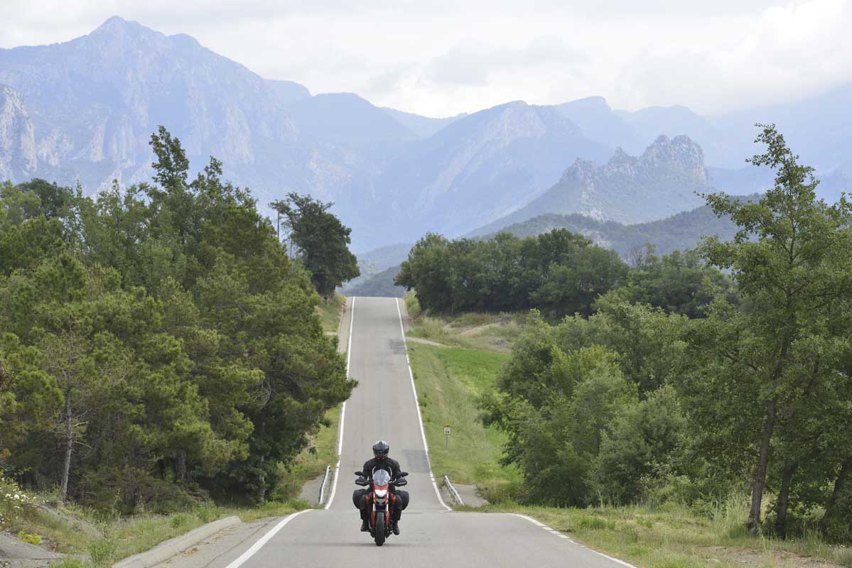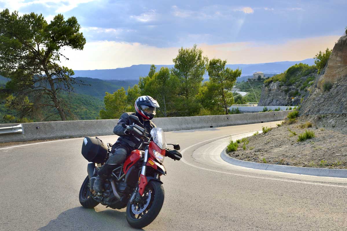 Normaal gesproken kunt u met de motoren ook het circuit op, maar niet in het eerste weekend van juni, want dan is in Barcelona de MotoGP. Dat vertelt de dame van het VVV aan de reisjournalist, die zijn reportage maar al te graag zou kruiden met een paar rondjes GP-ervaringen. En die ook nogal verbaasd is: in april werd toch ook al een MotoGP in Jerez verreden? Ja, maar dat was de GP van Spanje en niet die van Catalonië, zoals nu in Barcelona. Wat een wereld van verschil is, in elk geval aan de andere kant van de Pyreneeën, waar het kapitaalkrachtige Catalonië naar onafhankelijkheid van het impopulaire Spanje streeft. In plaats van over separatisme en nationalisme in Europa te discussiëren, hier volledigheidshalve de informatie dat in het door Madrid geregeerde land nóg twee kampioenschappen op de kalender staan, de GP van Aragon en die van Valencia. Maar niemand hoeft jaloers te zijn, want wie Marquez, Lorenzo en Pedrosa in huis heeft, heeft binnen het MotoGP-circus wel wat extra races verdiend. Blijft alleen de vraag waarmee wij aan de start moeten komen in het bochtige Catalonië. Een vette Enduro? Ach nee, liever een sportieve en lichte maar toch voor toeren geschikte machine, die ook op het racecircuit een goed figuur slaat. De Ducati Hyperstrada 939! Een gemakkelijke zitpositie, klein windscherm, koffertjes en een pittige L-twin.