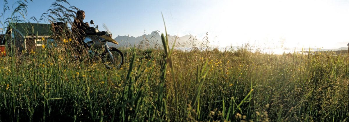 Om 16.40 brengt de veerboot Fiskebøl-Melbu ons op de Vesterålen. Die eilanden komen mild en liefelijk over in vergelijking met de zigzaggende kantelen en kammen van de Lofoten. Ook niet slecht. Langs de Eidsfjord, een van de vele kandidaten voor ‘mooiste zeearm van Noorwegen’, drijven we de GS en de KLV vlot richting Nyksund. Weer zo’n onweerstaanbare tip uit de reisgids, die vervallen historie en de morbide charme van een spookstad belooft. Opnieuw is alleen de rit erheen al een voltreffer. De oevers dicht begroeid met een groen-gele zee van hoog gras, daarboven ook hier de krijsende meeuwen, waarvan de schreeuwen in de wind verwaaien. Bij Myre wordt de hemel bedekt met bruin-grijze zwaveldampen, daaronder goudglanzende vlekken op de zee. De landingspoging op spookstad Nyksund en dan over een piste van aangewalste leem, slingerend tussen Prestfjord en de uitlopers van de bijna 700 meter hoge Klotinden. Een prima gelegenheid voor de vette enduro’s om ook offroad in balans te blijven.