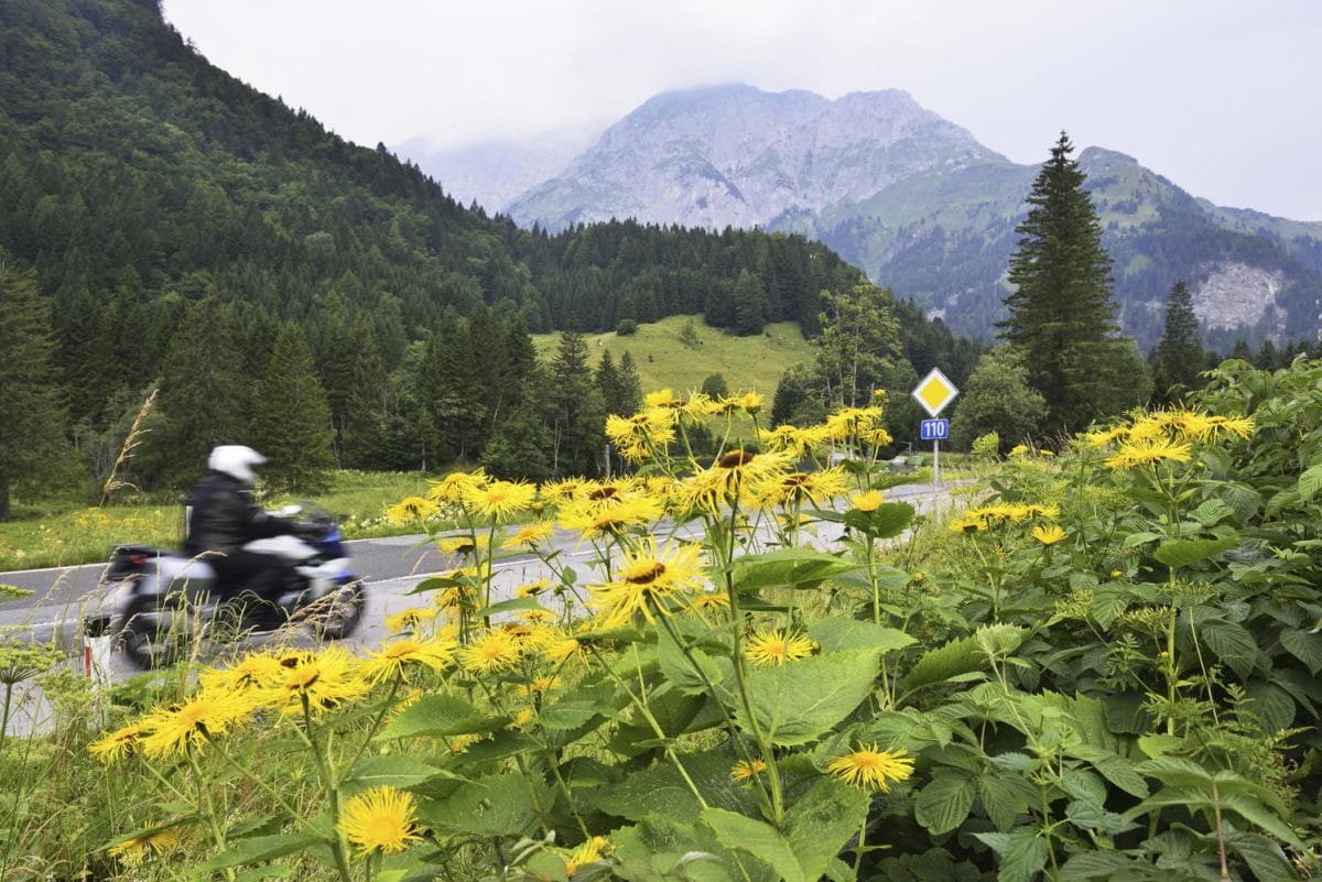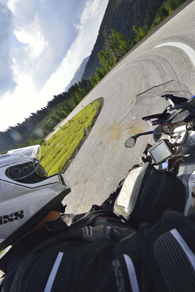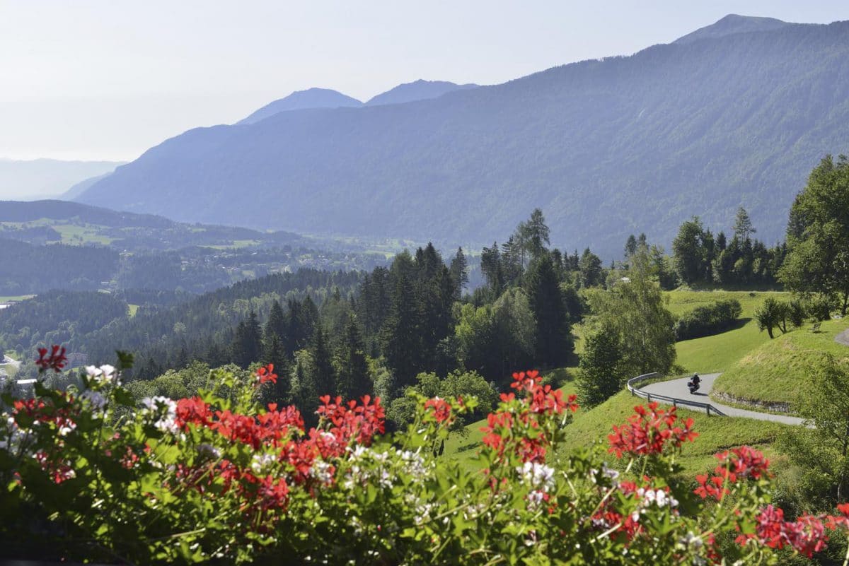 ‘We beginnen onze uitzending op een waanzinnig zonnige zaterdag,’ meldt de radio, waardoor we gelijk zin hebben in deze nieuwe dag. Als een diamant fonkelt de Pressegger See in de verte. En als in een metamorfose veranderen ordelijke gasten in functioneel leder gestoken tweevoeters die motoren uit de garage halen. Het gonst en bromt als een zwerm insecten. Ook wij gaan op in de groene ‘zee’ van de heuvel- en bergachtige Gailtaler Alpen. Ons eerste doel is Nassfeld met de gelijknamige pas, dat we gisteren slechts en passant zagen liggen. Dankzij de gladgestreken wegen kunnen we heerlijk vaart maken. Als in een reuzenslalom wentelt de BMW zich door de haarspeldbochten van de B90, die in de winter het grootste skigebied van Kärnten ontsluit. In omgekeerde richting gaat het over de Italiaanse kant van de Nassfeld-pas bij Lago Pramollo en via Windische Höhe, waar zich aan de horizon al weer nieuwe passen aftekenen, die omlaag gaan naar het volgende meer, de Weißensee.