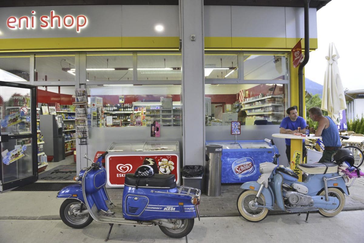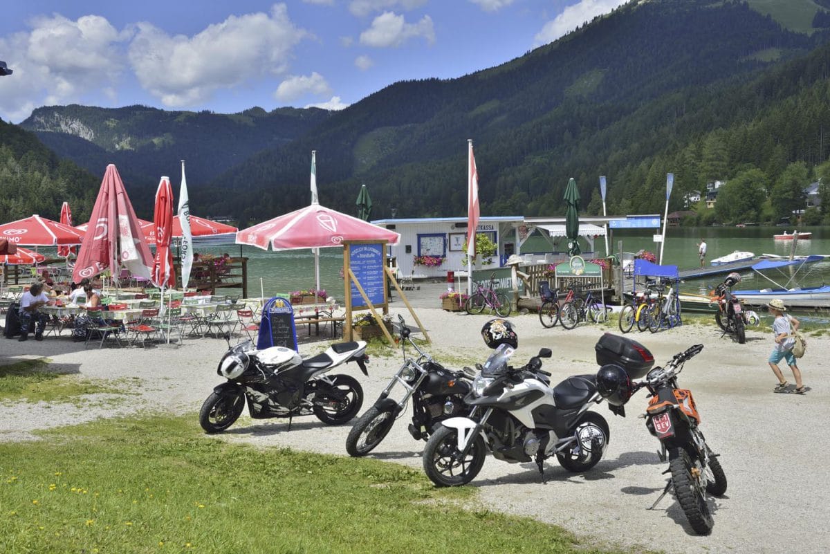 ‘Wat is uw sterrenbeeld? Aha, een leeuw, een kind van aartsengel Michael dus.’ Smalltalk met Waltraud Ogbebor, eigenaar van een winkel vol. Hij beveelt mij een tocht aan naar de Marienwasserfall in Grünau. Maar het vlees is zoals bekend zwak en dus wordt het vandaag niks met een wandeling naar Maria. In plaats daarvan bezoeken we liever de Erlaufsee, waar we onze motoren direct voor het strand kunnen parkeren en waar we ons in het wonderbaarlijk kristalheldere water zouden kunnen onderdompelen. Maar voor onverbeterlijke asfaltsurfers heeft de regio ook nog iets bijzonders in petto: de bescheiden Ötscher-Panoramastraße tussen Erlaufboden, Trübenbach en Treffling. Dus dat onderdompelen laten we ook maar zitten.