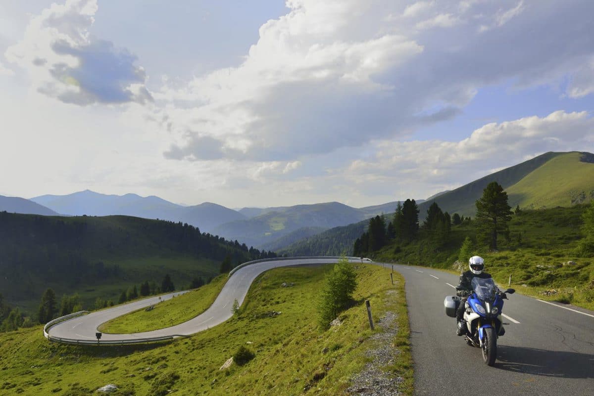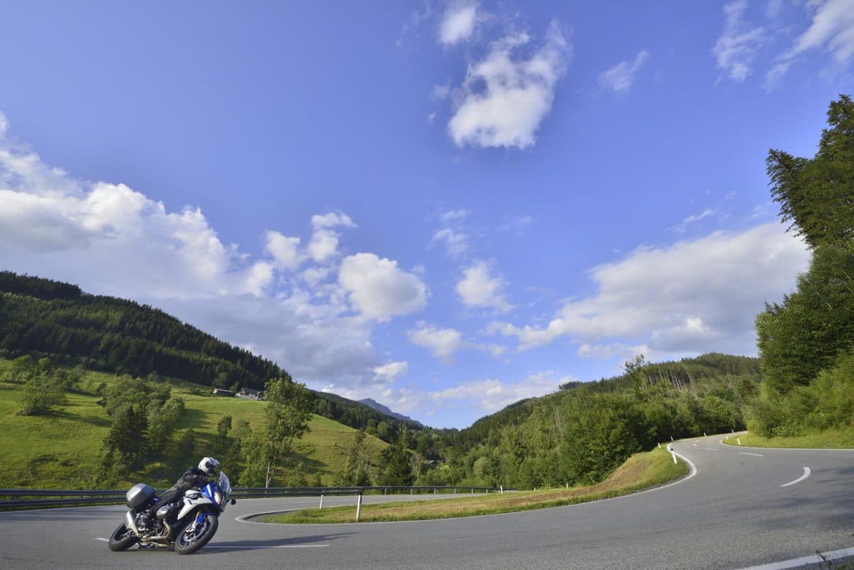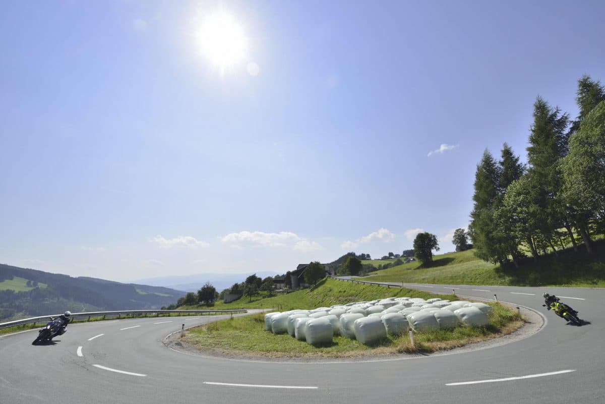 Zoals de Goldeck-Panoramastraße. Vergeleken met Großglockner en Co. een toeristisch muurbloempje, maar wat voor een. Wel eerst €7,50 tol per motor aftikken: dat is in Oostenrijk nou eenmaal normaal, maar tien haardspeldbochten verder voelt de uitgave al stukken beter. En het uitzicht is helemaal onbetaalbaar. Het oog reikt tot aan de Karnischen Alpen en de Karawanken. Wie voldoende gezien heeft, wil natuurlijk niet met een knorrende maag in het zadel zitten: in de Mähderhütte bestellen we een Kärntner specialiteit, een dik met ham, tomaat, komkommer en uien belegd huttenbrood. Om daarna volgas richting de Nockalmstraße te gassen.