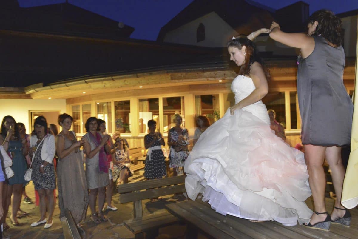 52 bochten binnen 34 kilometer door een grotesk glad geslepen landschap, ook wel de Nockberge genoemd. Wat willen we nog meer? Openingstijden! Tussen 18.00 en 8.00 is er een motorrijverbod van kracht! Daarom gunnen we onszelf, brave bikers, vanavond maar een klein hapje van de Nockalmstraße, die voor motorrijders een absoluut hoogtepunt is van de Gurktaler Alpen. Als troost en als afsluiter van een mooie dag: een voor de RS geschapen romantisch-sportieve toer via Deutsch Griffen en Flattnitzer Höhe over een verkeersvrije, bochtige weg. In de achteruitkijkspiegel de rode zon, in het oor muziek van een dorpsfeest. In het notitieboekje de opmerking: wat is Oostenrijk mooi! Na alle landelijkheid doemt als op een andere planeet het etappedoel in St. Salvator bij Friesach op: het fel verlichte hotel-museum-paleis Seppenbauer, zowel een verfijnd hotel als een heerlijk automuseum. De liaison voor het leven wordt daar vandaag gevierd door Petra en Christian. We komen juist op tijd binnengereden en zijn getuige van de geschaakte bruid die, in witte tule gehuld, uitgelaten over tafels en banken danst in de hoop dat ze haar toekomstige echtgenoot nog vóór middernacht mee naar huis kan nemen.