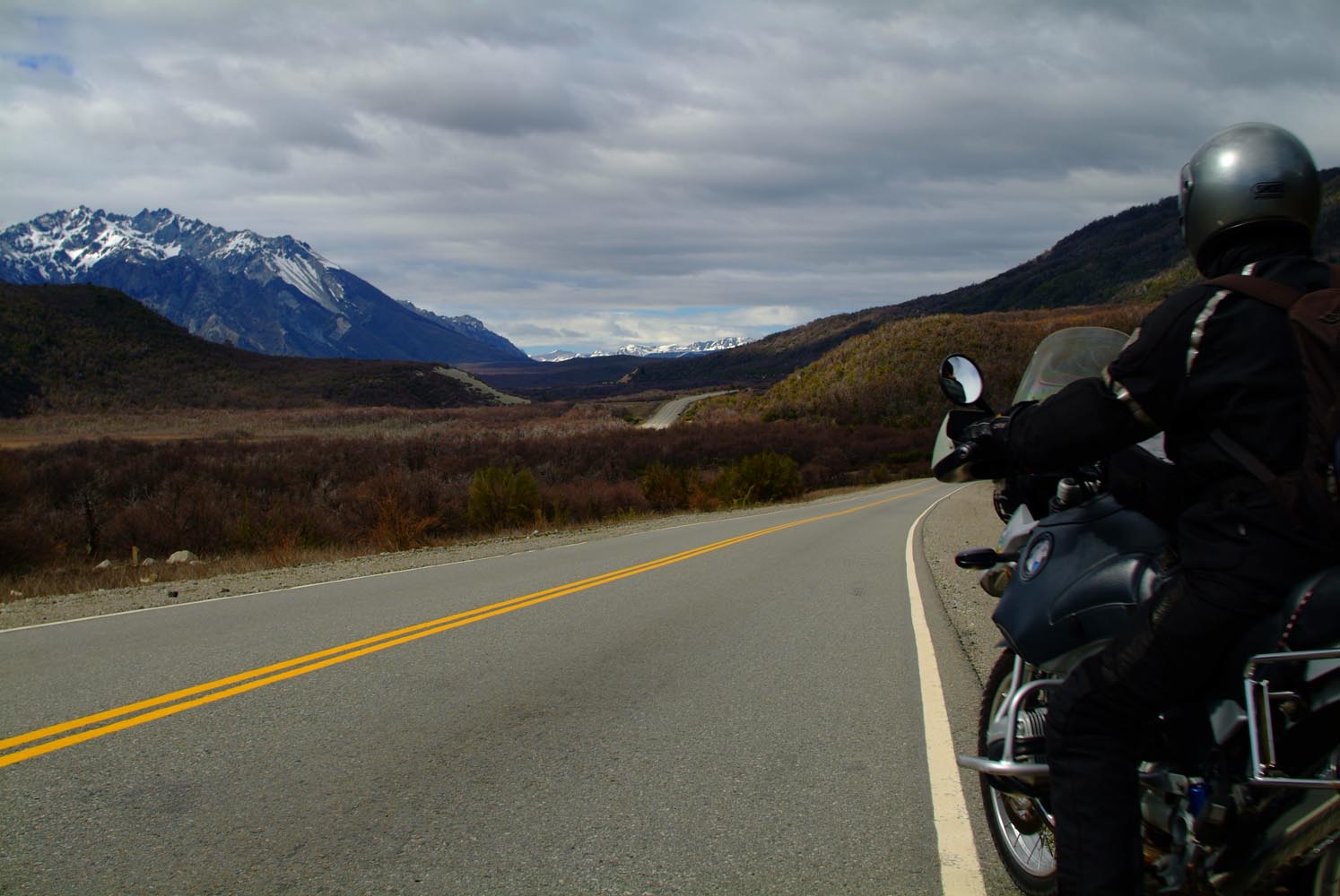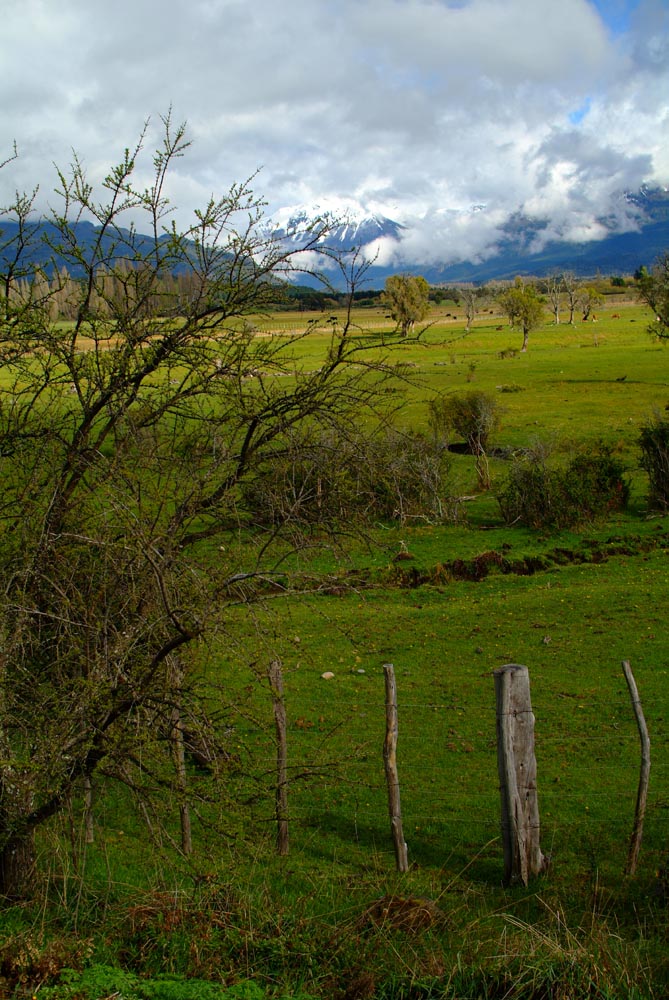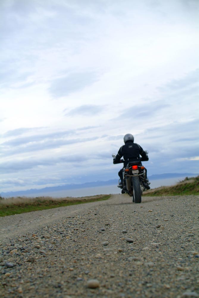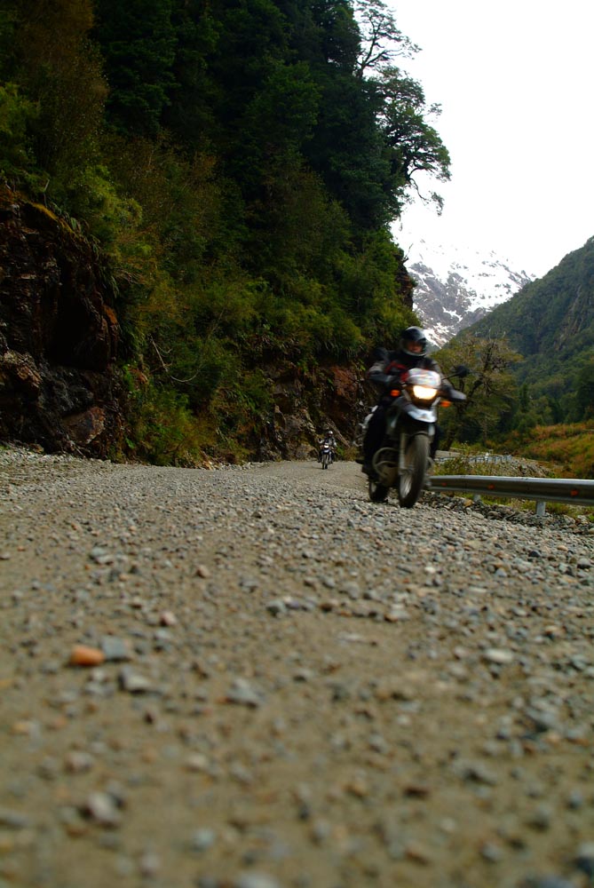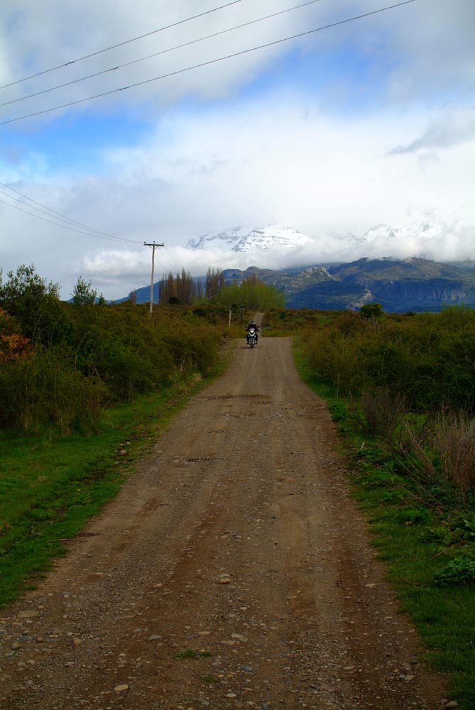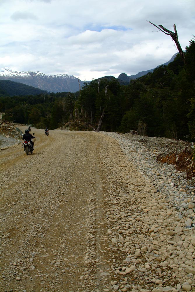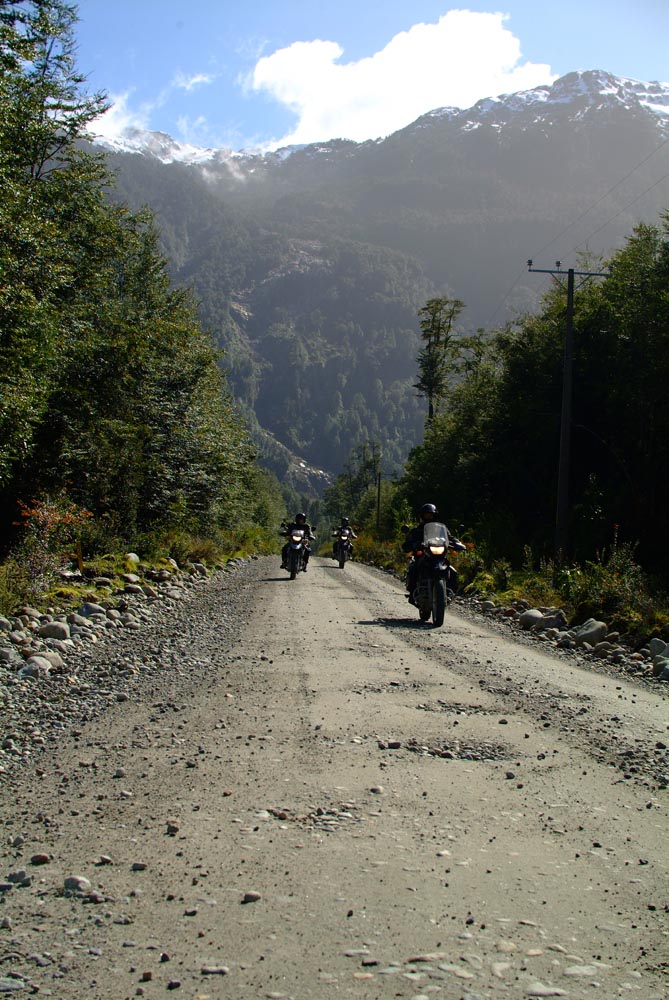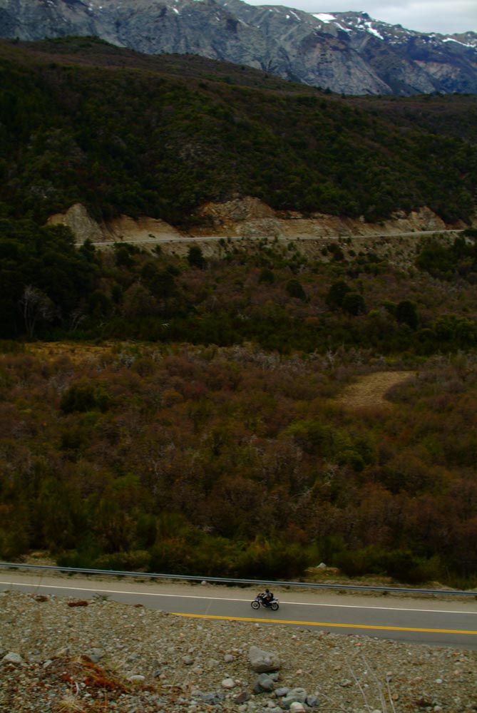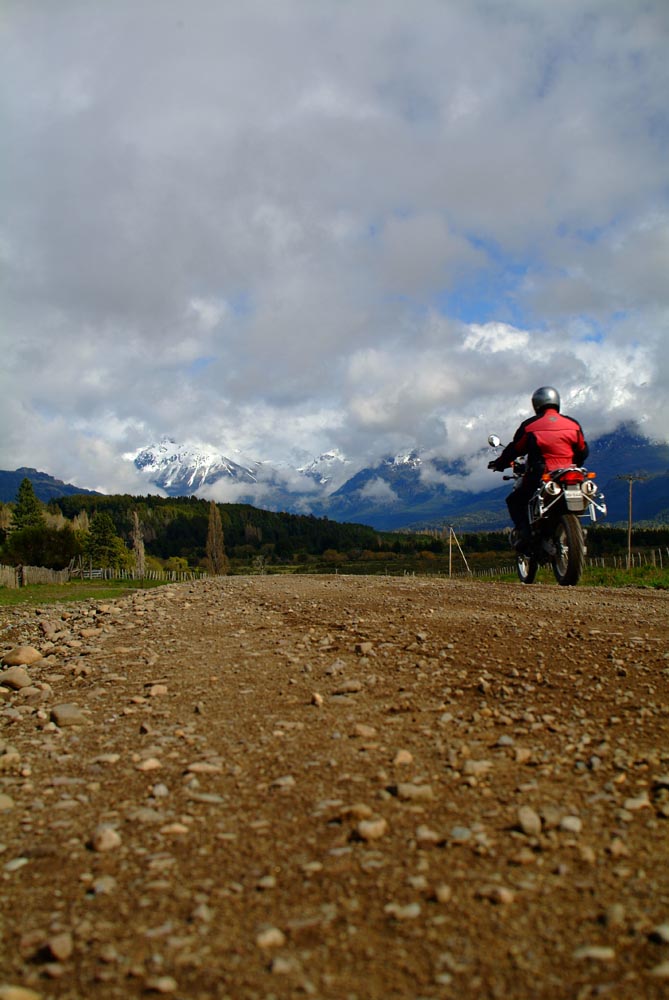 Het Andesgbergte bepaalt het klimaat in dit deel van de wereld. De westkant krijgt veel regen en is groen en vruchtbaar, de oostkant is droog omdat de regen tegen de oostkant van het gebergte blijft hangen. En wij slingeren drie weken lang door deze tegenstellingen, en gaan een keer of zeven de grenzen tussen Chili en Argentinië over. Zo leeg als het hier is, zo vol zijn onze hoofden met reisverwachtingen. In het Chileense plaatsje Osorno haalden we onze motoren op, met als reisdoel dus het Argentijnse Ushuaia, om dan via een korte slinger in de omgeving van het Chileense natuurpark Torres del Paine de fietsen op de boot terug naar Osorno te zetten. Meteen de eerste rijdag reden we naar het Argentijnse Bariloche, een studentikoze moderne stad, ademloos gelegen aan het azuurblauwe Nahuel Huapi meer, omringd door de bergen. De netheid van dit plaatsje en de omgeving lijken een beetje op de aangeharkte netheid van de Zwitserse Alpen, maar dan wel met een Latin swing.