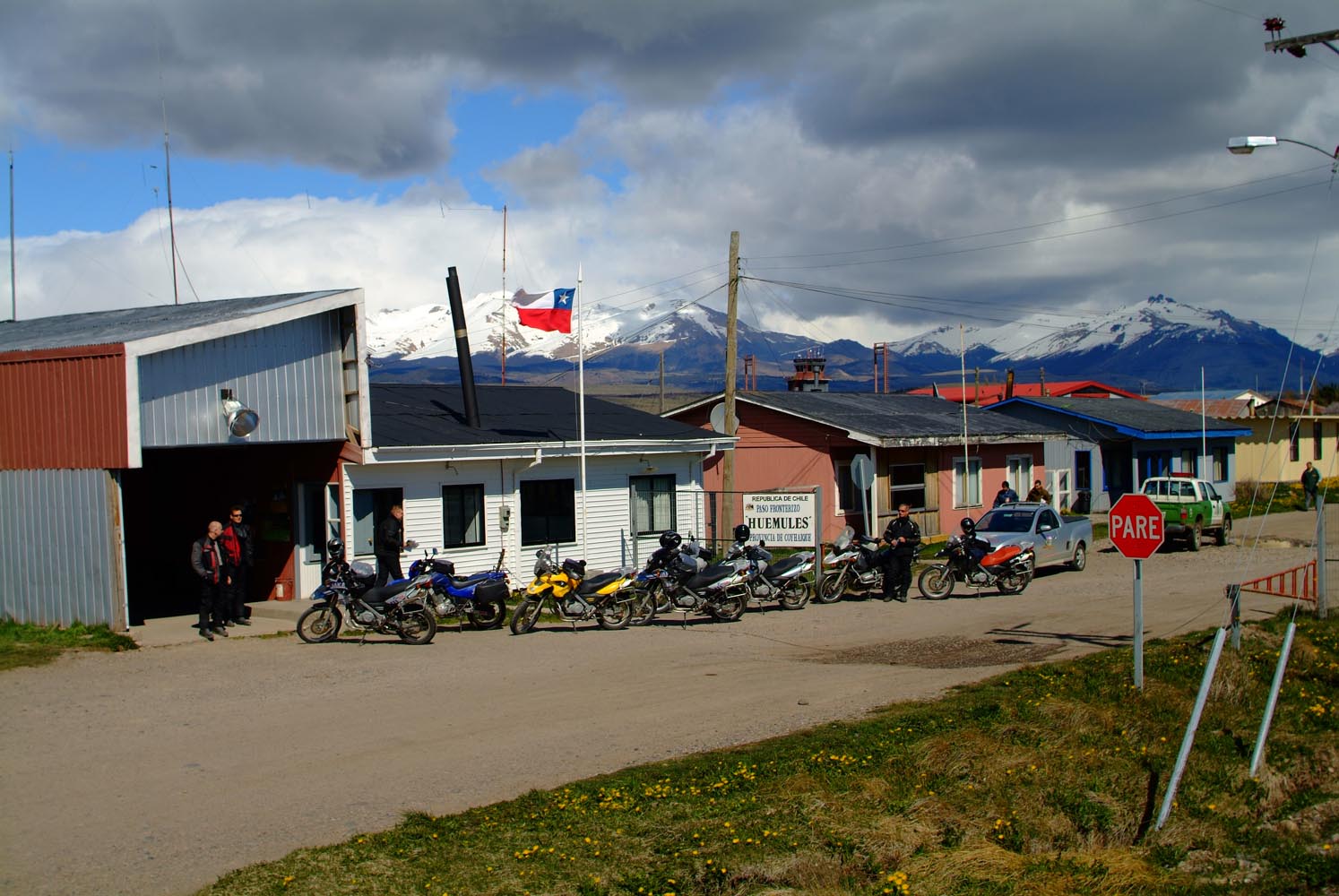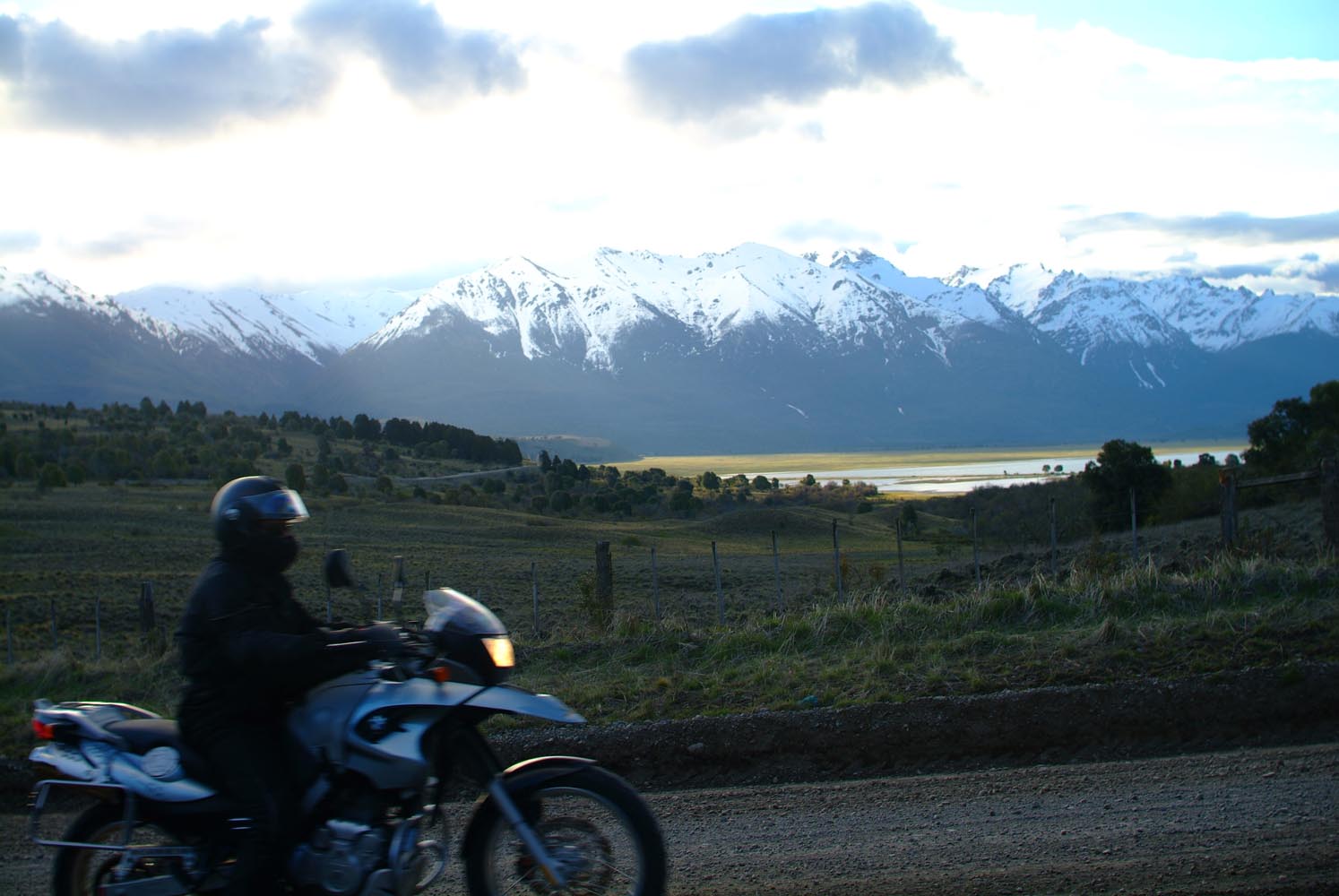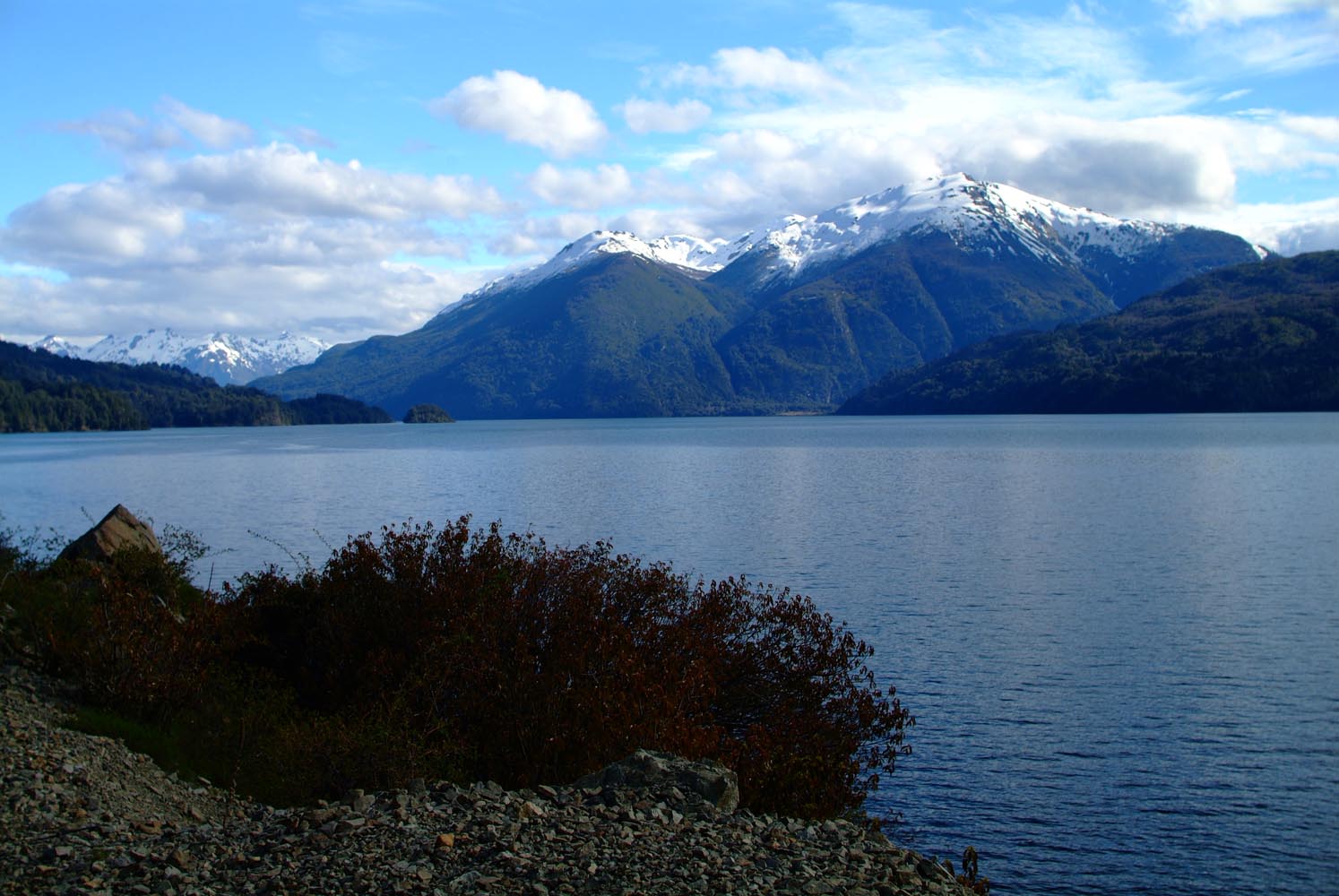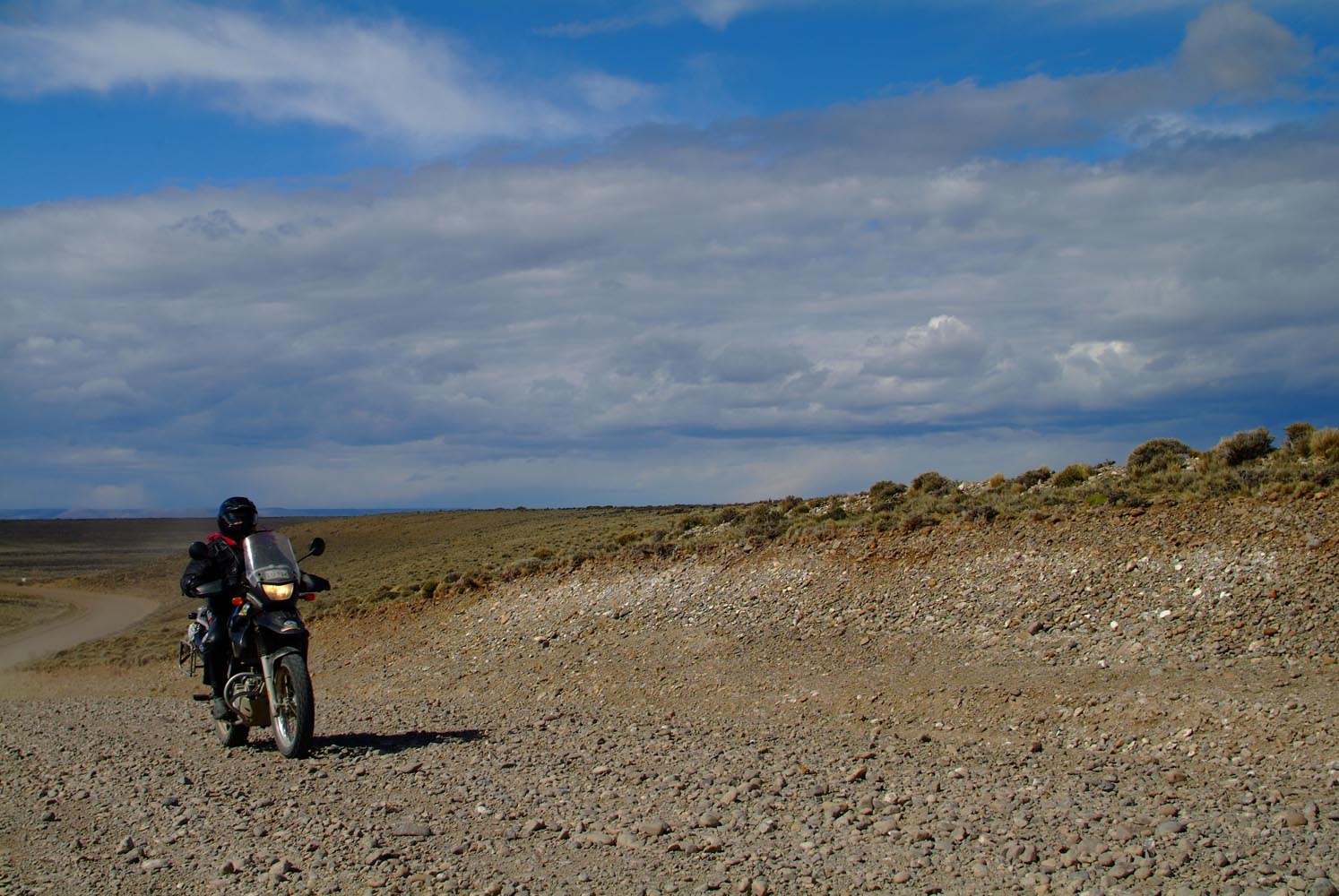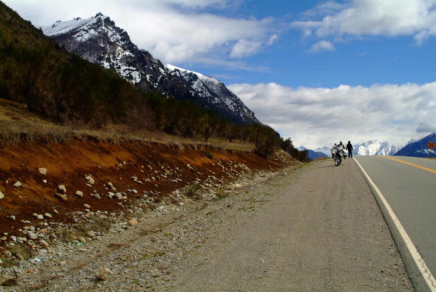Het Andesgbergte bepaalt het klimaat in dit deel van de wereld. De westkant krijgt veel regen en is groen en vruchtbaar, de oostkant is droog omdat de regen tegen de oostkant van het gebergte blijft hangen. En wij slingeren drie weken lang door deze tegenstellingen, en gaan een keer of zeven de grenzen tussen Chili en Argentinië over. Zo leeg als het hier is, zo vol zijn onze hoofden met reisverwachtingen. In het Chileense plaatsje Osorno haalden we onze motoren op, met als reisdoel dus het Argentijnse Ushuaia, om dan via een korte slinger in de omgeving van het Chileense natuurpark Torres del Paine de fietsen op de boot terug naar Osorno te zetten. Meteen de eerste rijdag reden we naar het Argentijnse Bariloche, een studentikoze moderne stad, ademloos gelegen aan het azuurblauwe Nahuel Huapi meer, omringd door de bergen. De netheid van dit plaatsje en de omgeving lijken een beetje op de aangeharkte netheid van de Zwitserse Alpen, maar dan wel met een Latin swing.