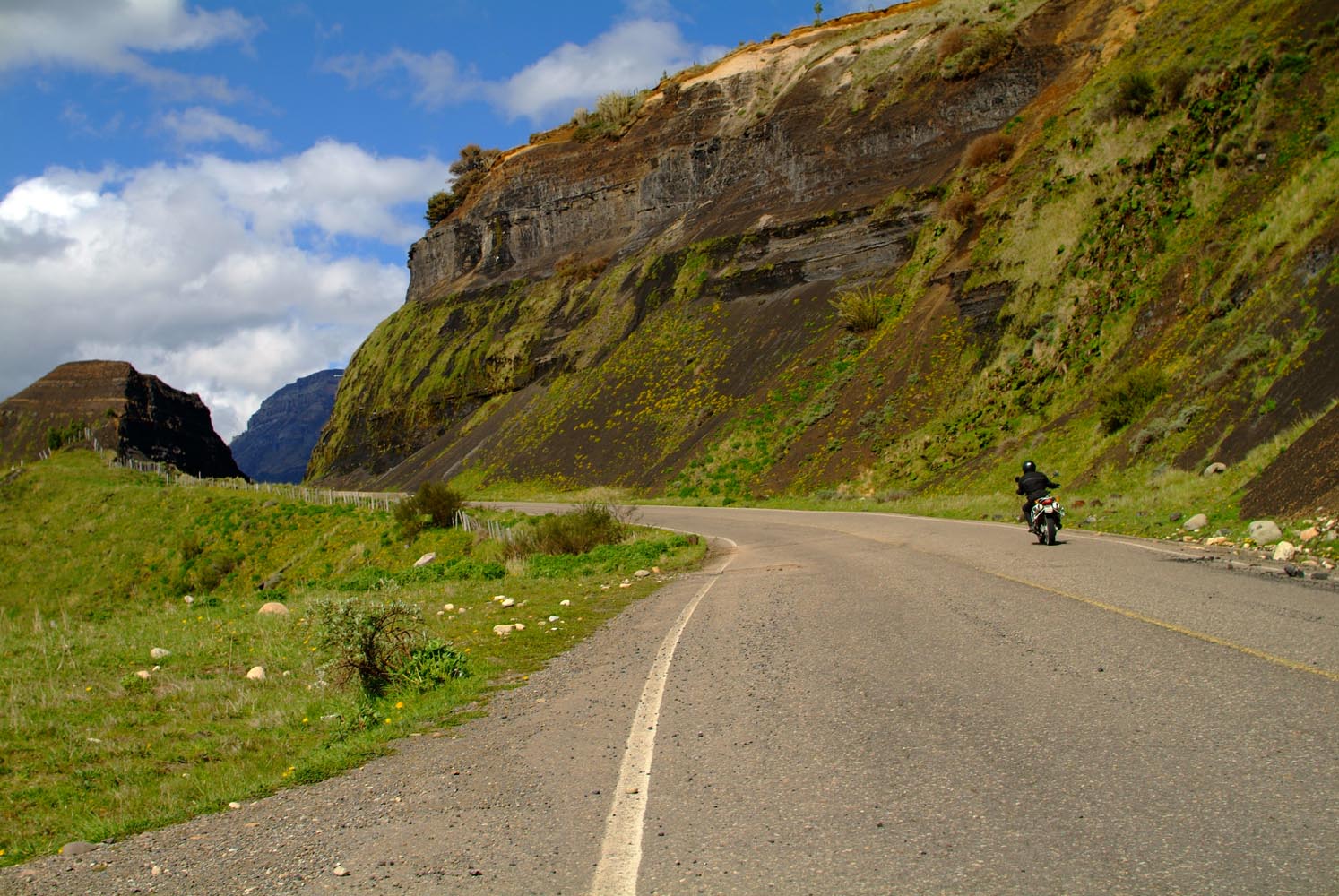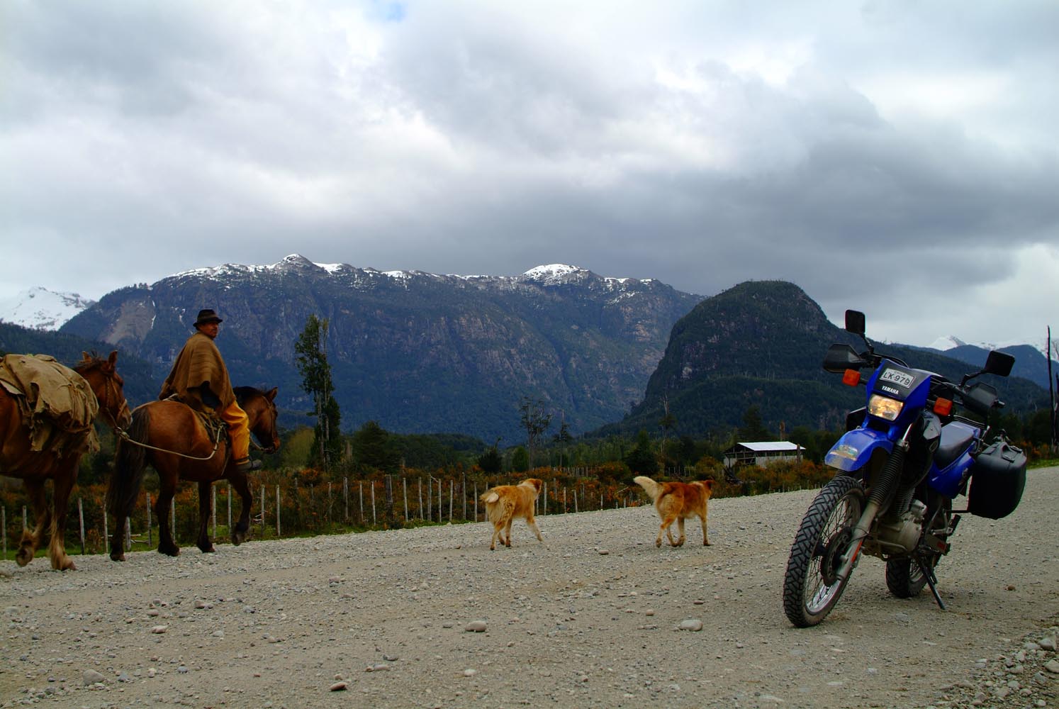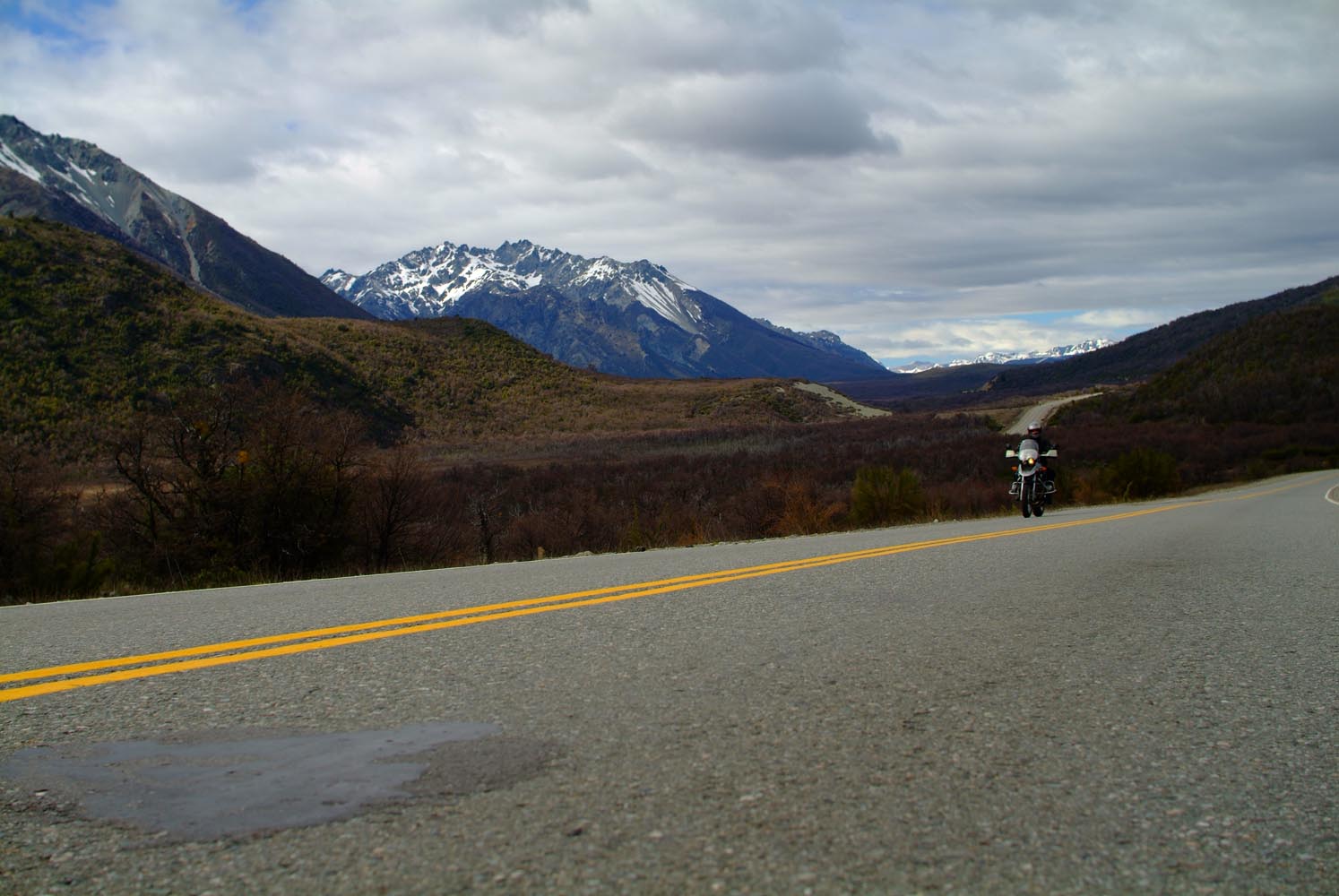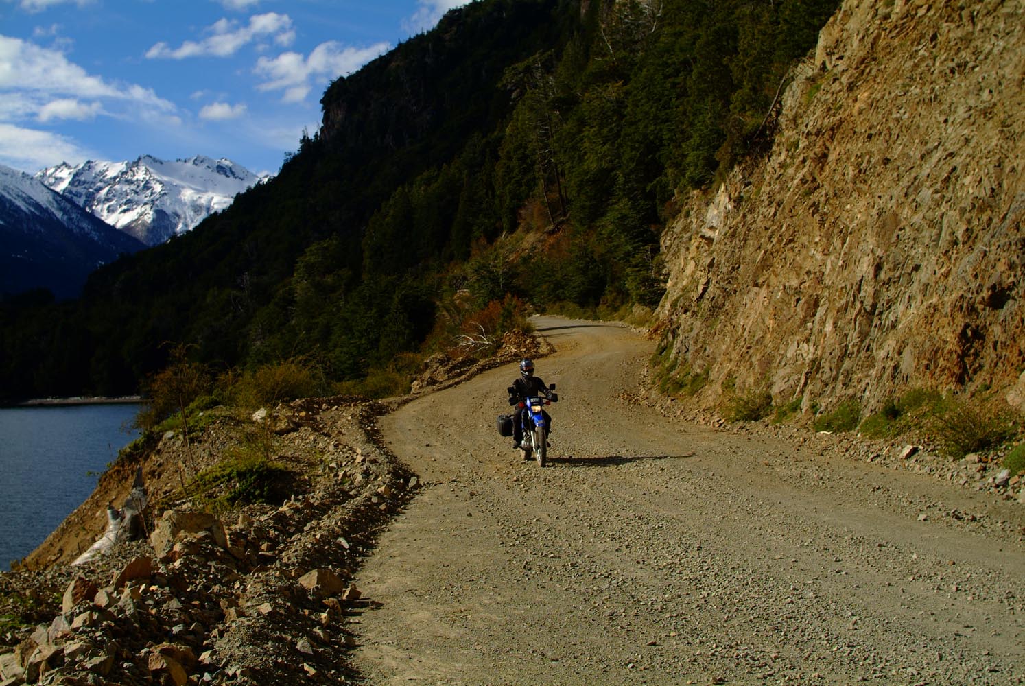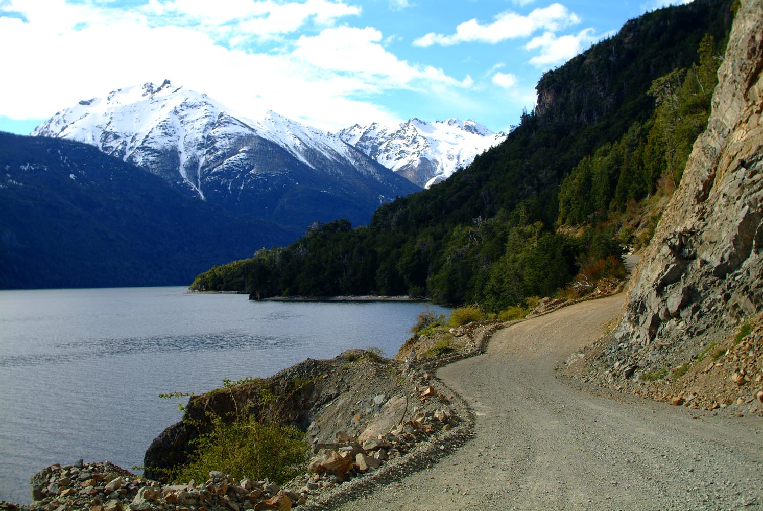Het Andesgbergte bepaalt het klimaat in dit deel van de wereld. De westkant krijgt veel regen en is groen en vruchtbaar, de oostkant is droog omdat de regen tegen de oostkant van het gebergte blijft hangen. En wij slingeren drie weken lang door deze tegenstellingen, en gaan een keer of zeven de grenzen tussen Chili en Argentinië over. Zo leeg als het hier is, zo vol zijn onze hoofden met reisverwachtingen. In het Chileense plaatsje Osorno haalden we onze motoren op, met als reisdoel dus het Argentijnse Ushuaia, om dan via een korte slinger in de omgeving van het Chileense natuurpark Torres del Paine de fietsen op de boot terug naar Osorno te zetten. Meteen de eerste rijdag reden we naar het Argentijnse Bariloche, een studentikoze moderne stad, ademloos gelegen aan het azuurblauwe Nahuel Huapi meer, omringd door de bergen. De netheid van dit plaatsje en de omgeving lijken een beetje op de aangeharkte netheid van de Zwitserse Alpen, maar dan wel met een Latin swing.