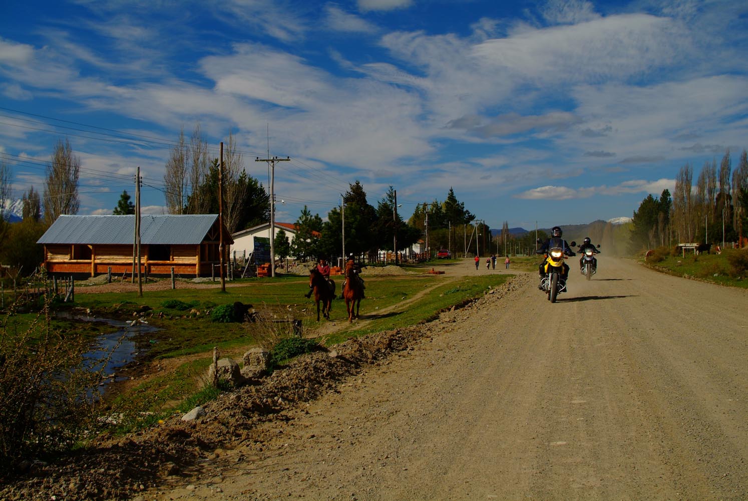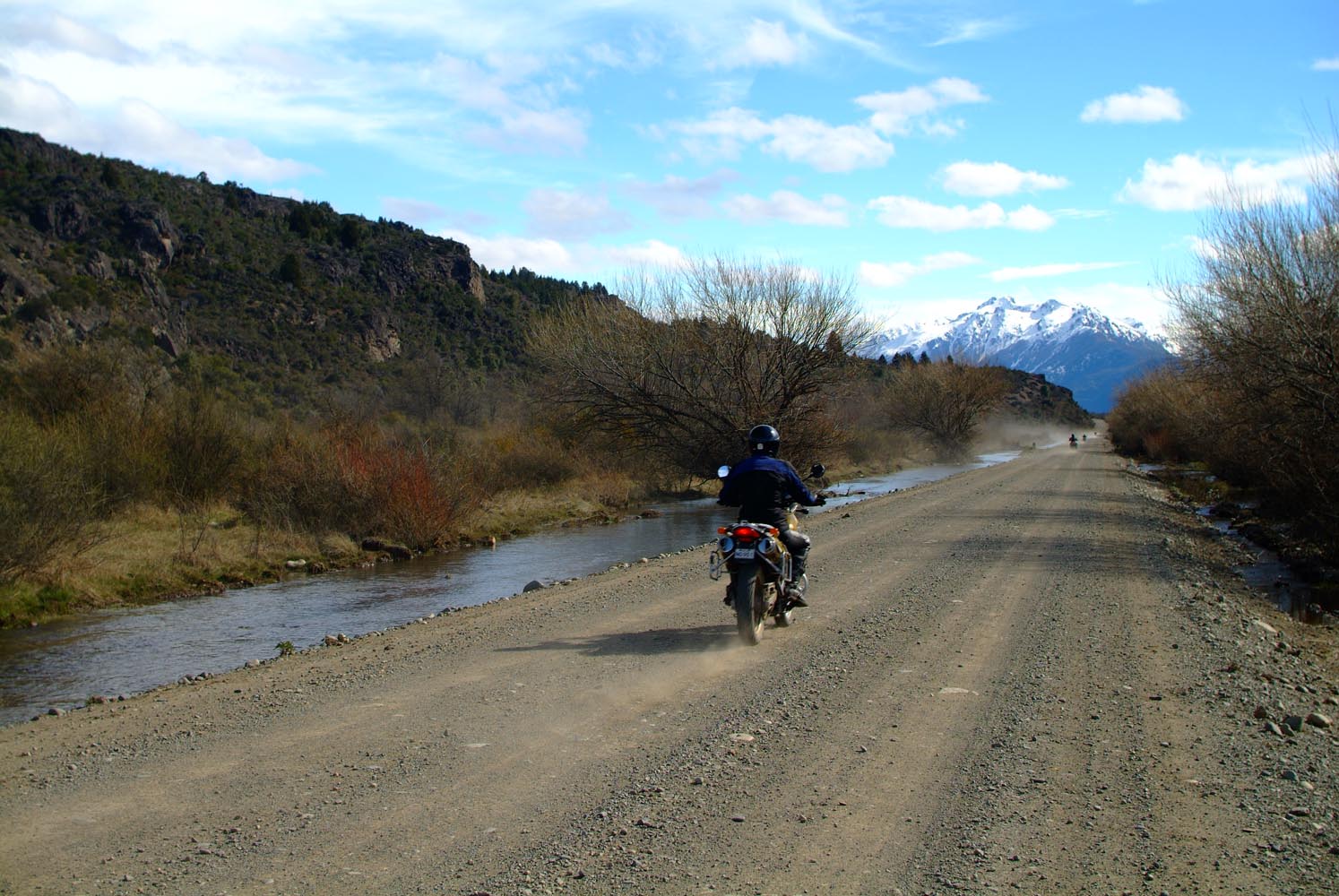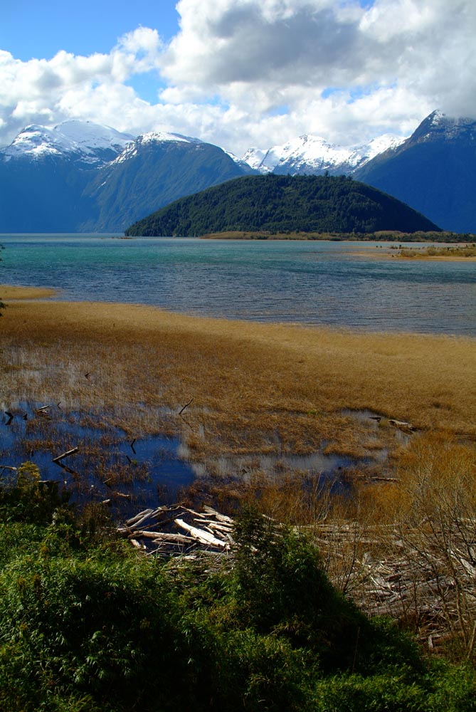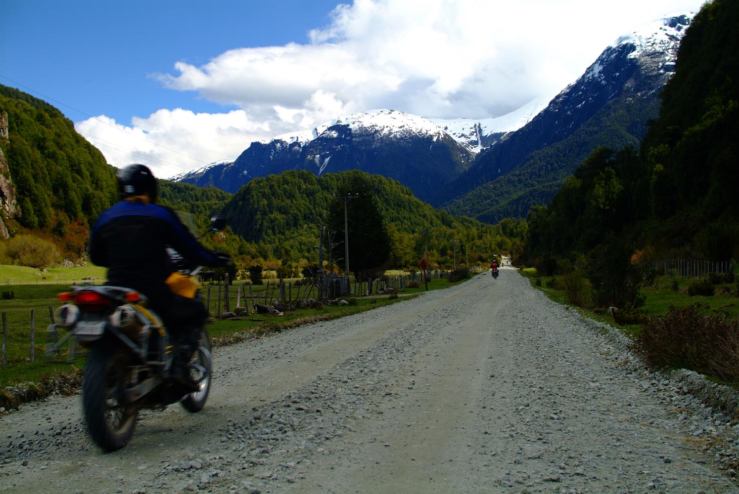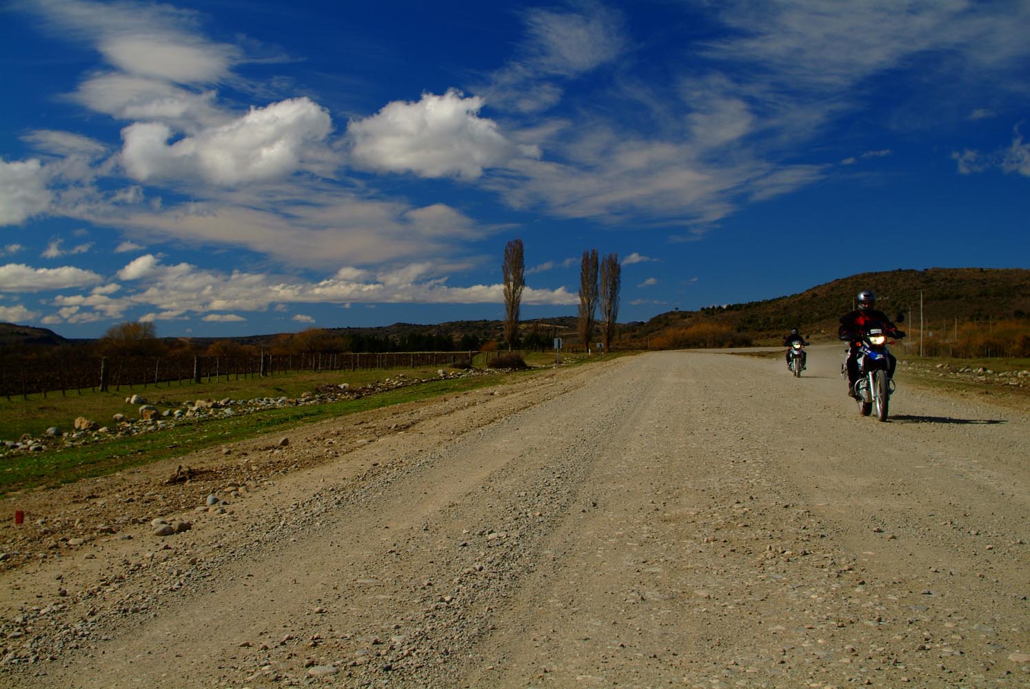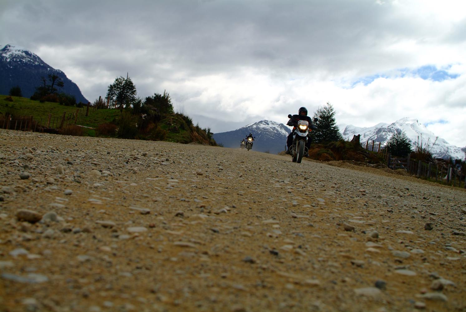 Het Andesgbergte bepaalt het klimaat in dit deel van de wereld. De westkant krijgt veel regen en is groen en vruchtbaar, de oostkant is droog omdat de regen tegen de oostkant van het gebergte blijft hangen. En wij slingeren drie weken lang door deze tegenstellingen, en gaan een keer of zeven de grenzen tussen Chili en Argentinië over. Zo leeg als het hier is, zo vol zijn onze hoofden met reisverwachtingen. In het Chileense plaatsje Osorno haalden we onze motoren op, met als reisdoel dus het Argentijnse Ushuaia, om dan via een korte slinger in de omgeving van het Chileense natuurpark Torres del Paine de fietsen op de boot terug naar Osorno te zetten. Meteen de eerste rijdag reden we naar het Argentijnse Bariloche, een studentikoze moderne stad, ademloos gelegen aan het azuurblauwe Nahuel Huapi meer, omringd door de bergen. De netheid van dit plaatsje en de omgeving lijken een beetje op de aangeharkte netheid van de Zwitserse Alpen, maar dan wel met een Latin swing.