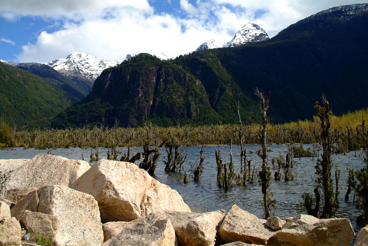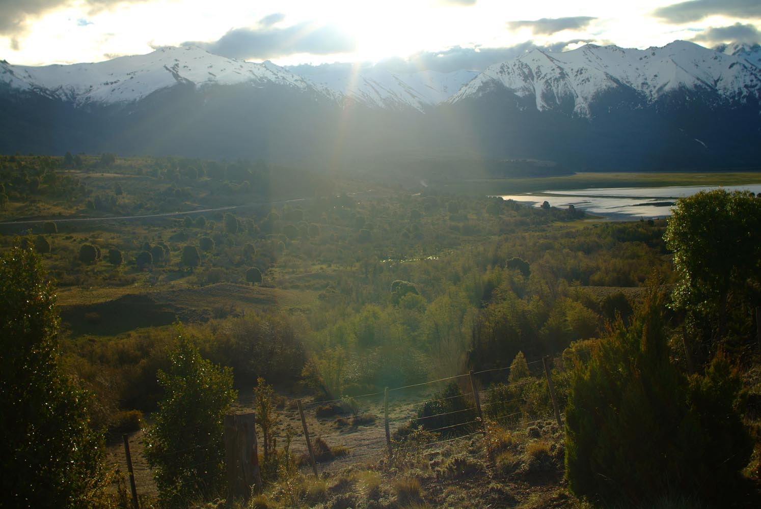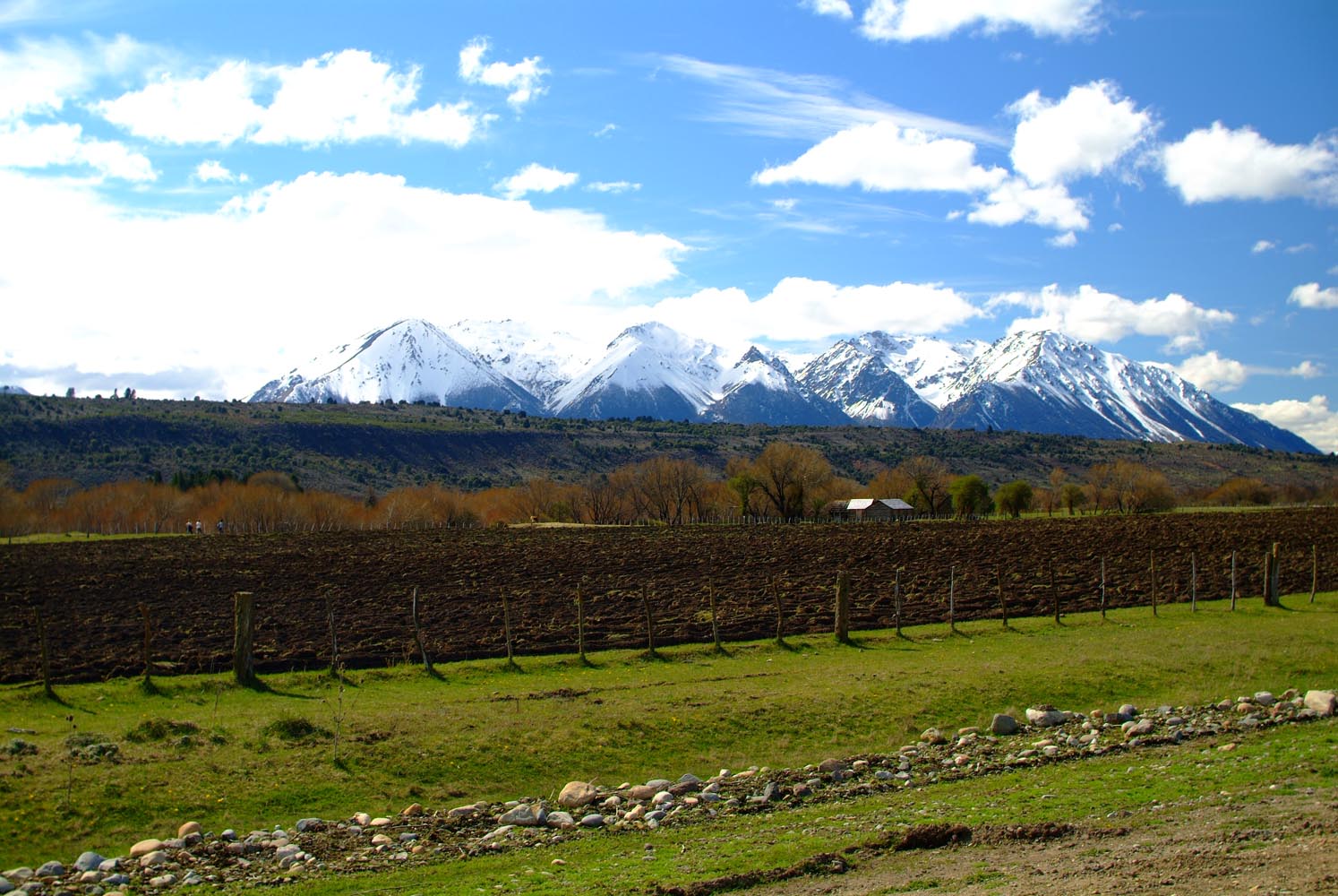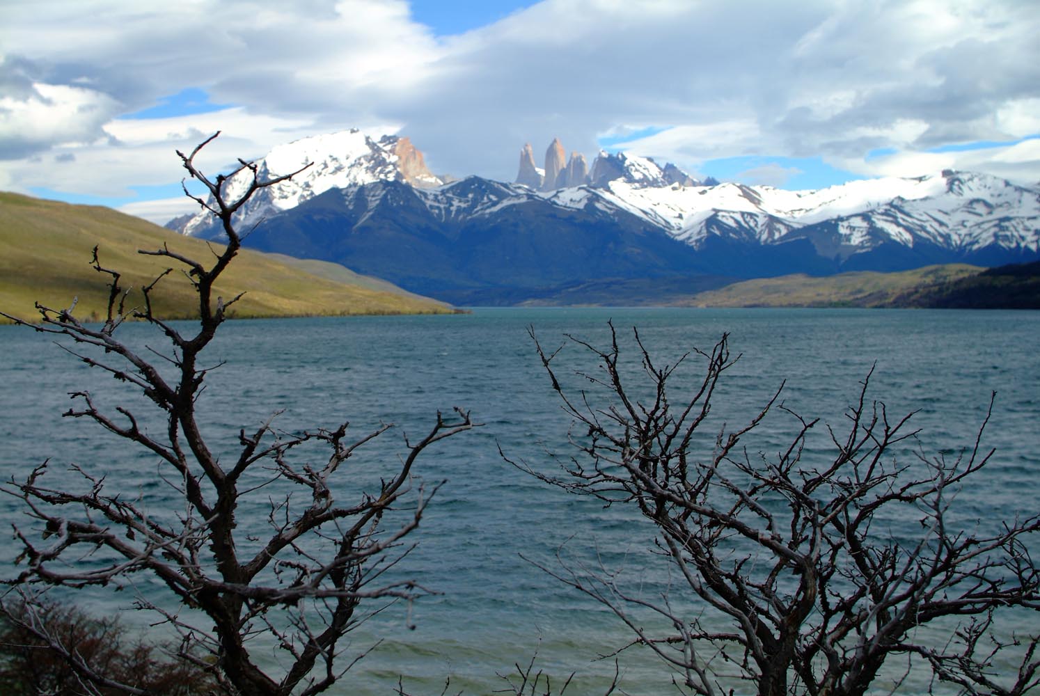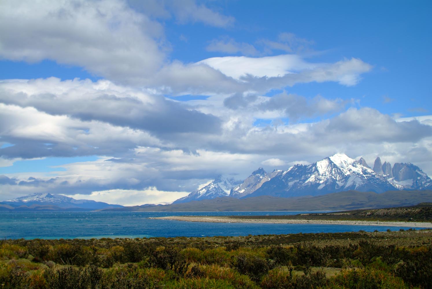 Het Andesgbergte bepaalt het klimaat in dit deel van de wereld. De westkant krijgt veel regen en is groen en vruchtbaar, de oostkant is droog omdat de regen tegen de oostkant van het gebergte blijft hangen. En wij slingeren drie weken lang door deze tegenstellingen, en gaan een keer of zeven de grenzen tussen Chili en Argentinië over. Zo leeg als het hier is, zo vol zijn onze hoofden met reisverwachtingen. In het Chileense plaatsje Osorno haalden we onze motoren op, met als reisdoel dus het Argentijnse Ushuaia, om dan via een korte slinger in de omgeving van het Chileense natuurpark Torres del Paine de fietsen op de boot terug naar Osorno te zetten. Meteen de eerste rijdag reden we naar het Argentijnse Bariloche, een studentikoze moderne stad, ademloos gelegen aan het azuurblauwe Nahuel Huapi meer, omringd door de bergen. De netheid van dit plaatsje en de omgeving lijken een beetje op de aangeharkte netheid van de Zwitserse Alpen, maar dan wel met een Latin swing.