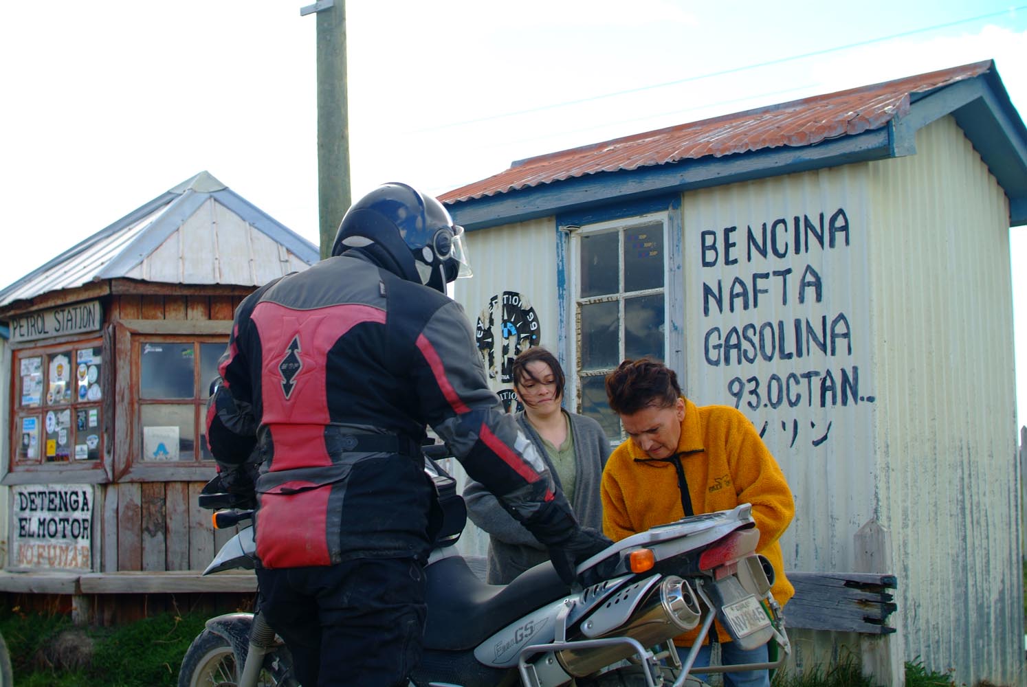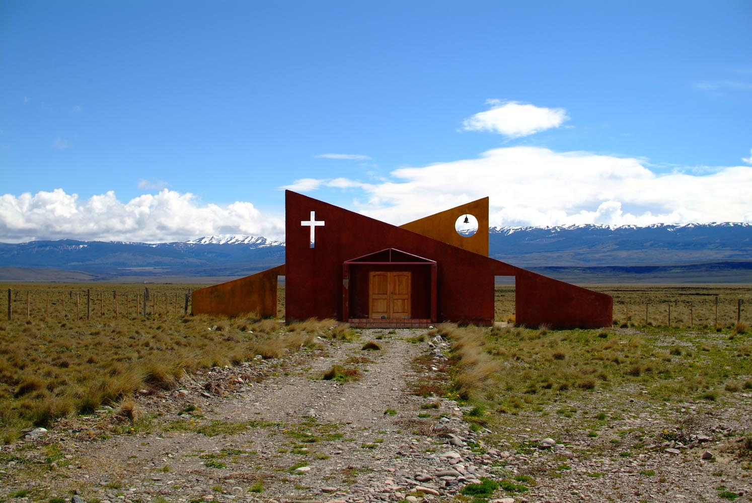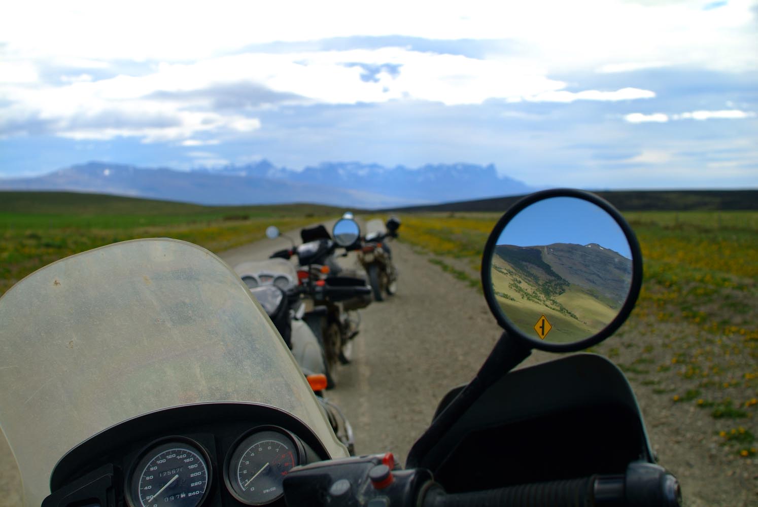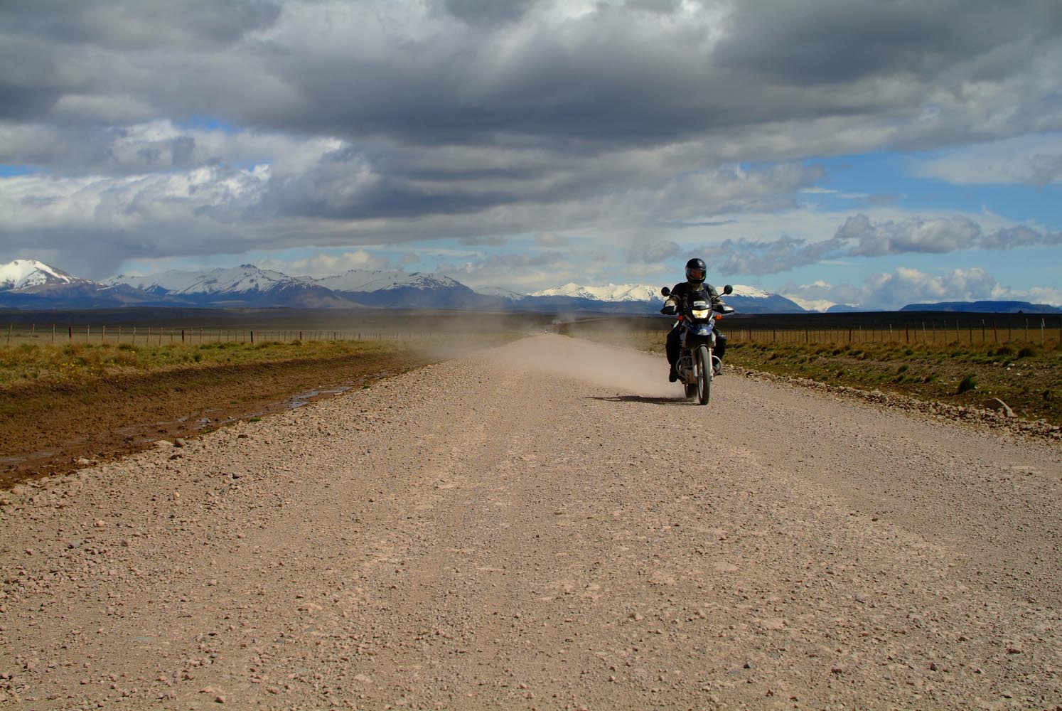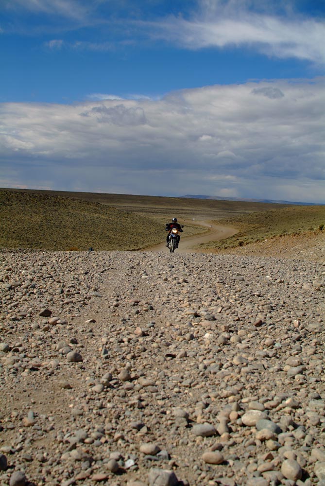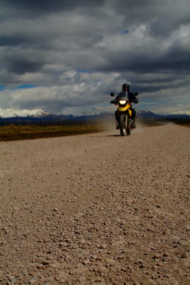 Bij La Angostura klapwiekt de windmolen een minimale stroomtoevoer bij elkaar. Via een hek met een ingewikkelde draadconstructie betreden we en moto het terrein. De schapen mogen niet ontsnappen. Weer die ontvangst met hoefijzers, oude geweren en opgezette dieren. Het Wilde Westen bestaat nog, maar wel in het diepe zuiden. Onze BMW’s en mijn XT600 vreten het prairiestof moeiteloos, onderweg naar El Chalten, dat ineens weer aan de voet van de Andes ligt. Het is een maf dorp, het ruikt nog nieuw, en is door de Argentijnen uit de grond gestampt om het land te kunnen claimen, voordat Chili dat zou doen. Maar er zijn slechtere locaties om politieke trucjes uit te halen.