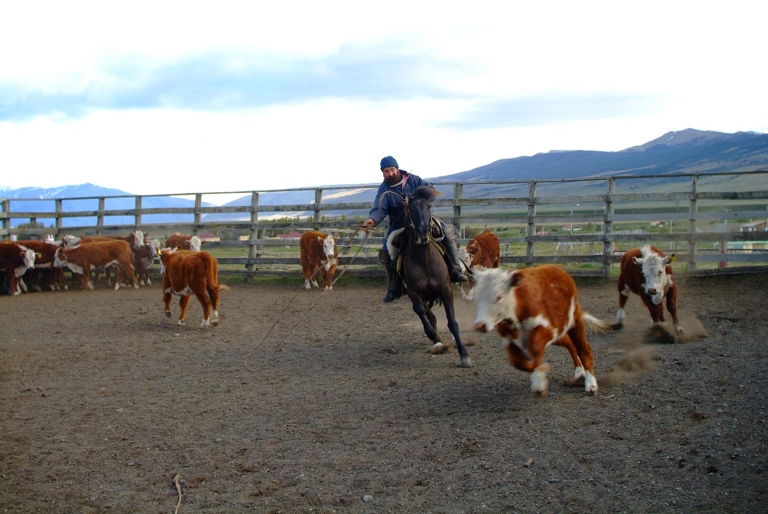 Vandaag vervolgen we onze route over de Austral, maar nu dwars door donkergroen regenwoud, op weg naar het complete contrast de volgende dag, als we via het plaatsje Coihaique de grens weer oversteken naar Argentinië: ineens rijden we over de pampa’s . Het Argentinië zoals ik me dat had voorgesteld. De grenspost is een tochtgat, met een smoezelige douanier die de beschikking heeft over een ventilator – en het waait hier toch lekker – en een stempelkussen. En een snor, als vanzelfsprekend. Het is duidelijk dat we nu aan de droge kant van de Andes zijn, als we nog 350 km afleggen naar Estancia Telken, een actieve boerderij, gerund door een oud echtpaar met Nederlandse en Nieuw-Zeelandse wortels, Coco (78) en Petty (74). Als we aankomen, komen net de cowboys terug met de paarden en schapen. De vrouw des huizes, Petty, laat trots een bedankkaartje, geschreven door prinses Maxima, zien. Coco probeert nog wat Nederlands te praten, maar dat is voor hem een taal van vervlogen tijden. Een groot fornuis in het midden van de keuken, een zenuwachtige kokkin die na complimentjes van onze kant bijna tranen in haar ogen krijgt (Petty: ‘Het is haar eerste keer koken voor een groep bij ons.’) en warm haardvuur. Estancia Telken voelt als thuis, in een omgeving die ons een gevoel van ontheemdheid bezorgt.