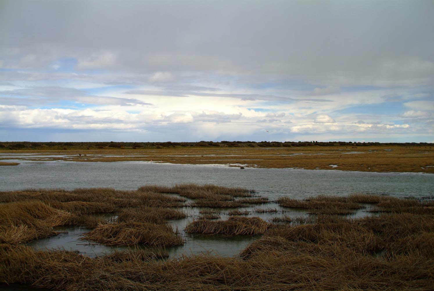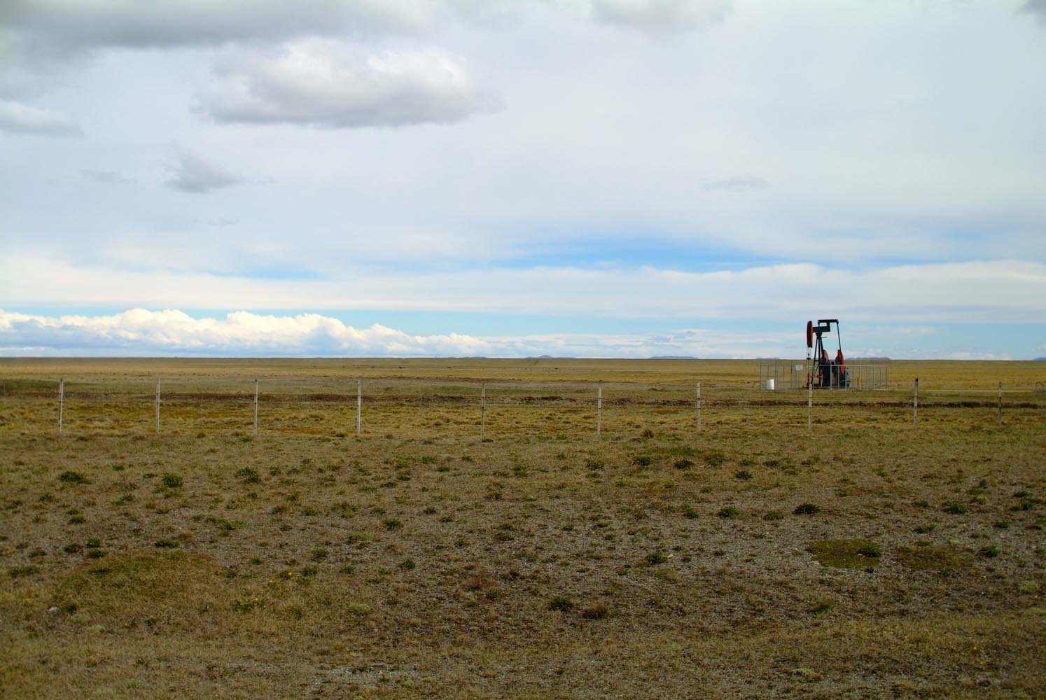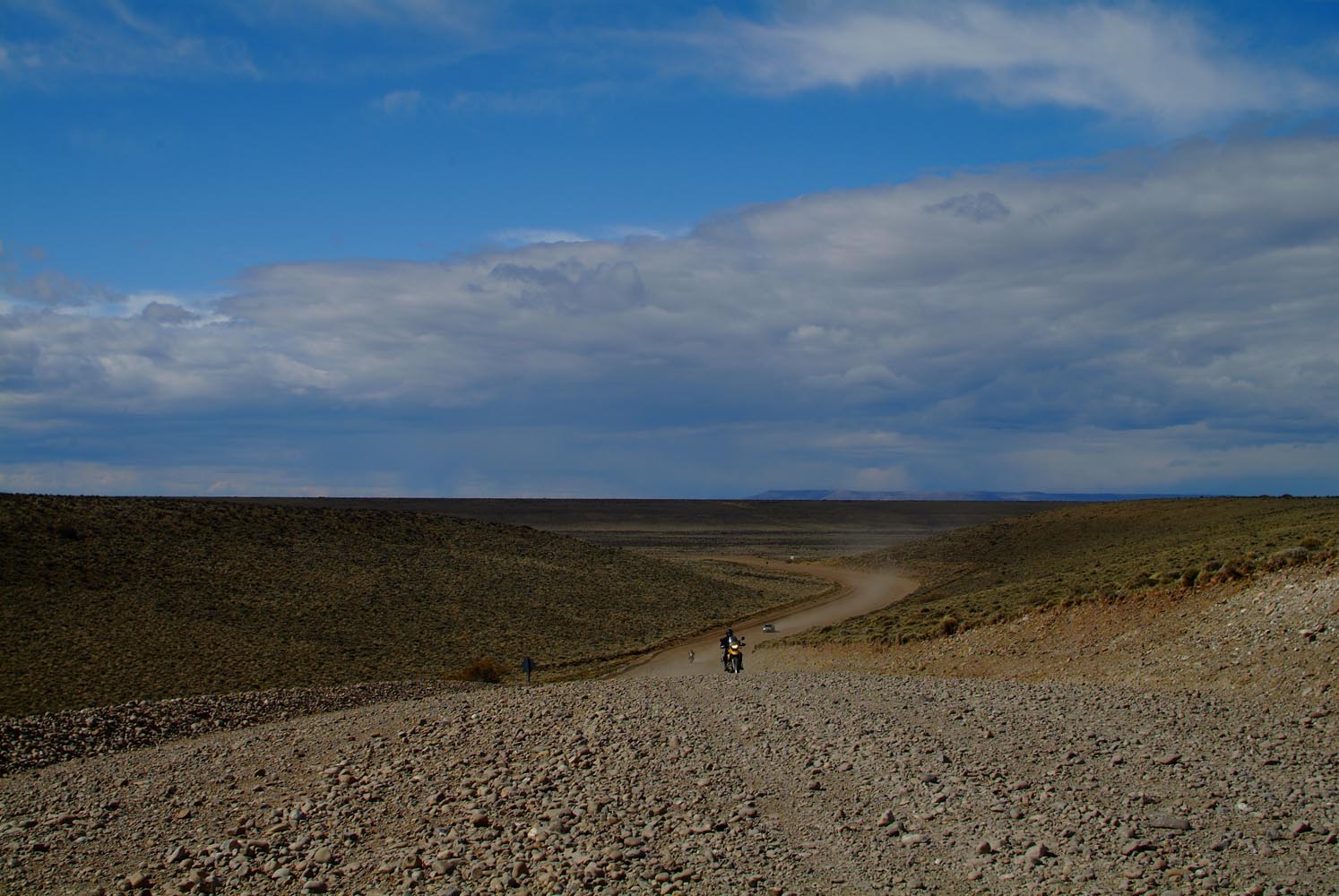 Een van m’n reisgenoten kan geen weerstand meer bieden aan de wind en de motor vertrekt tot drie maal toe diagonaal over het gravel richting greppel en kiept om zonder schade. Afstappen om te helpen gaat ook niet zomaar, dan moet iemand anders mijn motor weer vasthouden. Kwestie van de eigen fiets helemaal scheef tegen de wind in zetten, en dan hangen aan mijn motor. Trouwens, de gedachten van wie dan ook dwalen hier af, in dit zuidelijkste deel van Zuid-Amerika. Ineens ontwaren we leven op deze pampa’s: een kudde schapen. Maar zelfs de schapen kijken peinzend. Dat kan ook komen omdat er voor de vierhoevigen hetzelfde dorre gras als altijd op het menu staat, en de hoop eens een sappig madeliefje of groene zuring te vinden vandaag al weer ijdel bleek. Hier werken nog echte cowboys –de gauchos- die de schapenkudde bij elkaar drijven.