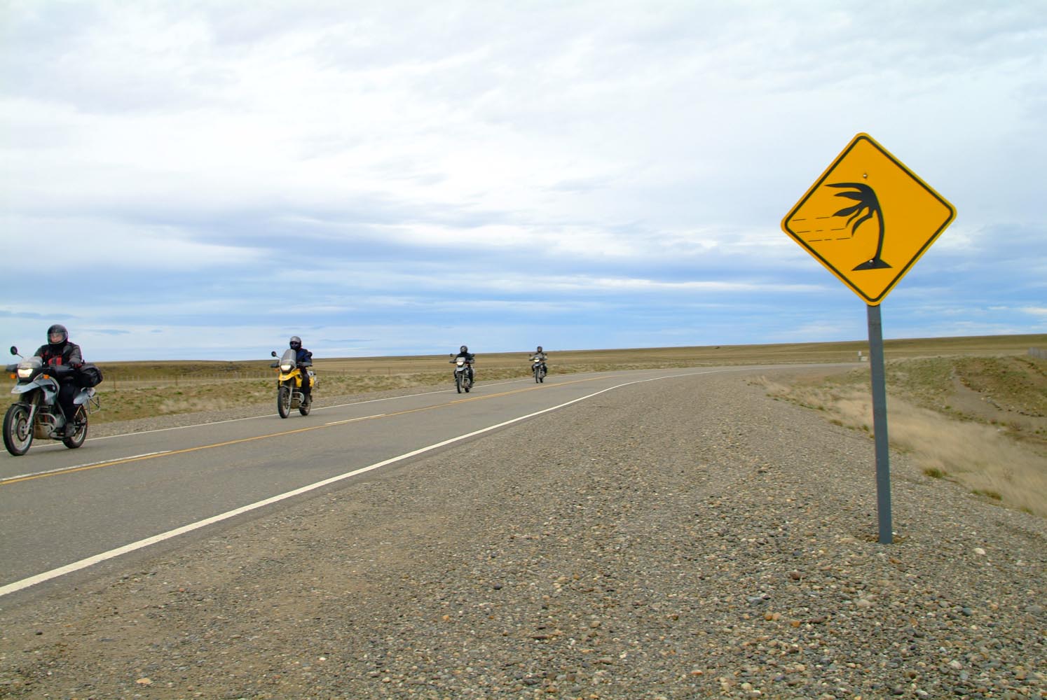 Als motorrijder heb je in Patagonië en vooral in het lege Vuurland te veel tijd om na te denken. Over het meteorologische verschijnsel wind bijvoorbeeld. Wat is die onzichtbare kracht, die zo beukt, me bijna omver duwt, als een soort hoongelach buldert dwars door helm en oordoppen heen? De wind op Vuurland vlamt. In dit unheimische gebied is hij zo dominant, dat hij bijna het enige lijkt dat er is. Een onzichtbaar houvast. Op deze vlakte is niets. Geen boom, geen tegenligger, geen huis. Alleen die wind, en een schijnbaar oneindige gravelweg. En wij op onze motoren. Het bordje dat ons alsnog wil waarschuwen voor deze luchtstroom komt hilarisch over: het is een schets van een boom die last heeft van zijwind. Leegte is een woord waarvan de betekenis hier een tegenstelling in zich draagt: het betekent ‘niets’, terwijl wij er al uren in rijden.