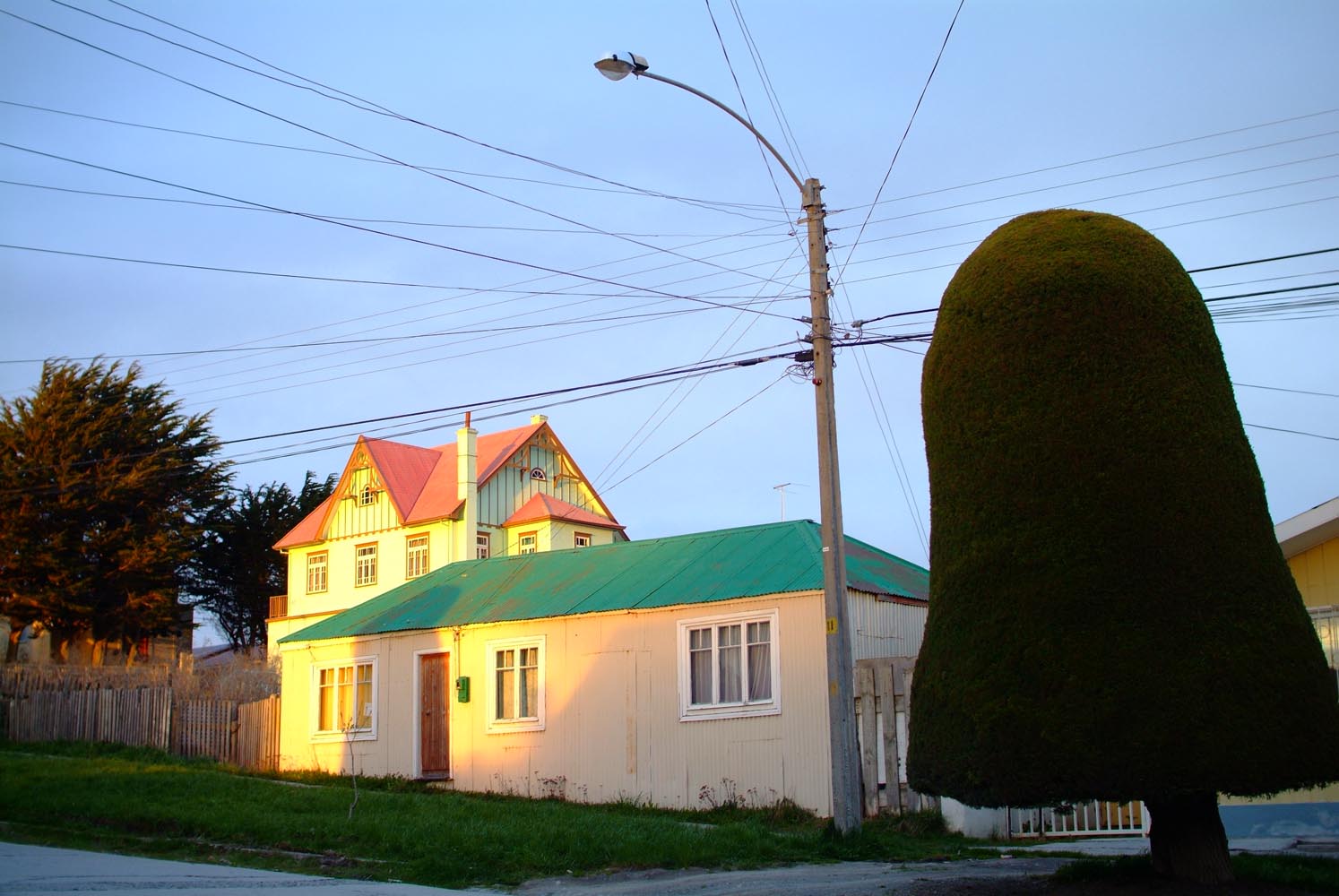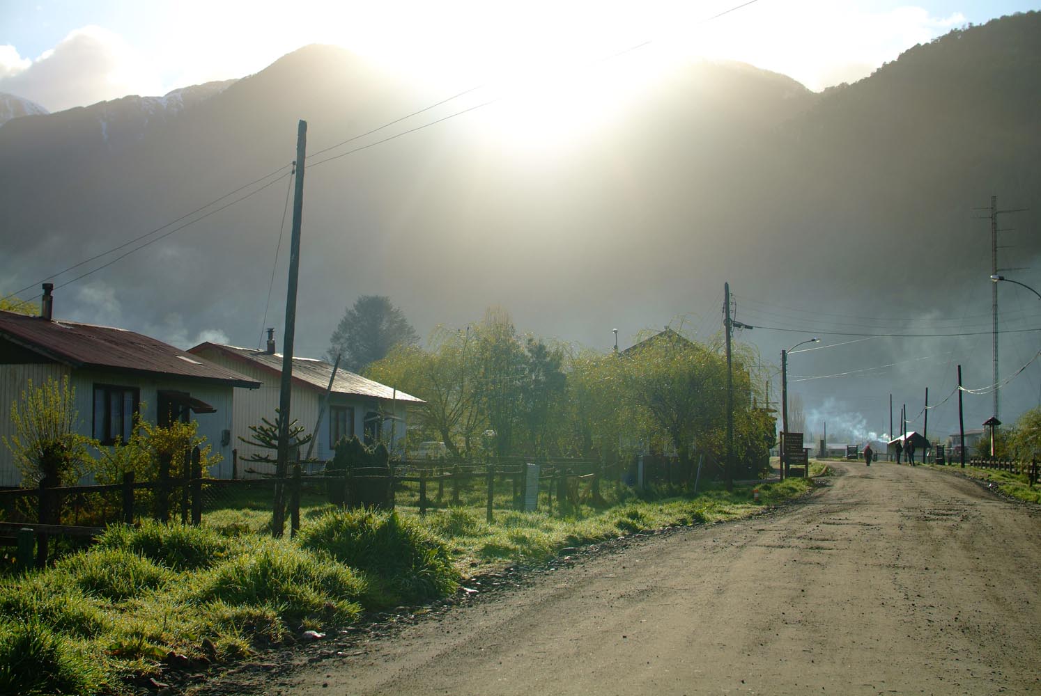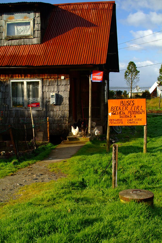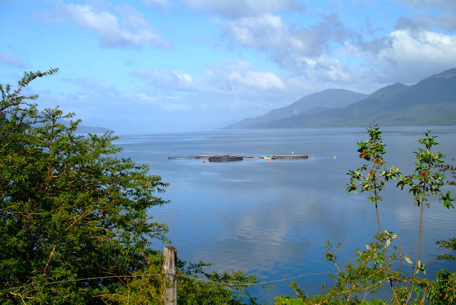 En op weg naar Puyuhuapi gaan we de grens weer over. Het Argentijnse deel toont sober, met afgebladderde verf en een scheef staande grenspost. Argentinië heeft na de zware economische crisis in 2001 duidelijk een achterstand op het relatief welvarende (en voor ons ook een stuk duurdere) Chili. Aangekomen met onze paperassen bij de Chileense post ziet het er allemaal een stuk strakker uit. En strenger. De Chilenen zijn als de dood dat er veeziekten het land worden ingebracht, dus zuivel, vleeswaren en fruit zijn verboden om in te voeren. We hopen dat onze Argentijnse knoflookworst er niet tussenuit gevist wordt, want vanmiddag rijden we voor het eerst op de Carretera Austral – een ‘onverharde snelweg’, waar we heel graag willen picknicken met uitzicht op de besneeuwde Andes-toppen. Dit is bikers paradise bijna geen tegenliggers, goed aangereden gravel, en gletsjers, kraakheldere meren, haarspeldbochten. En aan het eind van de dag een Duits dorp met de typisch Duitse naam Puyuhuapi. De zon is wat bleekjes, maar is er in ieder geval, en werpt een gouden gloed over het plaatsje en zijn typische houten villa’s, dat ligt aan een fjord van de Pacific. Zeshonderd mensen wonen hier. Van oorsprong is het een nederzetting van vier Duitsers, die hier in 1932 hun geluk zochten – en zalm en hout. Onze gastvrouw is ook Duits. Deutsche Grundlichkeit in de met hout warmgestookte villa, en ze kijkt een beetje streng, maar ze regelt wel dat het enige restaurant in het dorp vanavond verse zalm of biefstuk voor ons kan maken. Waar die zalm vandaan komt, zien we een dag later. De slaap nog niet uit de ogen gewreven. We zien zeehonden in de baai, die wel erg veel interesse hebben in de grote zalmkwekerijen die drijven in het zeewater.