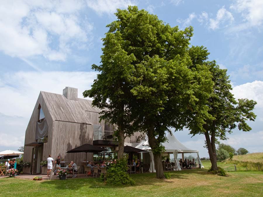 Tweede wat opvalt. Ergens richting Sprang-Capelle, we zijn dan halverwege, verandert het landschap van intiem, bosrijk en kleinschalig in open, licht en ruim. Waar we eerst over populierenlaantjes reden, belanden we nu op kaarsrechte strepen asfalt en, jazeker, heuse dijkjes waar we in de heupen mogen. Anders gezegd: van de Brabantse zandgronden zijn we in het rivierenland terechtgekomen en ook daarvan pikt Brabant een graantje mee.