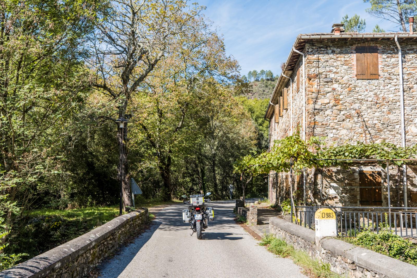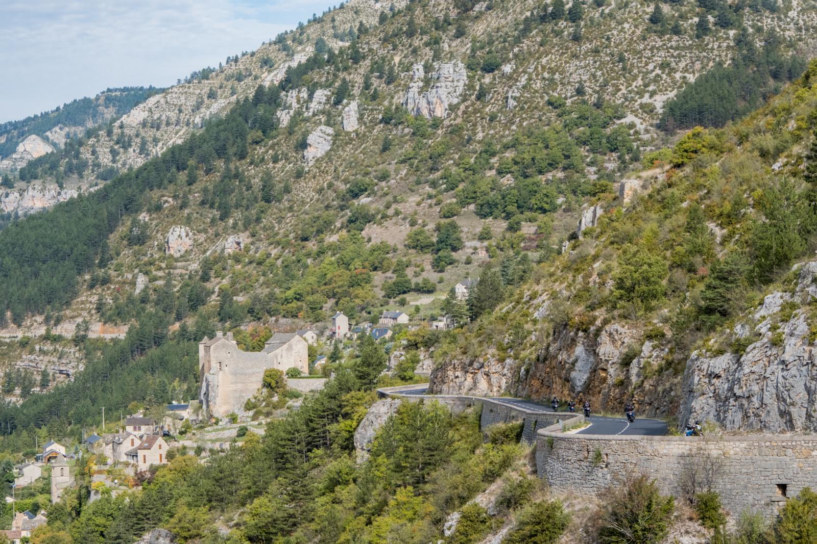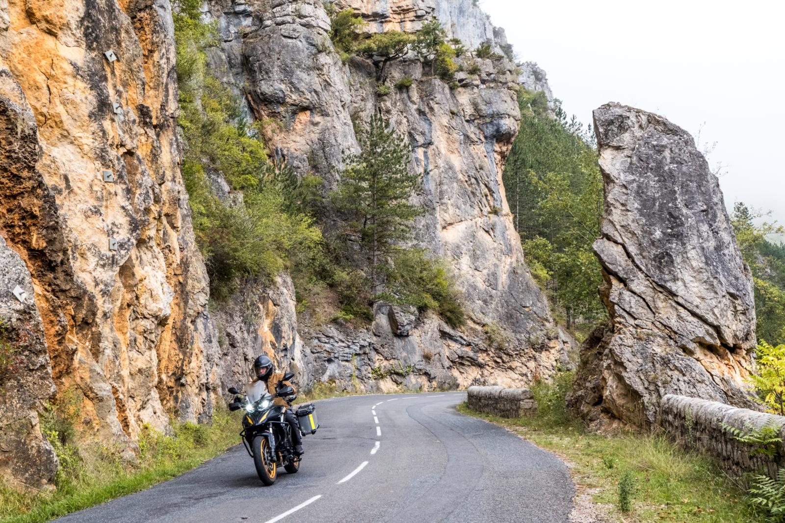 De vallei van de Tarn is een motorklassieker met tunnels, overhangende rotswanden, steile afgronden, gehuchten met een handvol huizen en bijna verlaten dorpen. Met de banden op temperatuur kan ik de motor vlotter door de bochten loodsen. Kijken, insturen, gas erbij. Het gaat bijna vanzelf.