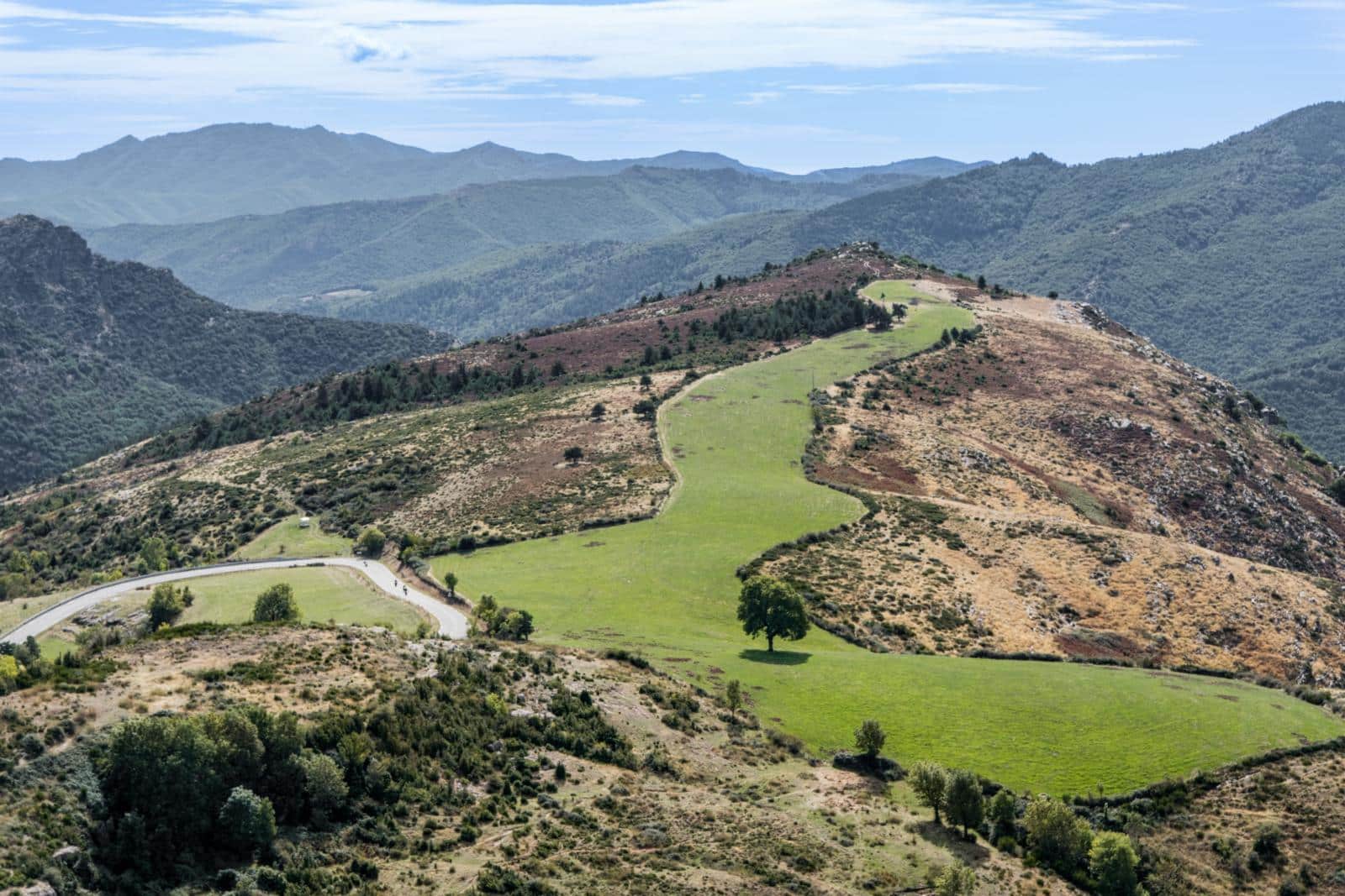 In La Malène ga ik er eens goed voor zitten: steile wand rijden. Bijna loodrecht naar boven via een tiental haarspeldbochten. Eenmaal op de top wacht de Causse Méjean, een van de hoogvlaktes waar de Cevennen om bekend staan. Rijden door het grote niets. Prachtig. Verlaten wegen leiden me door kleine nederzettingen zoals Le Buffre, velden met paarden, gestapelde muurtjes en herinneringen aan vroeger zoals stenen huisjes die als broodoven werden gebruikt en een dorsvloer van natuursteen.