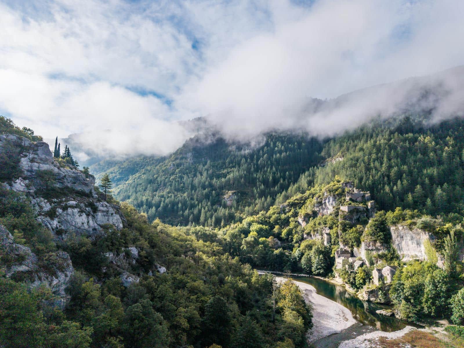Zware wolken hangen in de vallei van de rivier de Tarn. De hoge rotswanden verdwijnen in de mist. Vocht kruipt langs de kieren van mijn helm. De wereld ziet er vanochtend totaal anders uit dan gisteren, toen de zon scheen en de bandentemperatuur van de QJ steevast opliep. Nu lees ik 10 graden voor, 11 graden achter… Tijd om de boel voorzichtig op te warmen.