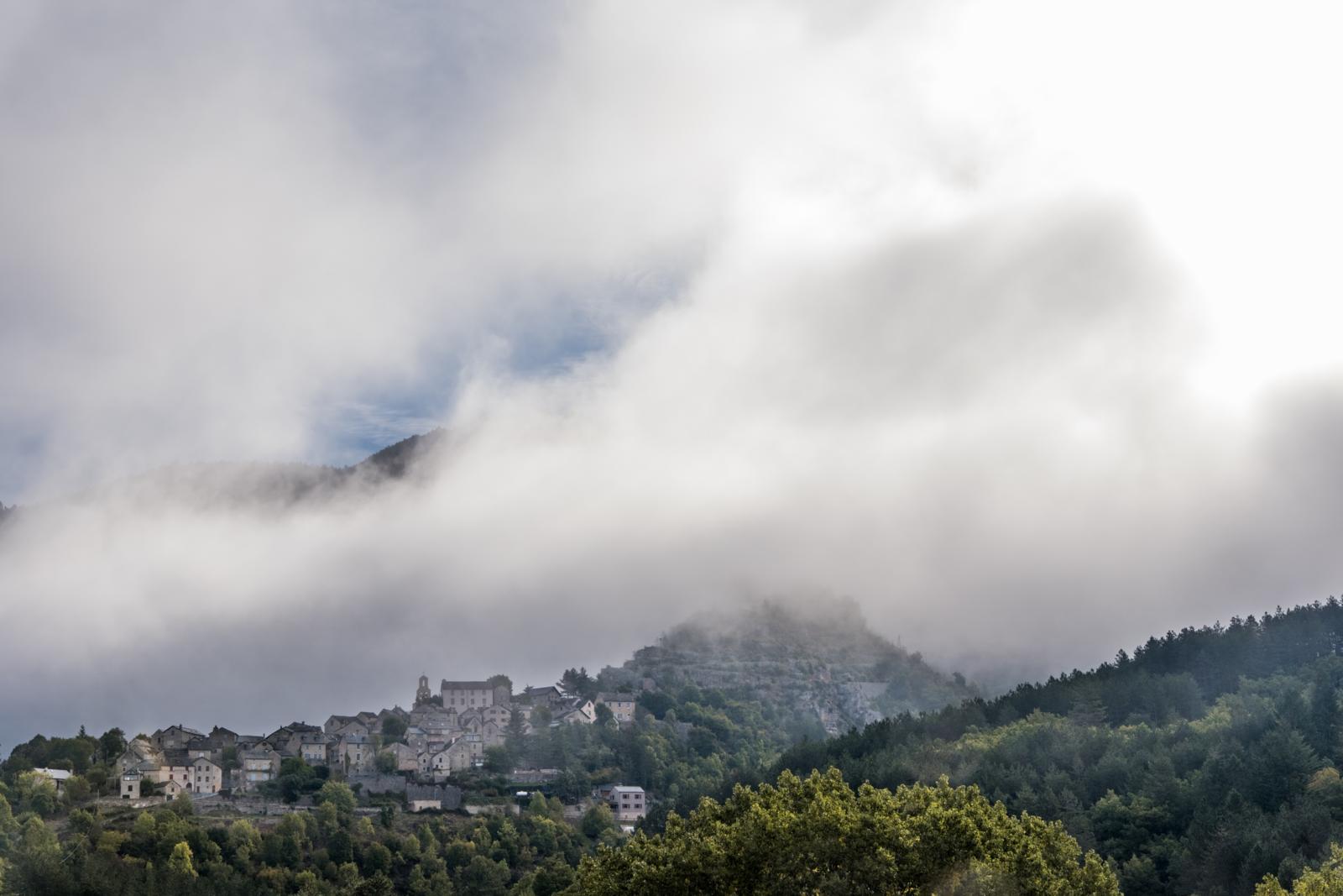 Spelen met het terrein, zoals de wolken spelen met mij. Ze klimmen en dalen, waaien horizontaal voorbij, openen zich plots voor een beetje zonlicht dat meteen het dorp Montbrun in de schijnwerpers plaatst. De grijze wereld krijgt bovendien steeds meer kleur. De grauwe rotswanden blijken allerlei schakeringen bruin in zich te hebben, het water beneden is groenblauw in plaats van zwart.