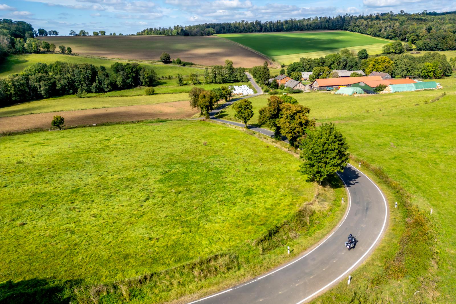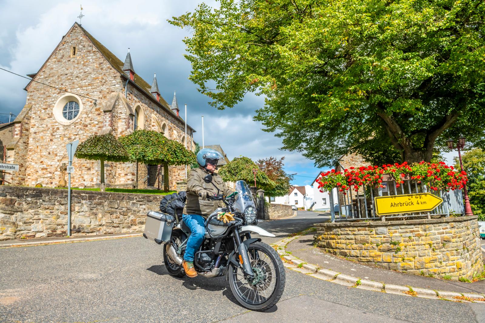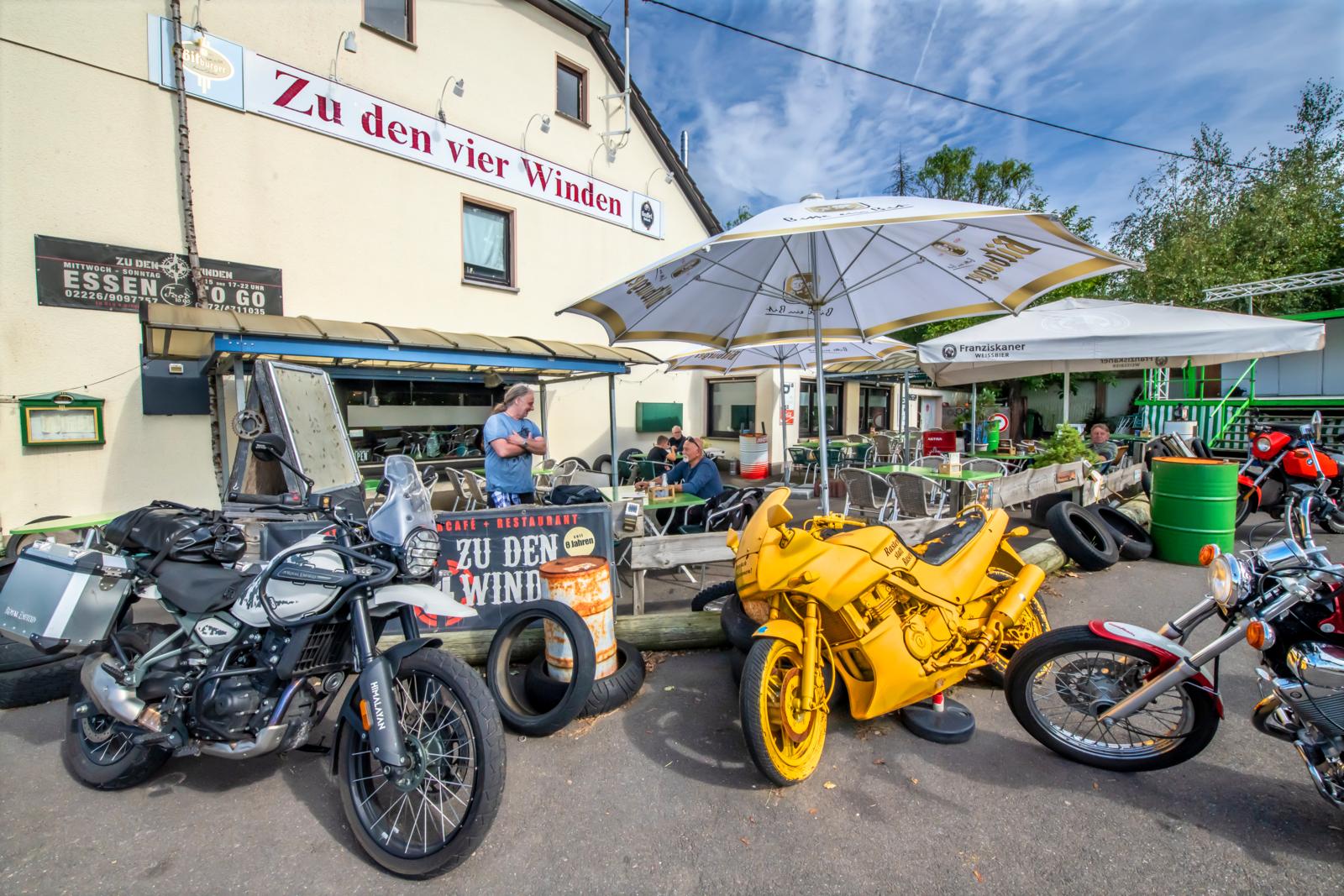 Ja, de Eifel. Een eldorado voor laagvliegers, maar zelfs met slechts 40 pk een garantie voor bochtige en plezierige momenten, zoals bij Binzenbach, Plittersdorf en Lind. Wanneer bliksemslagen niet van voren komen maar alleen van boven, vaak geïnterpreteerd als een teken van een machtige god, herinneren onderweg kleine kapellen en wegkruisen je daar steeds weer aan. Koffiestop op de kruising van L119 en L210 in Rheinbach-Kurtenberg. ‘Rasten statt Rasen’ staat op de afgeleefde Kawa GPZ500, een opvallende eyecatcher voor het Biker Café Zu den vier Winden. Moge de iconische kroeg en zijn toegewijde eigenaar een eeuwig leven beschoren zijn. Want als de grijzende Bernd Dziejak stopt, wordt het pand radicaal omgebouwd – woonruimte in plaats van ruimte voor motoren – en waarschijnlijk zullen hier ook geen bruiloften en rockconcerten meer plaatsvinden. Als triest voorbeeld van de gevolgen van de zogenaamde hogere macht staat aan de afslag van de B 257 naar het Kesselinger Tal het Café Ahrwind, ooit een populaire motorontmoetingsplaats, tot het game over was door de verwoestende overstromingen van de Ahr in 2021.