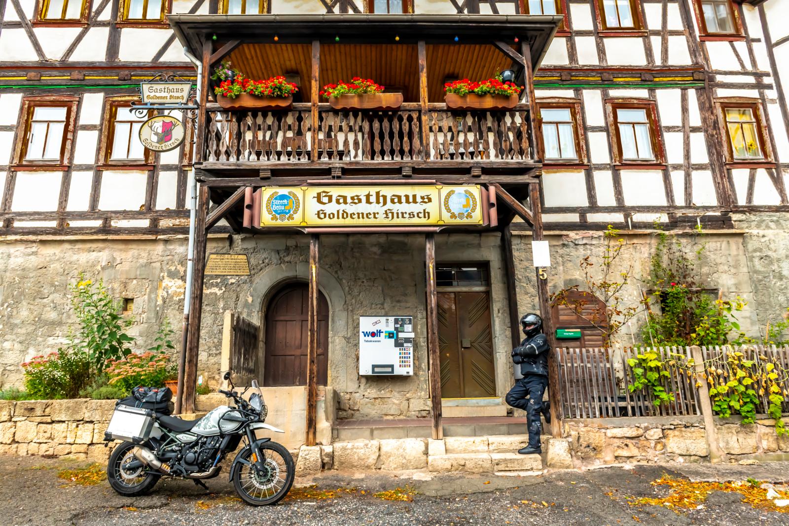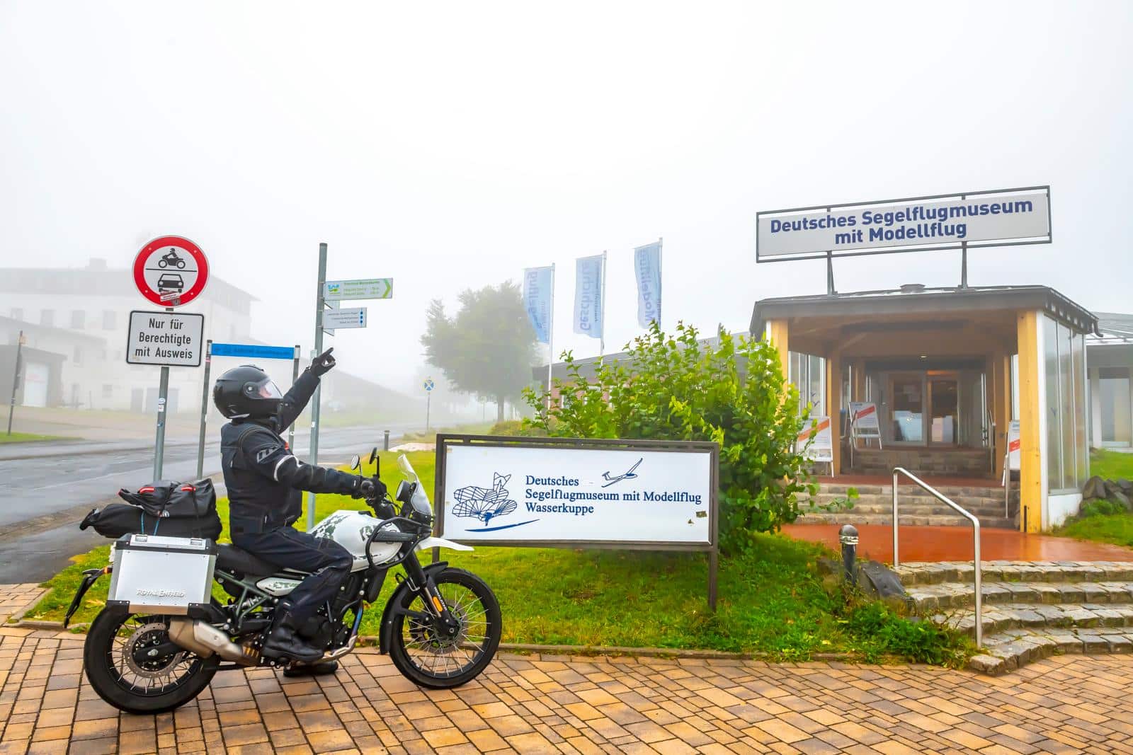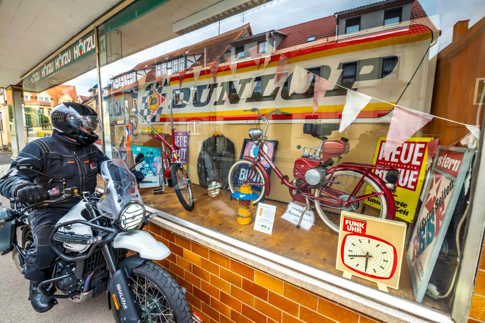 We wisselen van motor en Hermann is dolblij met de Himalayan. We rijden nu niet naar de Radom, het markante radargebouw uit de Koude Oorlog, en ook niet naar het vliegersmonument, de heroïsche stenen piramide met een adelaar bovenop. In plaats daarvan racen we over het traject van de Hauenstein-bergrace van Hausen naar het Schwarzen Moor. In het mooie vakwerkstadje Fladungen staan we stil bij een nostalgisch aangeklede, kleurrijke etalage, waarin een snelle zeepkist en een bijzondere Bianchi Aquiletta nu al reclame maken voor de volgende Fladungen Classics. Dat is een feestelijk event dat om de twee jaar plaatsvindt en waarin het hele dorp versierd is alsof de tijd in de jaren ’60 is blijven steken.