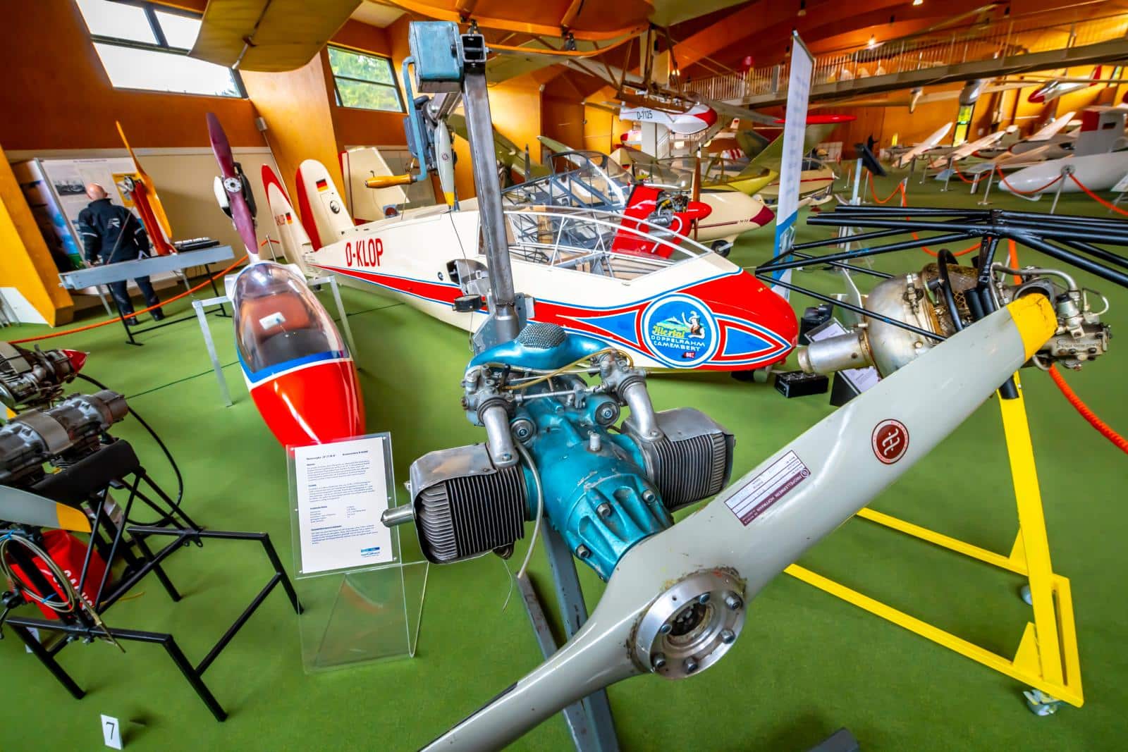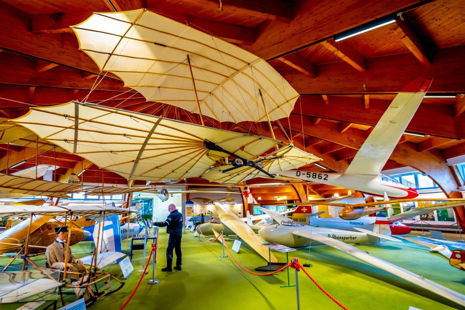 Ons lijstje telt nog drie andere te bezoeken locaties en daardoor zijn de aansluitende etappes nogal kort. In de fast forward-modus dan maar. Terwijl bij Hohenahr-Altenkirchen een paar windturbines ervoor zorgen dat energie uit de lucht wordt geoogst in plaats van uit de aarde, vullen we de verbrandingskamers op het Schottenring geheel tegen de tijdgeest in met benzine en werken we aan onze bochtentechniek. Of technische vooruitgang enorme heersers als Tyrannosaurus rex en co de wereld van zo’n 65 miljoen jaar geleden zou hebben geholpen te overleven? In ieder geval houden we een minuut stilte bij het uit metaal vervaardigde dinosaurus-skelet op een parkeerplaats bij de Hoherodskopf, het begin van een geowandelpad. Een perfecte landing volgt daarna op de Wasserkuppe in de Rhön, waar het Duitse zweefvliegmuseum uitnodigt voor een prachtige tijdreis. De expositie gaat van 1912, toen het de Darmstadter gymnasiast Hans Gutermuth lukte om met een van bamboestokken gebouwde dubbeldekker in een minuut en 50 seconden 840 meter ver te zweven op de Wasserkuppe, tot de huidige tijd met 280 km/u snelle high-performance kunststof zweefvliegtuigen. Die worden door Alexander Schleicher in het nabijgelegen Poppenhausen geproduceerd. In het museum is er ook een eenvoudige flightsimulator, waarin je de piloot kunt uithangen. Ja, ja, het spel met weer en thermiek, dat sinds eeuwen virtuoos wordt beheerst door vogels.
