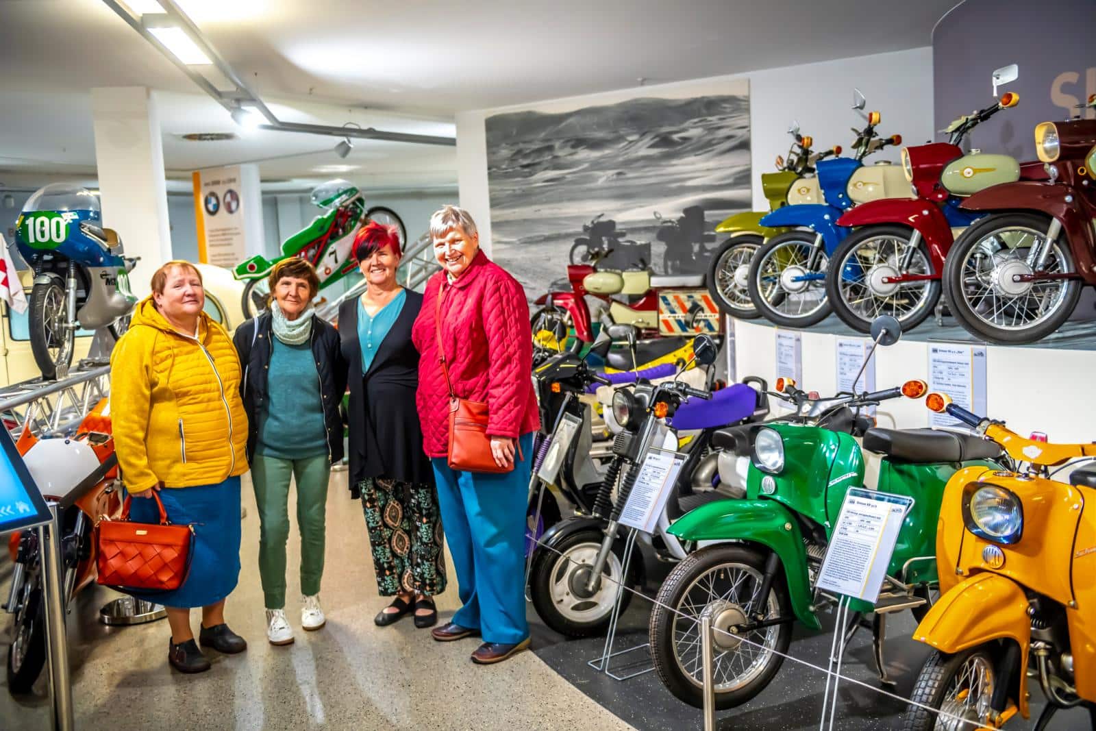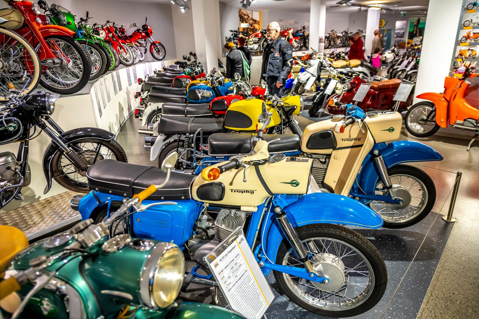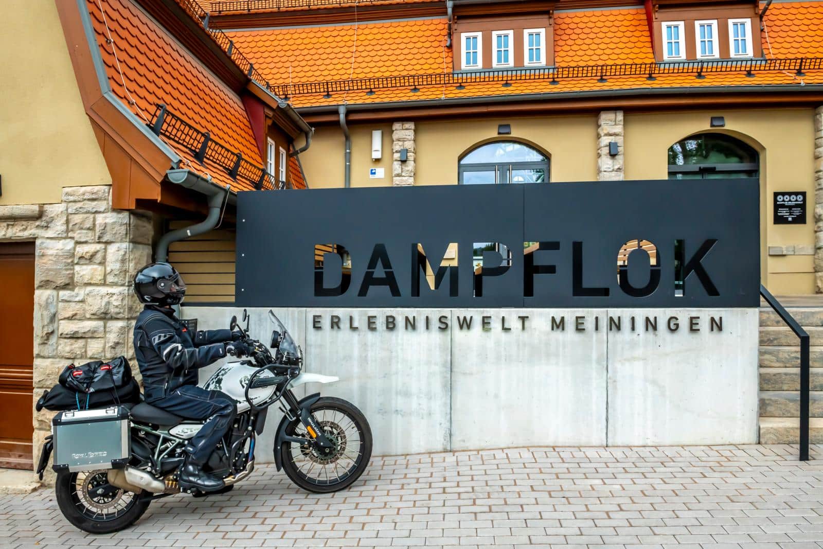 Weer een bochtige omweg, nu via Weimarschmieden, Geba en Stepfenshausen. We gaan verder door de Rhön, het zogenaamde land van de open vergezichten, met schaars struikgewas en bomen, totdat we in Meiningen aankomen. ‘Vandaag ben ik voor het eerst als echte stoker onderweg,’ grijnst Hermann in het stuurhuis van goederenlocomotief 92 739. Voor hem, en daarom valt de omschakeling van racegeoriënteerde stoker hem niet zo zwaar, een hele reeks witte klokken, zoals ze ooit de analoge cockpits van Ducati en Moto Guzzi sierden. We staan dus in de wereld van Dampflok Erlebniswelt in Meininger, waar aan de hand van de 92 739, de enige nog originele loc hier, die aan één kant is opengesneden zodat de werking van zulke rookspuwende kolossen kan worden uitgelegd. Gelijk naast de stoomlocomotieffabriek Meiningen, hét adres voor onderhoud en restauratie van historische spoorvoertuigen, kun je in de zomer elke zaterdag vanaf 10 uur een fabrieksrondleiding maken. Dagelijks geopend is ook het amusements- en natuurpark Thüringer Wald. Dillstädt, Bischofrod, Hirschbach – daar juichen niet alleen de motoren door het walsen door de bochten. Nog enthousiaster zijn de liefhebbers van classics in Suhl, door een bezoek aan het lokale Fahrzeugmuseum. Een belangrijk onderdeel van de uitgebreide tentoonstelling is de Vogelserie van Simson. En zo staan ze daar in hun kleurrijke blikken outfits: Schwalbe, Spatz en Star evenals Sperber en Habicht, plus de sportievere S50. Meer dan vijf miljoen van deze flitsers heeft Simson tot de val van de Muur geproduceerd. Vooral de onverwoestbare Schwalbe is zeer geliefd en gewild, ook in het ‘Westen’. Een 350cc Norton Manx M40, 4-takt straatracer uit de jaren ’60, staat als een paradijsvogel te midden van al het Oost-Duitse gerief. De Engelse motor werd gerestaureerd door de voormalige Simson-racespecialist Harry Riese. Het is een prima voorbeeld van dat de in techniek geïnteresseerde mens graag verder kijkt dan zijn neus lang is, zelfs als dat over het Kanaal of zelfs helemaal uit de ruimte komt.
