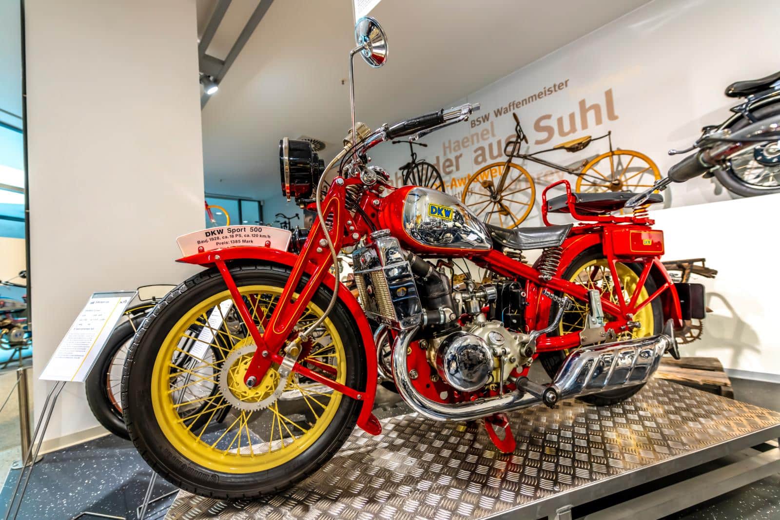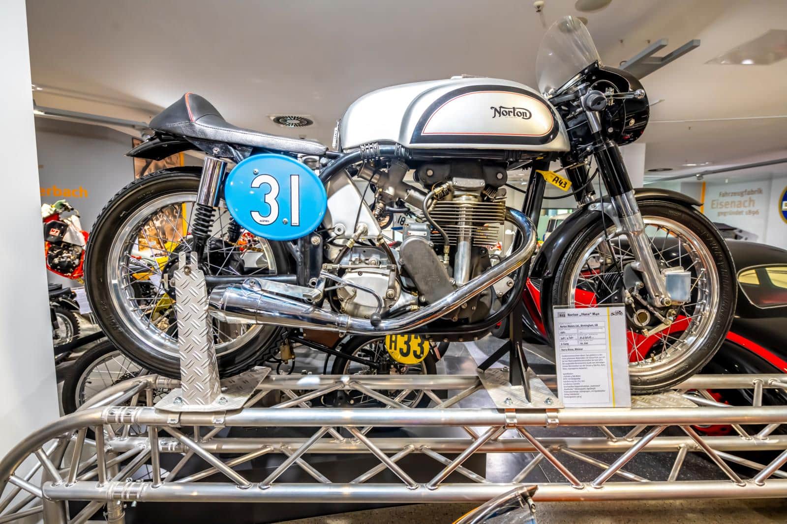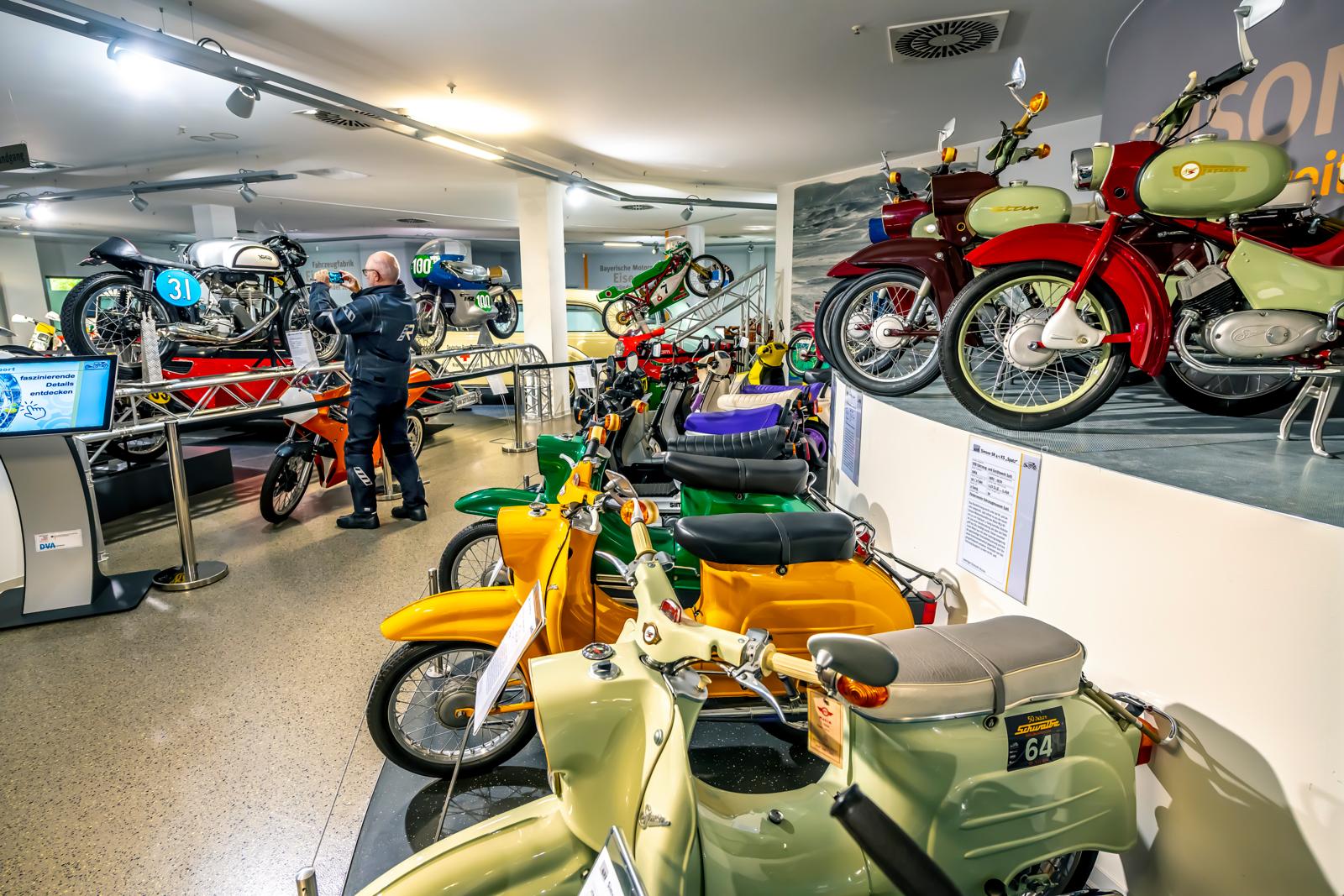 Weer een bochtige omweg, nu via Weimarschmieden, Geba en Stepfenshausen. We gaan verder door de Rhön, het zogenaamde land van de open vergezichten, met schaars struikgewas en bomen, totdat we in Meiningen aankomen. ‘Vandaag ben ik voor het eerst als echte stoker onderweg,’ grijnst Hermann in het stuurhuis van goederenlocomotief 92 739. Voor hem, en daarom valt de omschakeling van racegeoriënteerde stoker hem niet zo zwaar, een hele reeks witte klokken, zoals ze ooit de analoge cockpits van Ducati en Moto Guzzi sierden. We staan dus in de wereld van Dampflok Erlebniswelt in Meininger, waar aan de hand van de 92 739, de enige nog originele loc hier, die aan één kant is opengesneden zodat de werking van zulke rookspuwende kolossen kan worden uitgelegd. Gelijk naast de stoomlocomotieffabriek Meiningen, hét adres voor onderhoud en restauratie van historische spoorvoertuigen, kun je in de zomer elke zaterdag vanaf 10 uur een fabrieksrondleiding maken. Dagelijks geopend is ook het amusements- en natuurpark Thüringer Wald. Dillstädt, Bischofrod, Hirschbach – daar juichen niet alleen de motoren door het walsen door de bochten. Nog enthousiaster zijn de liefhebbers van classics in Suhl, door een bezoek aan het lokale Fahrzeugmuseum. Een belangrijk onderdeel van de uitgebreide tentoonstelling is de Vogelserie van Simson. En zo staan ze daar in hun kleurrijke blikken outfits: Schwalbe, Spatz en Star evenals Sperber en Habicht, plus de sportievere S50. Meer dan vijf miljoen van deze flitsers heeft Simson tot de val van de Muur geproduceerd. Vooral de onverwoestbare Schwalbe is zeer geliefd en gewild, ook in het ‘Westen’. Een 350cc Norton Manx M40, 4-takt straatracer uit de jaren ’60, staat als een paradijsvogel te midden van al het Oost-Duitse gerief. De Engelse motor werd gerestaureerd door de voormalige Simson-racespecialist Harry Riese. Het is een prima voorbeeld van dat de in techniek geïnteresseerde mens graag verder kijkt dan zijn neus lang is, zelfs als dat over het Kanaal of zelfs helemaal uit de ruimte komt.