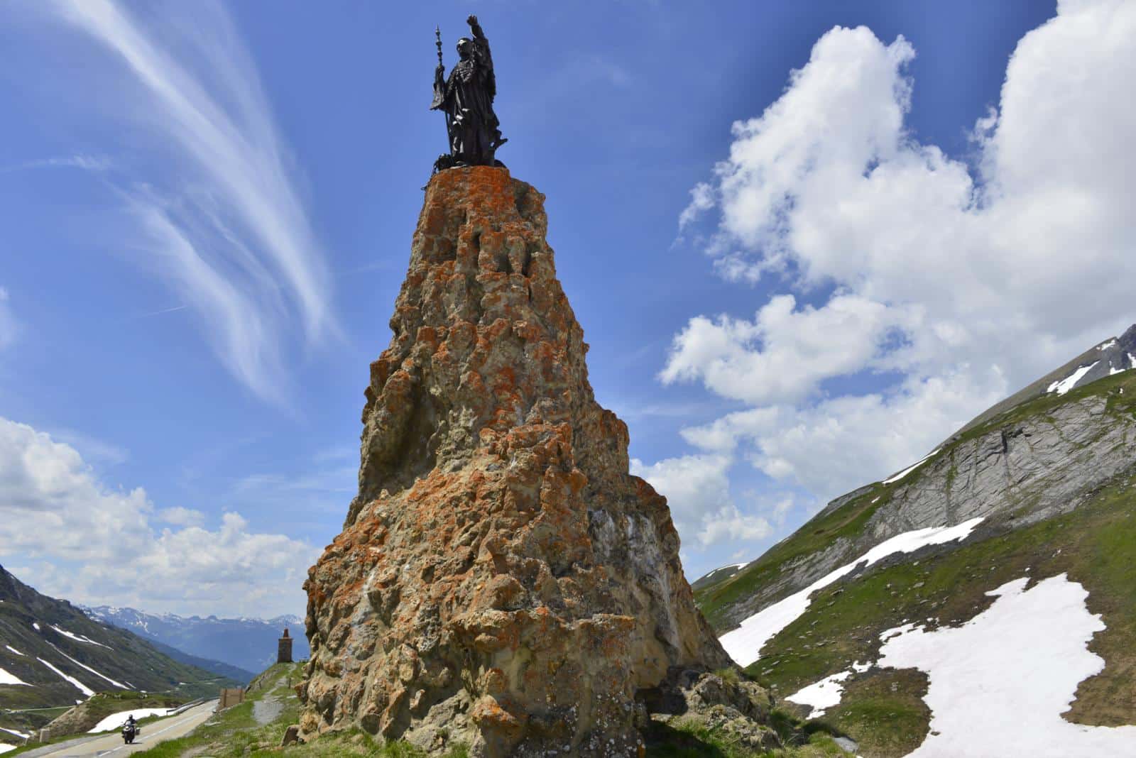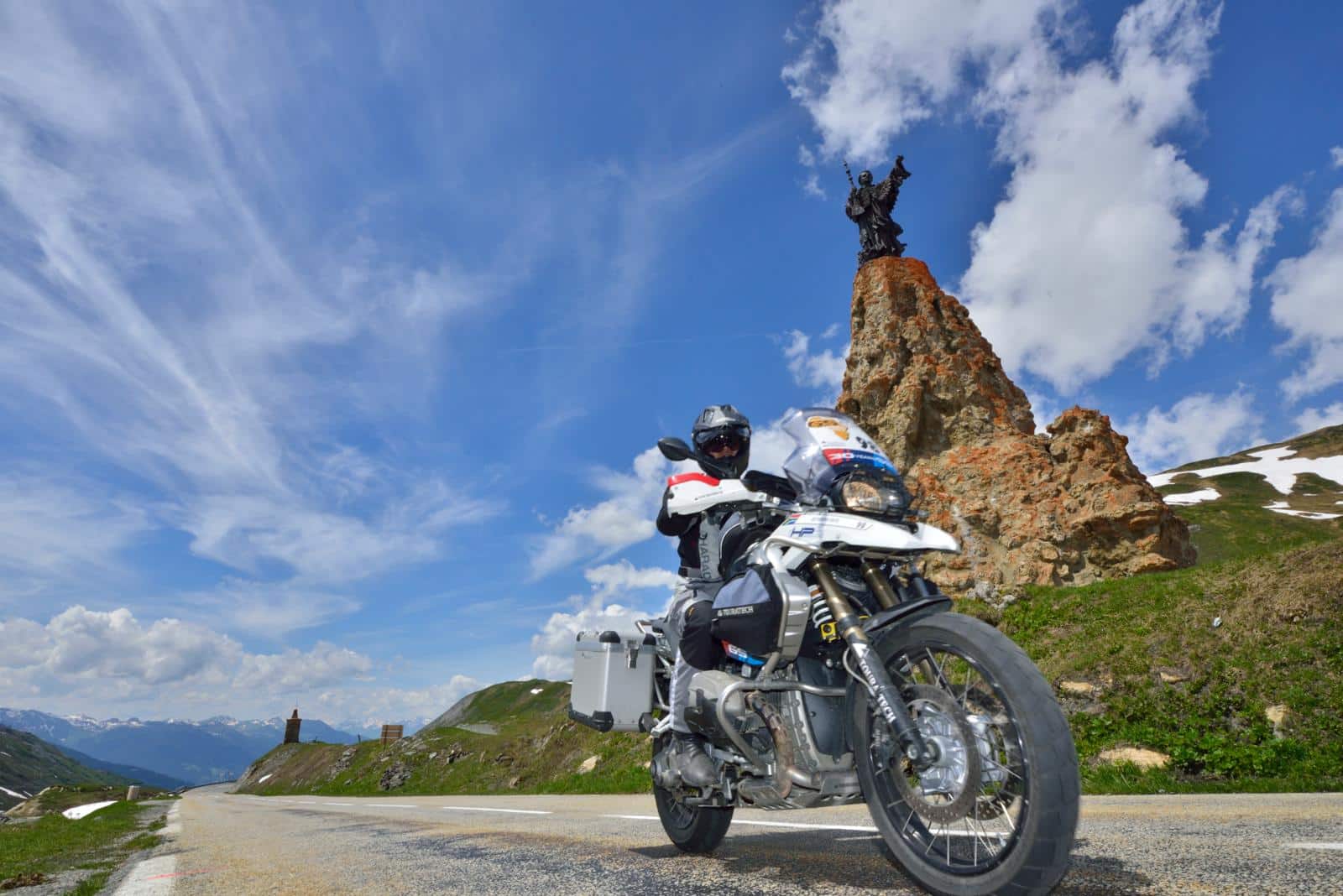 Bij de Arc de Triomphe in Parijs heb je de keuze uit de Champs-Élysées, Avenue de la Grande Armée en nog tien andere straten. Maar naar de Tour du Mont Blanc ga je met een routeschema dat slechts half zo complex is. Het avontuur begint in Bourg-Saint-Maurice, waar de D 1090 afbuigt naar de Col du Petit Saint-Bernard. Van 744 naar 2.188 meter, en in plaats van auto’s met spiegels zijn de bochten die je rijdt helemaal in de gloria. Haarspeldbochten te over, met asfalt van topkwaliteit. Af en toe zijn er wat opbrekingen door vorstschade, maar die strijkt de in het Zwarte Woud geoptimaliseerde GS met gemak glad. Even gas terug in het skigebied La Rosière: Wintersport? Nee, wij gaan liever verder en laten nog eens 300 hoogtemeters onder de banden rollen tot de pashoogte bij de Kleine Sint Bernard. Daarboven, als een politieagent op een verkeersplein, waakt de Heilige Bernard van Menthon, beschermheilige van de Alpenbewoners en bergbeklimmers op een monoliet. Zo hoog, zo goed, maar naast christelijke bescherming kan soms ook chemische bescherming welkom zijn. Zonnebrandcrème factor 20 kan in ieder geval geen kwaad als we het ons gezellig maken op het terras van de ‘topbar’. Terwijl we melk roeren in de koffie, knijpen we ook een tube zonnebrand uit.