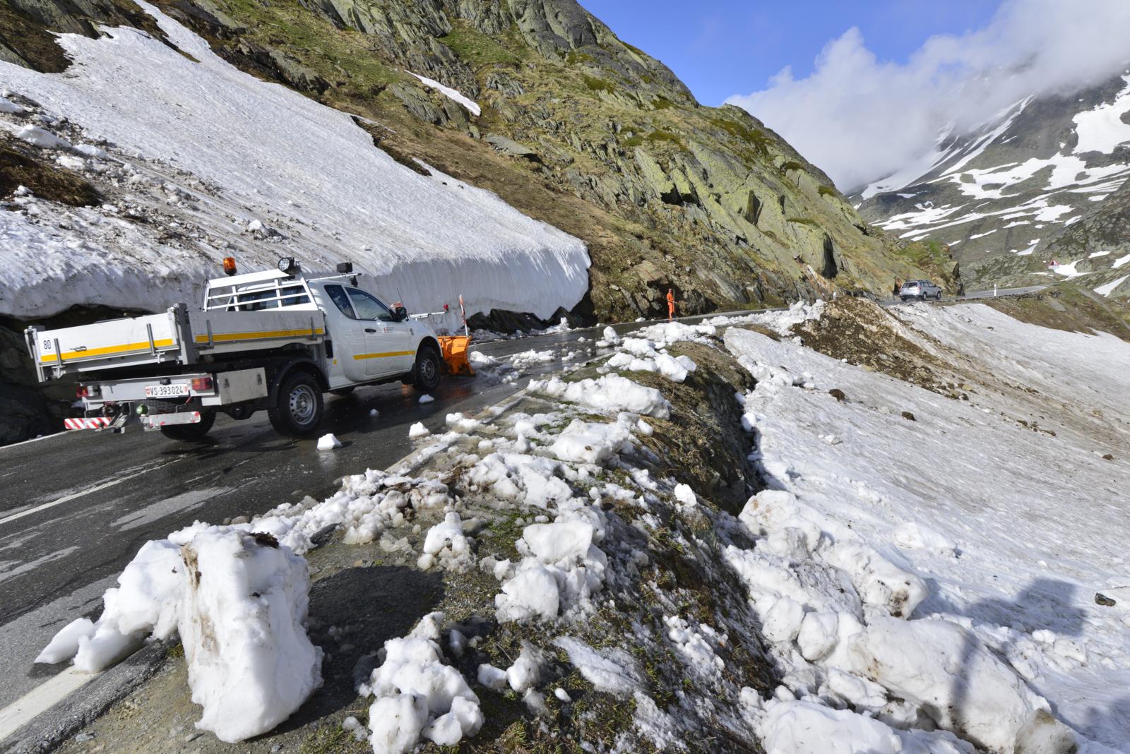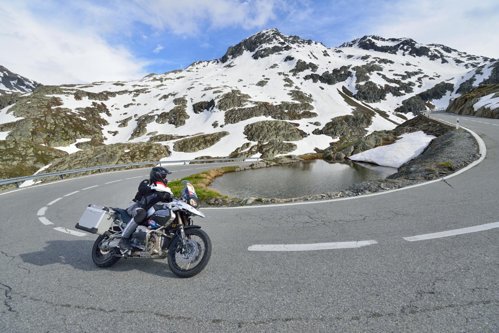 Maar voor een uitgebreide maaltijd is het nog te vroeg, dus rijden we verder, samen met die in de Alpen alom aanwezige soort die van het ras boxer afkomstig is. Het is gewoon bizar: je wacht in een fotobocht op ‘jouw’ GS – en pas nadat de foto is genomen, merk je dat je een andere hebt gefotografeerd. Zelfs stijlvolle alubakken zijn geen uniek kenmerk meer. Dat geldt ook voor de bijna prehistorische wegafbakening die menig tijdgenoot verder naar het oosten zou verwachten. Deze ‘grenssteentjes’ hebben de schattige uitstraling van muizentandjes; behoorlijk pittoresk, maar eerder ongebruikelijk voor het veiligheidsbewuste Zwitserland, dat op de noordelijke helling van Gran San Bernardo begint. Maar wat maakt het uit? Bij Tom en Jerry loopt het ook altijd goed af.