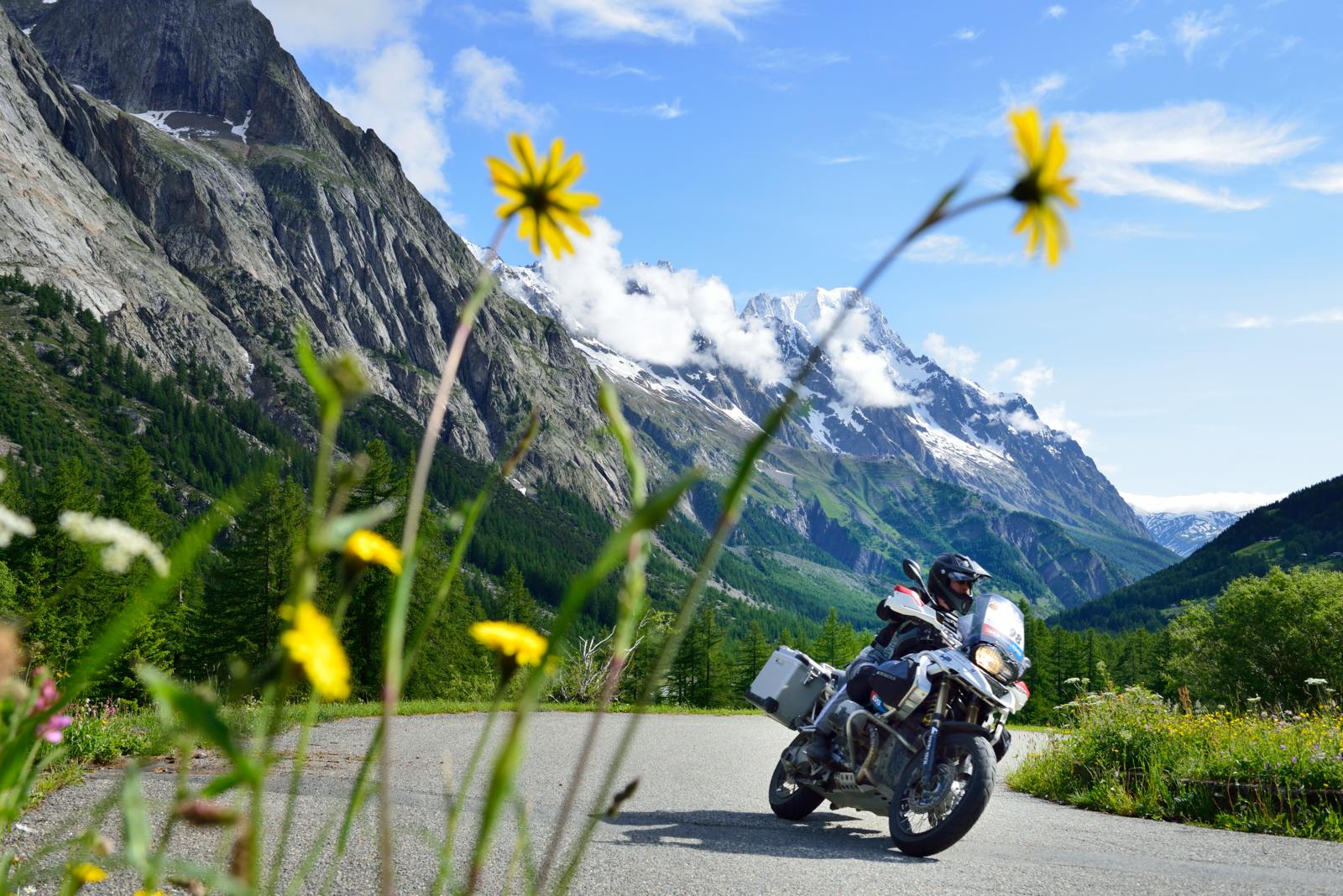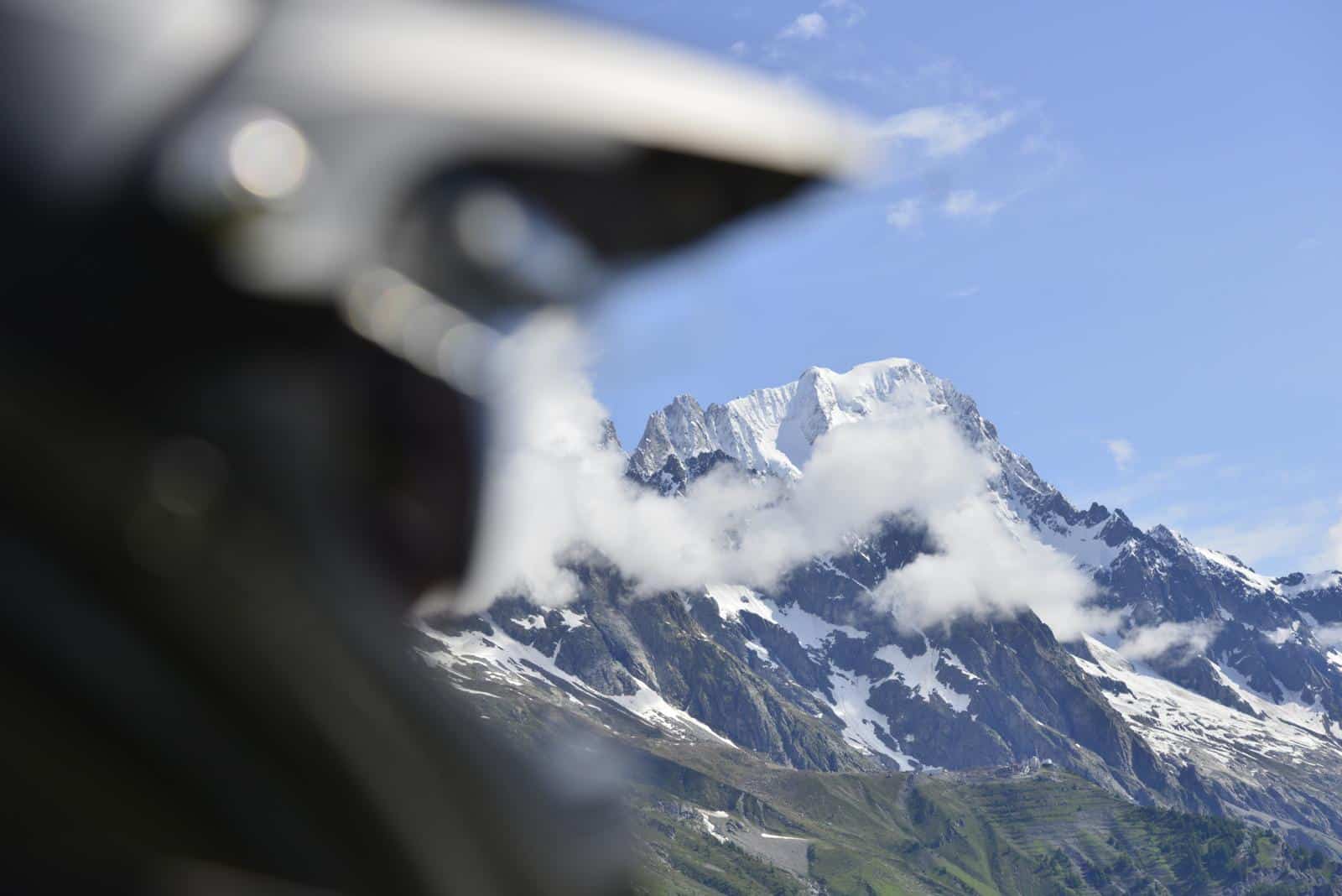 De 4.810 meter hoge Mont Blanc komt nu, na de Zwitsers-Franse grens bij Trient, steeds dichterbij. De top zelf doet dat natuurlijk niet, maar wij naderen dichterbij over zijn rotsachtige huid. Eerst hoppen we als konijntjes over de smalle en gehavende D 1506 naar Argentière, daarna strekken we onze nekken als zwanen: Welke van de majestueuze vierduizenders rond Chamonix mag zich de grootste eer toe-eigenen? De pieken dragen namelijk allemaal een witte kroon. Dat is nu eenmaal de prijs die vlakkelandbewoners betalen, die wel een flat twin van een parallel twin kunnen onderscheiden maar de toppen in de eeuwige sneeuw niet. Ter verdediging van onze eer moeten we wel opmerken dat al het prachtige ook omringd wordt door nevelflarden, waardoor zelfs het geoefende oog moeilijk de Mont Blanc kan identificeren. Gelukkig verhult de mist ook dat het landschap, ooit de bodem voor de winstgevende productie van Alpenmelk en kaas, is gezandstraald voor skipistes…