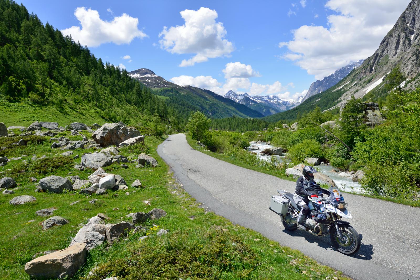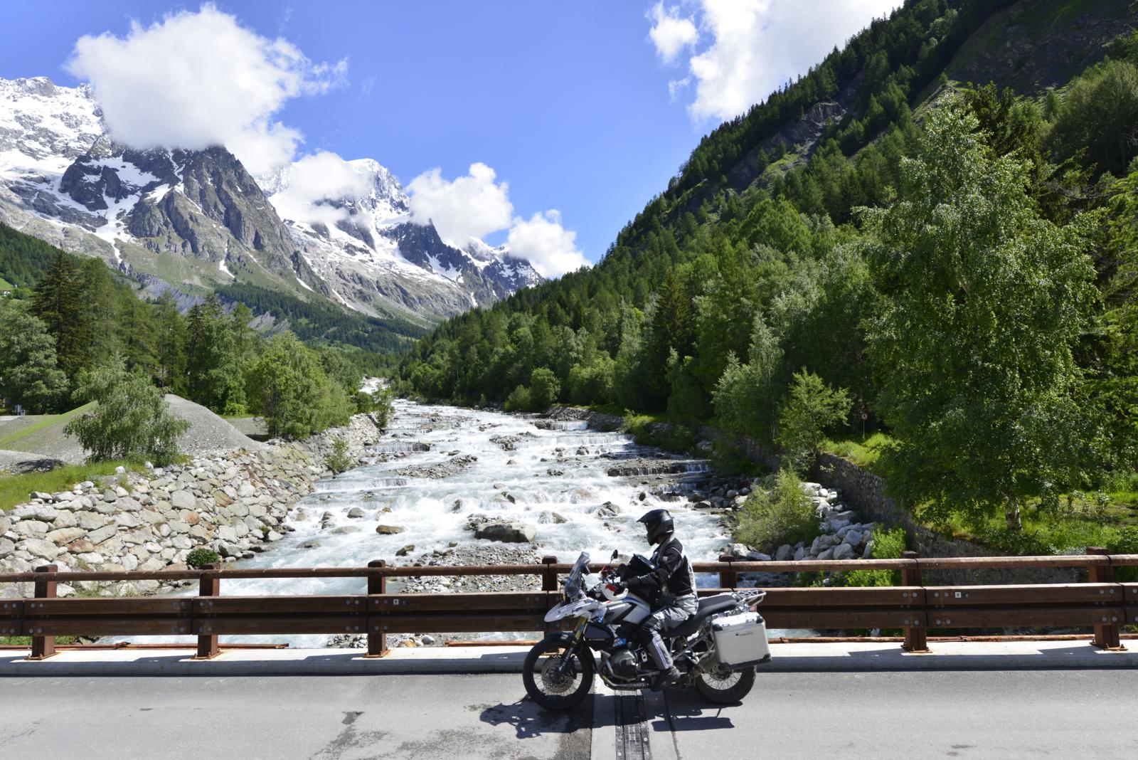 Een stevige picknick op de top ziet er vast anders uit dan wat wij na het intermezzo door de periferie van Chamonix en Saint-Gervais-les-Bains als proviand in een Intermarché bij Megève ophalen. Maar waar kunnen twee personen nu voor een slordige 10,04 euro overvloedig lunchen? Dagen geleden moesten we op de Izoard voor een stuk taart maar liefst vijfenzestig betalen. Genoeg met het letten op de kleintjes; de weg die we nog te gaan hebben is met rozen geplaveid. Op de Michelin-kaart springt meteen het groengele, kronkelige pad over de Cormet de Roselend in het oog. Maar rozen hebben af en toe ook water nodig en dat gebeurt precies vandaag. Vanwege het regenachtige zien we nauwelijks iets van de pas en van het maken van foto’s komt niets terecht. En zo sluit de cirkel zich na 501 kilometer weer in Bourg-Saint-Maurice, waar we gelijk starten voor een tweede ronde. Vanavond verstoppen we ons in Albergo Purtud aan de voet van de Mont Blanc, in het Italiaanse Val Veny. De hoogste berg van West -Europa wordt afhankelijk van het nationale perspectief aan Frankrijk en aan Italië toegewezen, waar ze de berg Monte Bianco noemen.